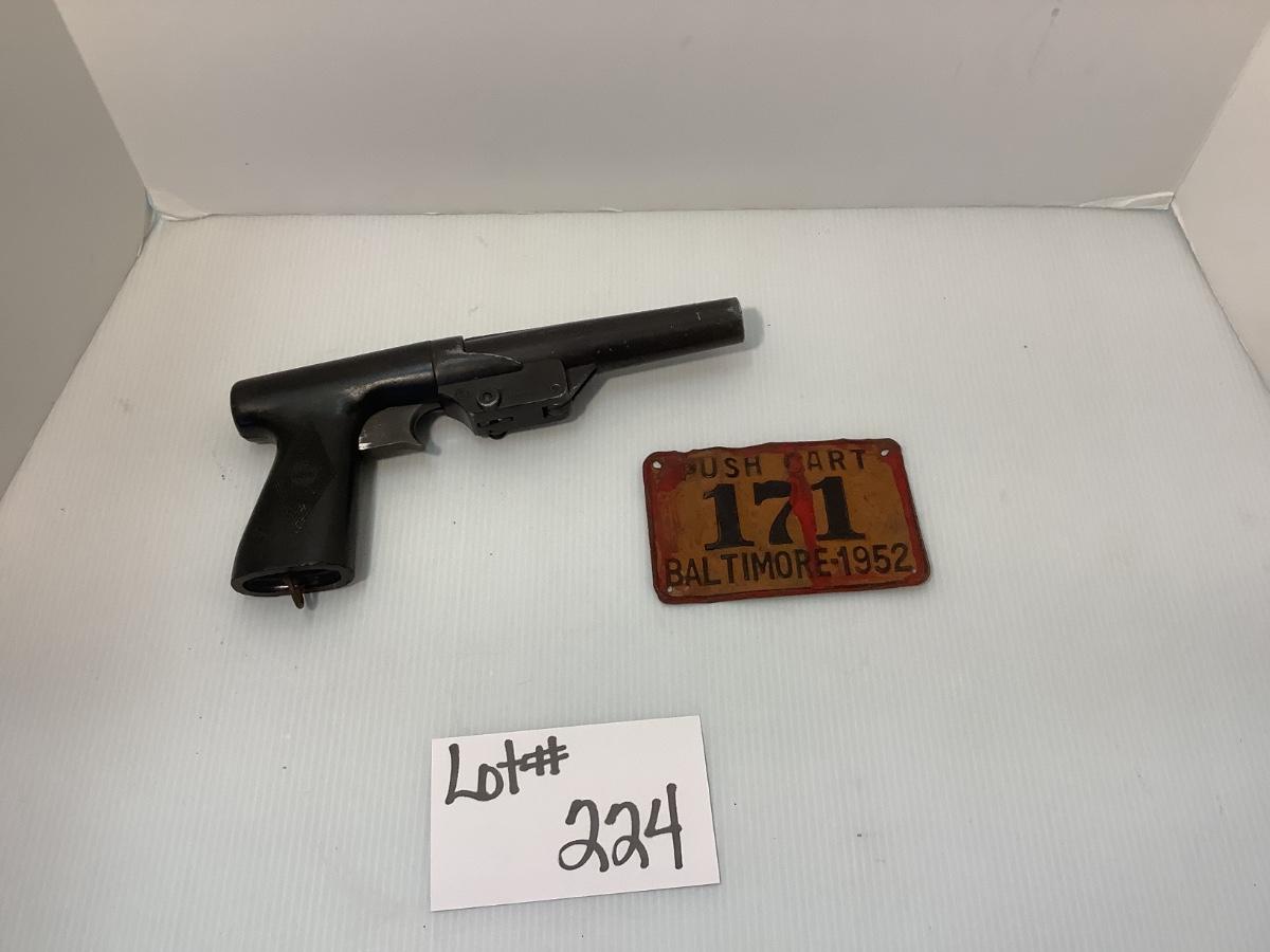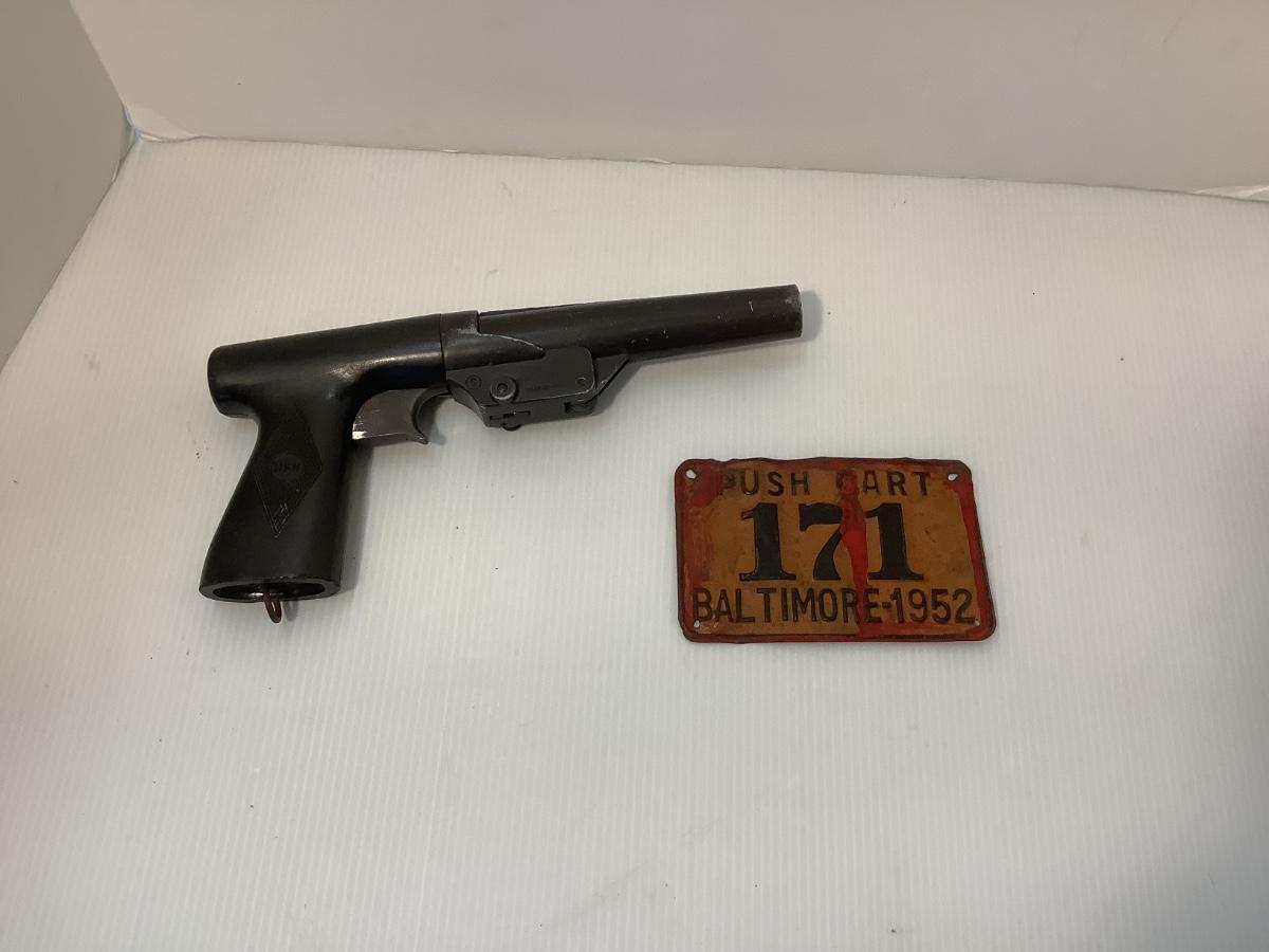 224. Antique Push Cart Plate “ 171 Baltimore-1952 “ & Antique R. F. Sedgley Inc ( USN ) Single Shot Flare Gun
