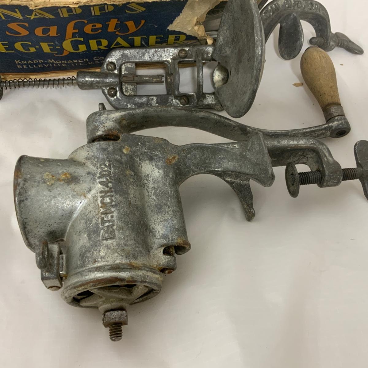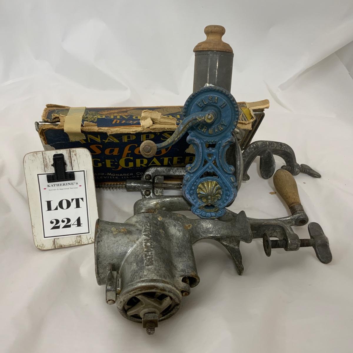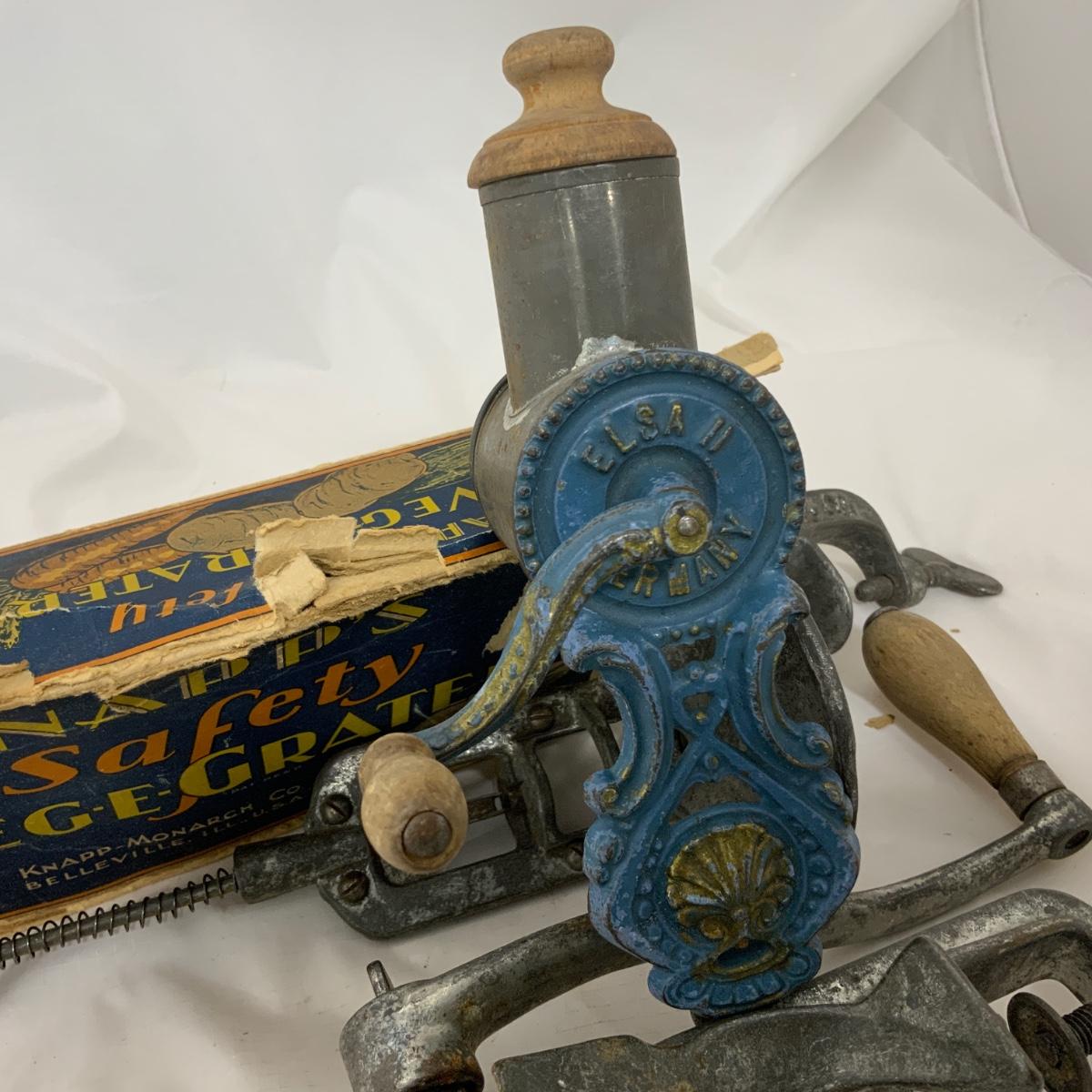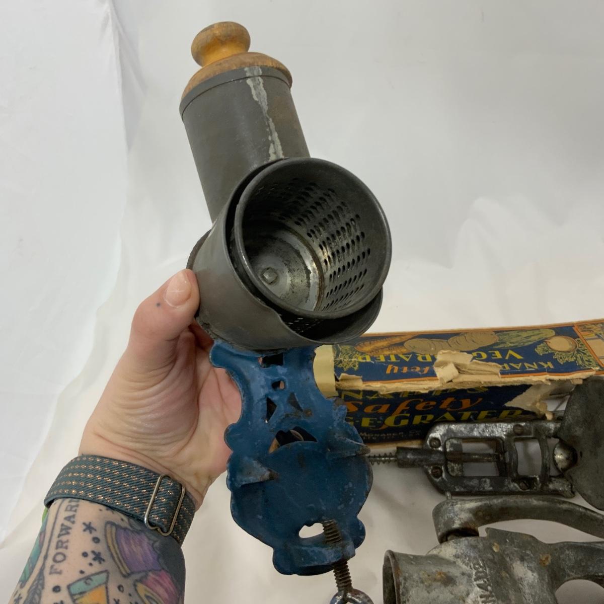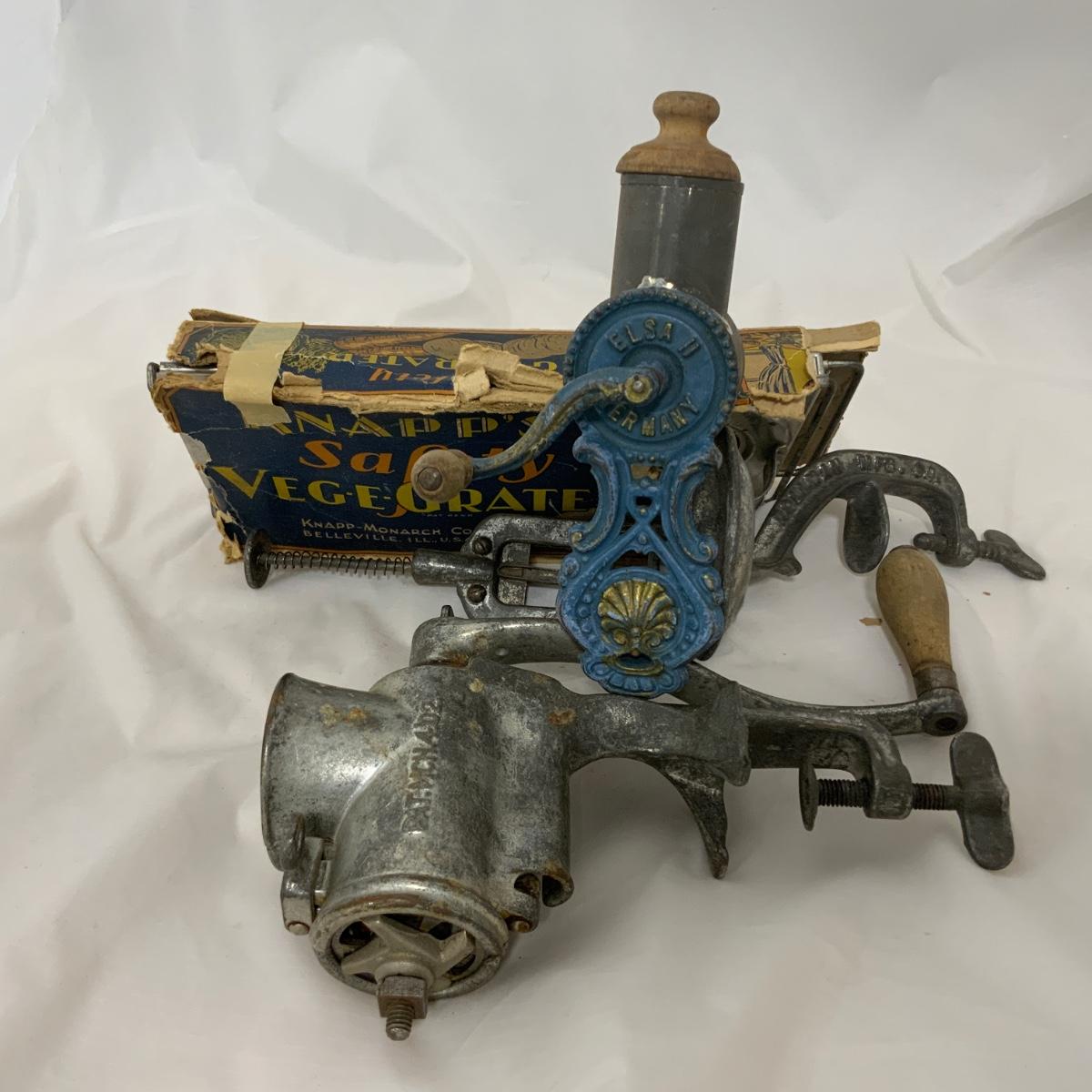 Cherry Pitter, Meat Grinder, Vegetable Grater, and nutmeg grinder. It’s exactly what it looks like. Please see photos for details and condition. ::: Shipping is NOT available on this lot. If you have any questions regarding this lot please contact the auctioneer either via this website, by direct email or by phone. PICK UP TIMES and other important information can be found in the TERMS and DESCRIPTION of the auction. Please take a look for pertinent information. Thanks!