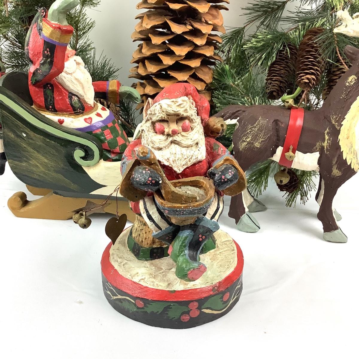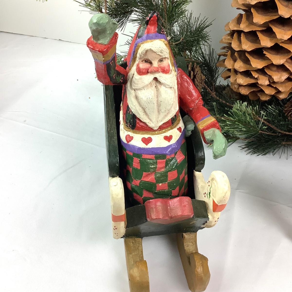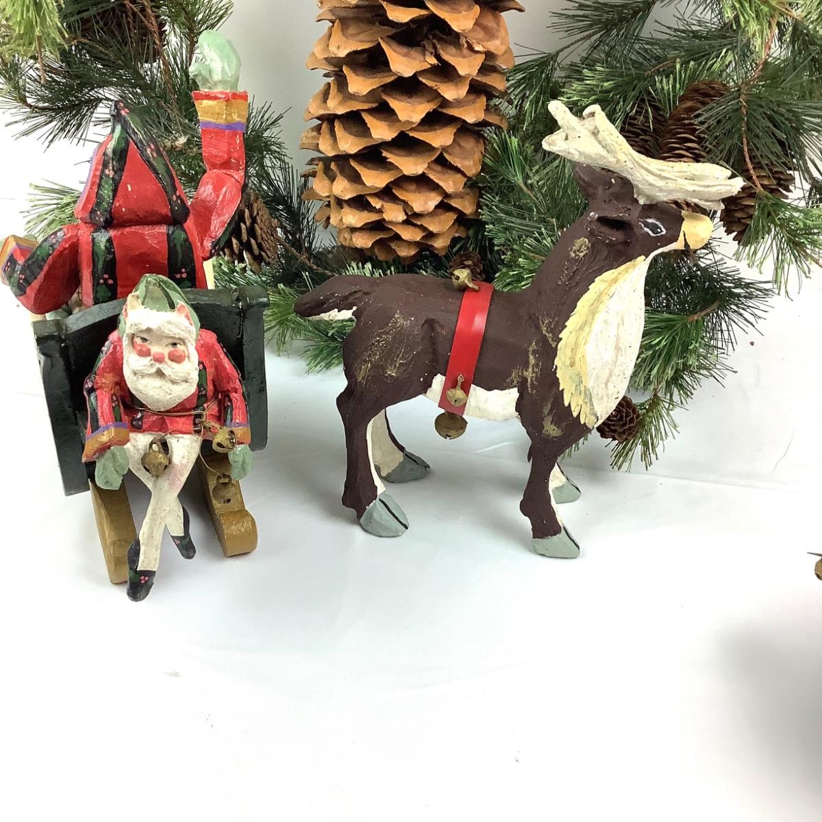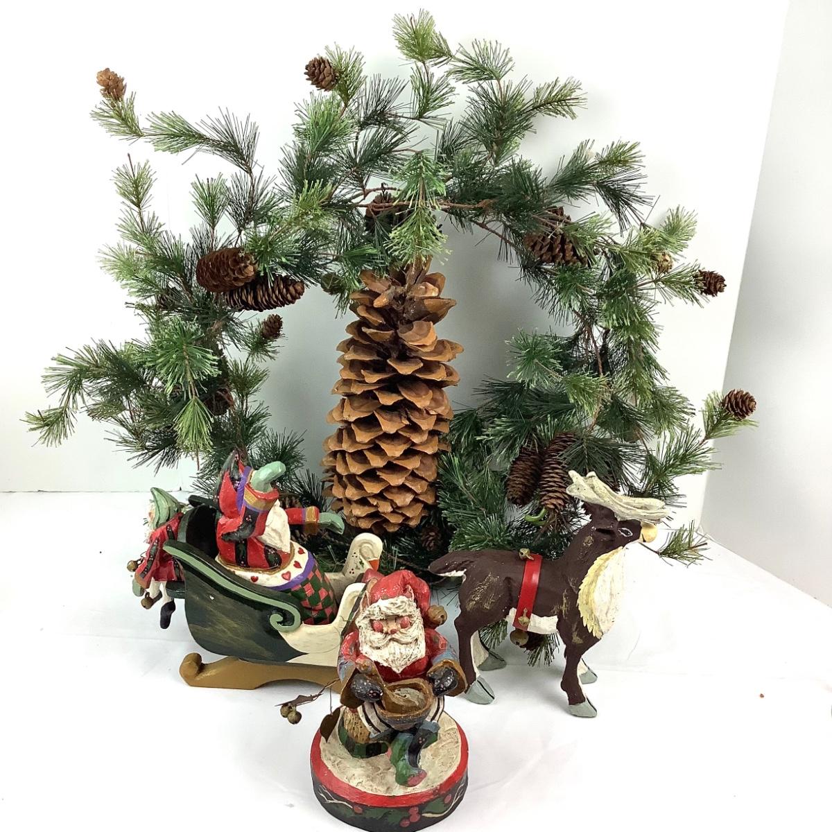 The lot contains pine garland, 12" pine cone and House of Hatten Santa figure (1992) Sled (1985) Deer (1989)