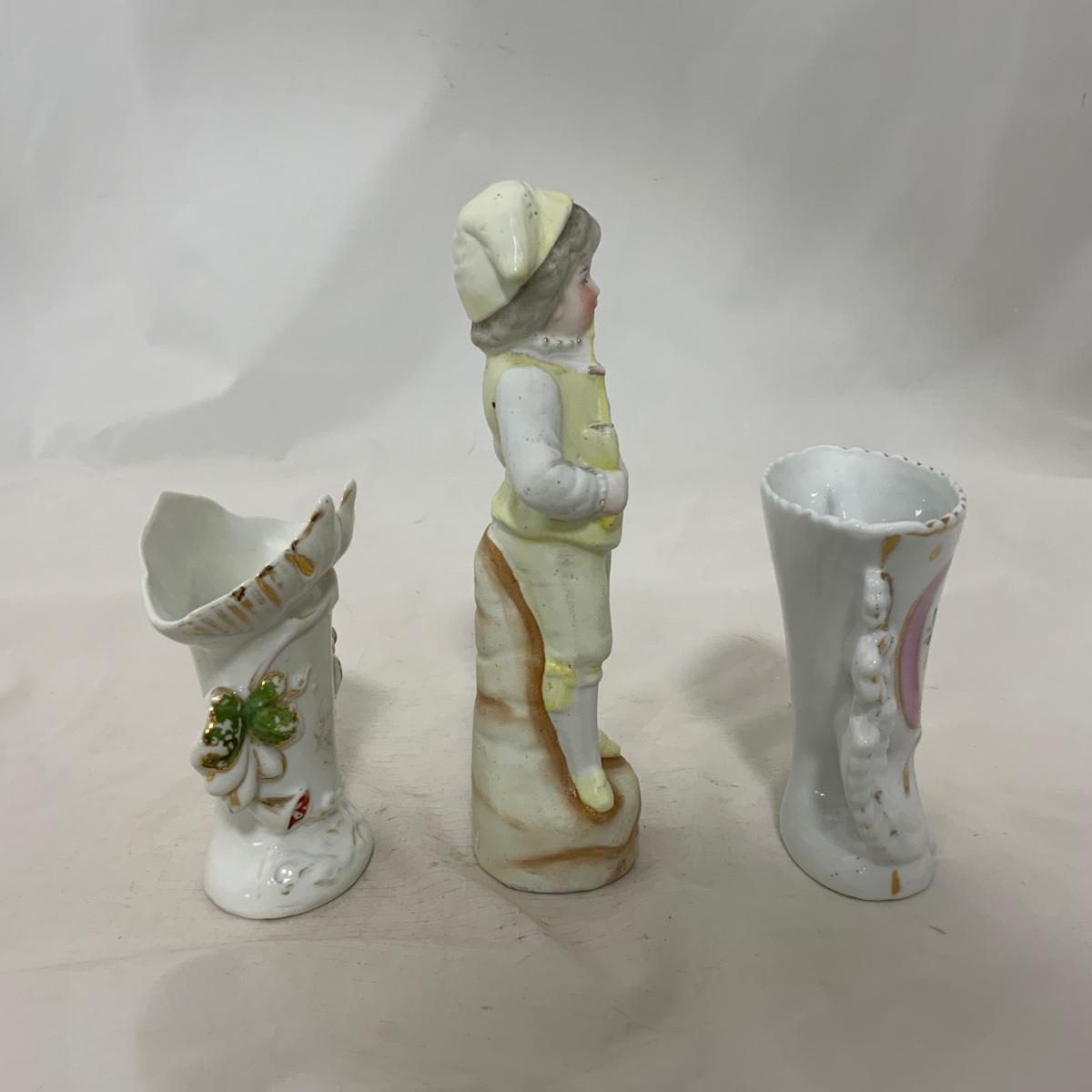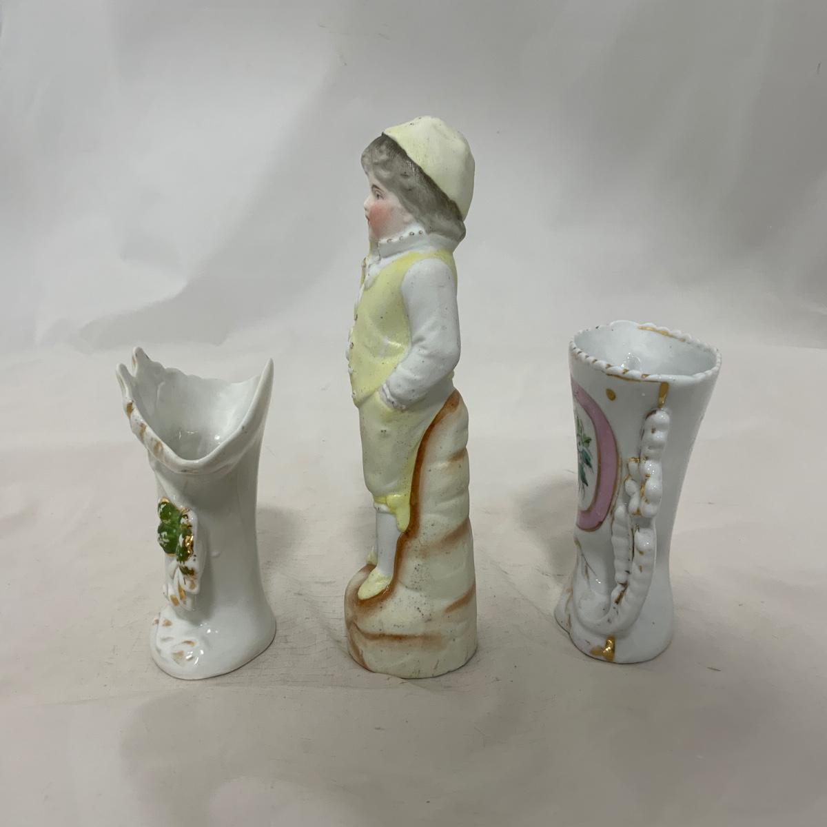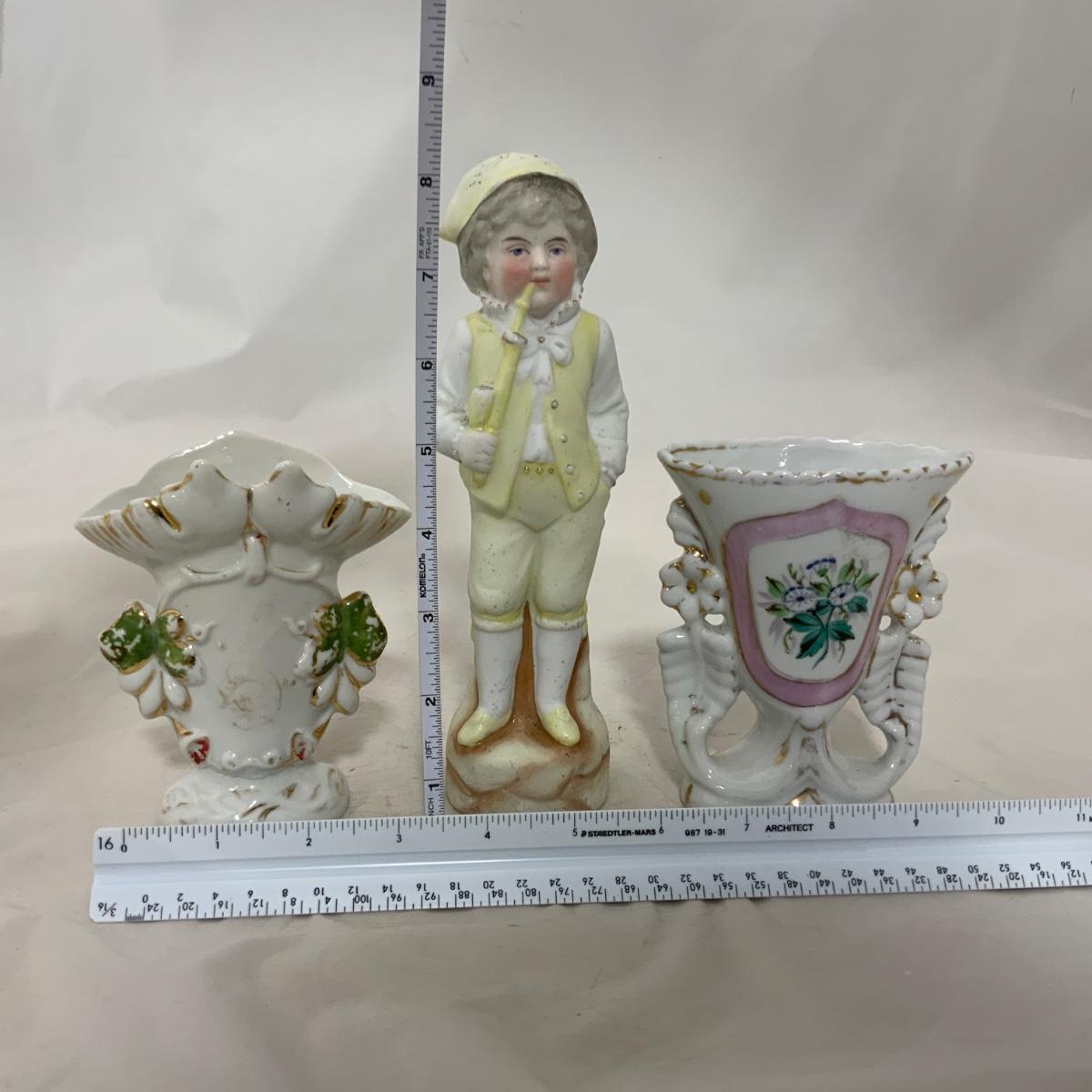 Attractive Bisque Boy smocking a pipe and two Cottage Vases, circa 1870. Please see photos for details and condition. ::: Shipping is available on this lot. If you require shipping you must let us know at the close of the auction. We will coordinate with you after the item has been won. Shipping fees will include insurance up to or exceeding the value of all items being mailed. If you have any questions regarding this lot please contact the auctioneer either via this website, by direct email or by phone. PICK UP TIMES and other important information can be found in the TERMS and DESCRIPTION of the auction. Please take a look for pertinent information. Thanks!