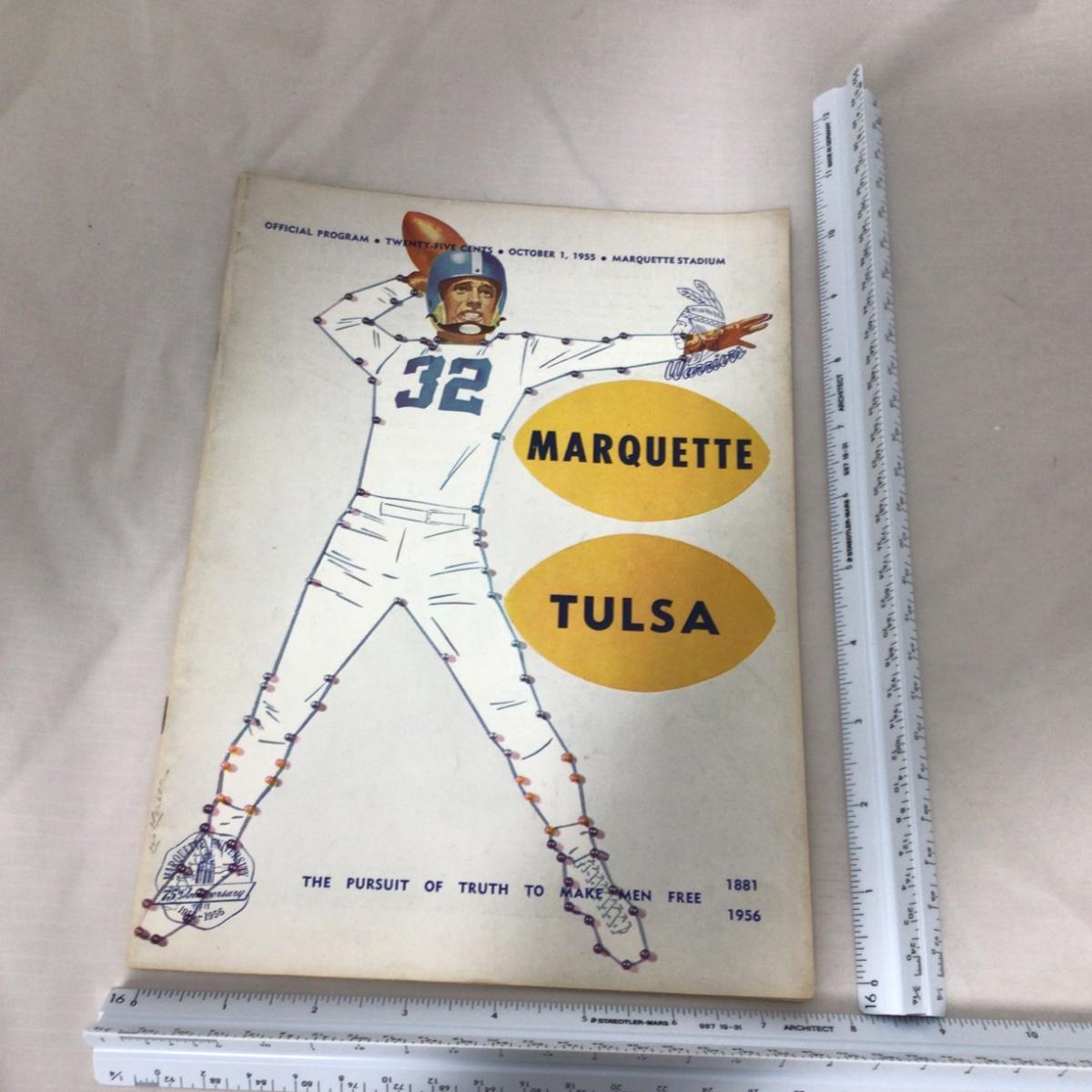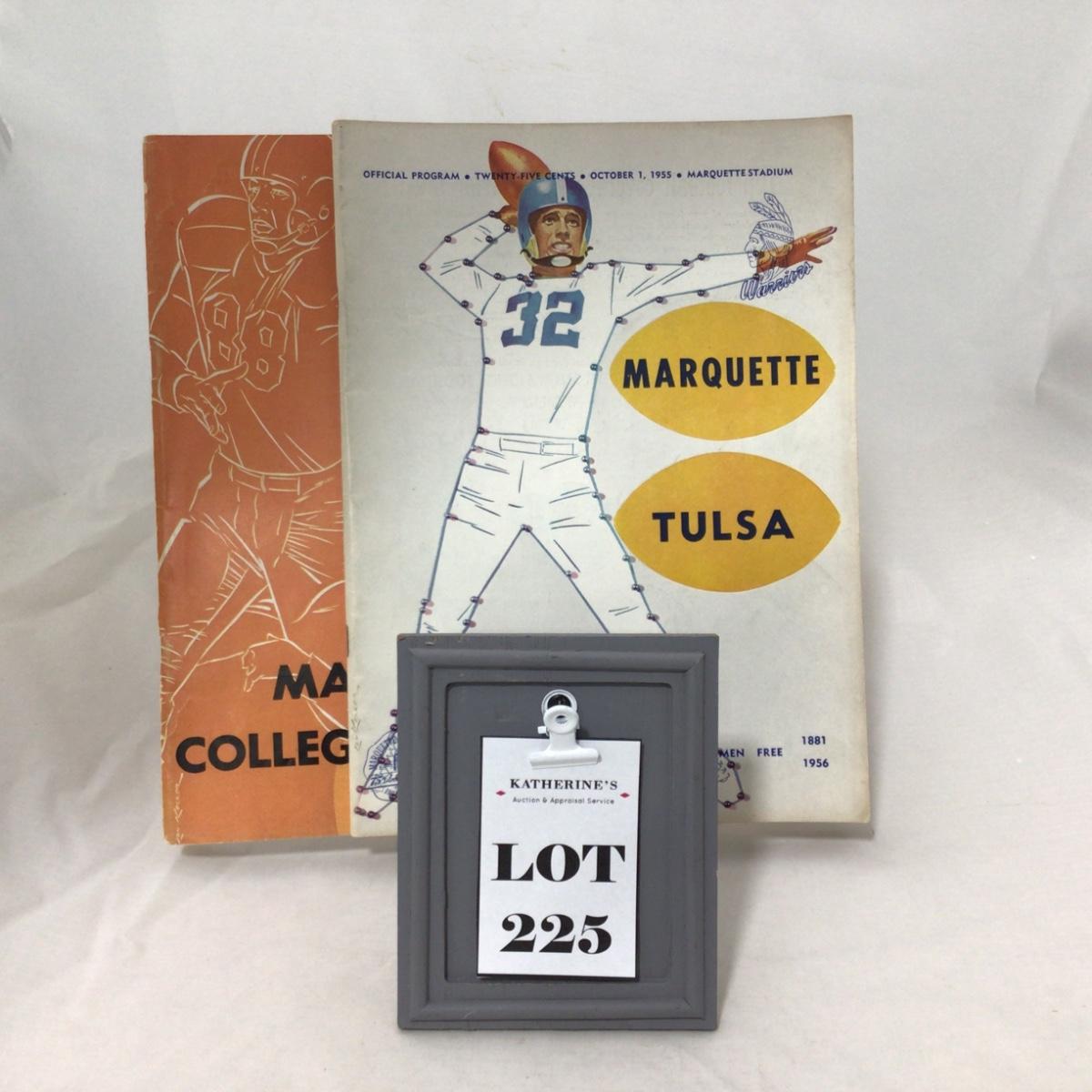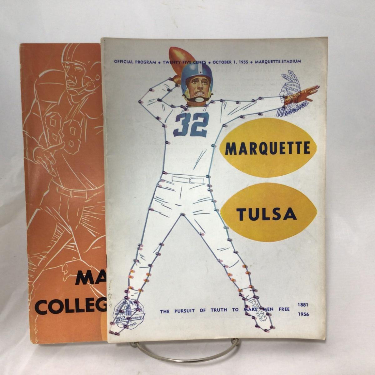 Two official Marquette football programs. One Marquette and Tulsa from Oct. 1, 1955 and one from Oct. 20, 1956. Please see photos for details and condition. ::: Shipping is available on this lot. If you require shipping you must let us know at the close of the auction. We will coordinate with you after the item has been won. Shipping fees will include insurance up to or exceeding the value of all items being mailed. If you have any questions regarding this lot please contact the auctioneer either via this website, by direct email or by phone. PICK UP TIMES and other important information can be found in the TERMS and DESCRIPTION of the auction. Please take a look for pertinent information. Thanks!