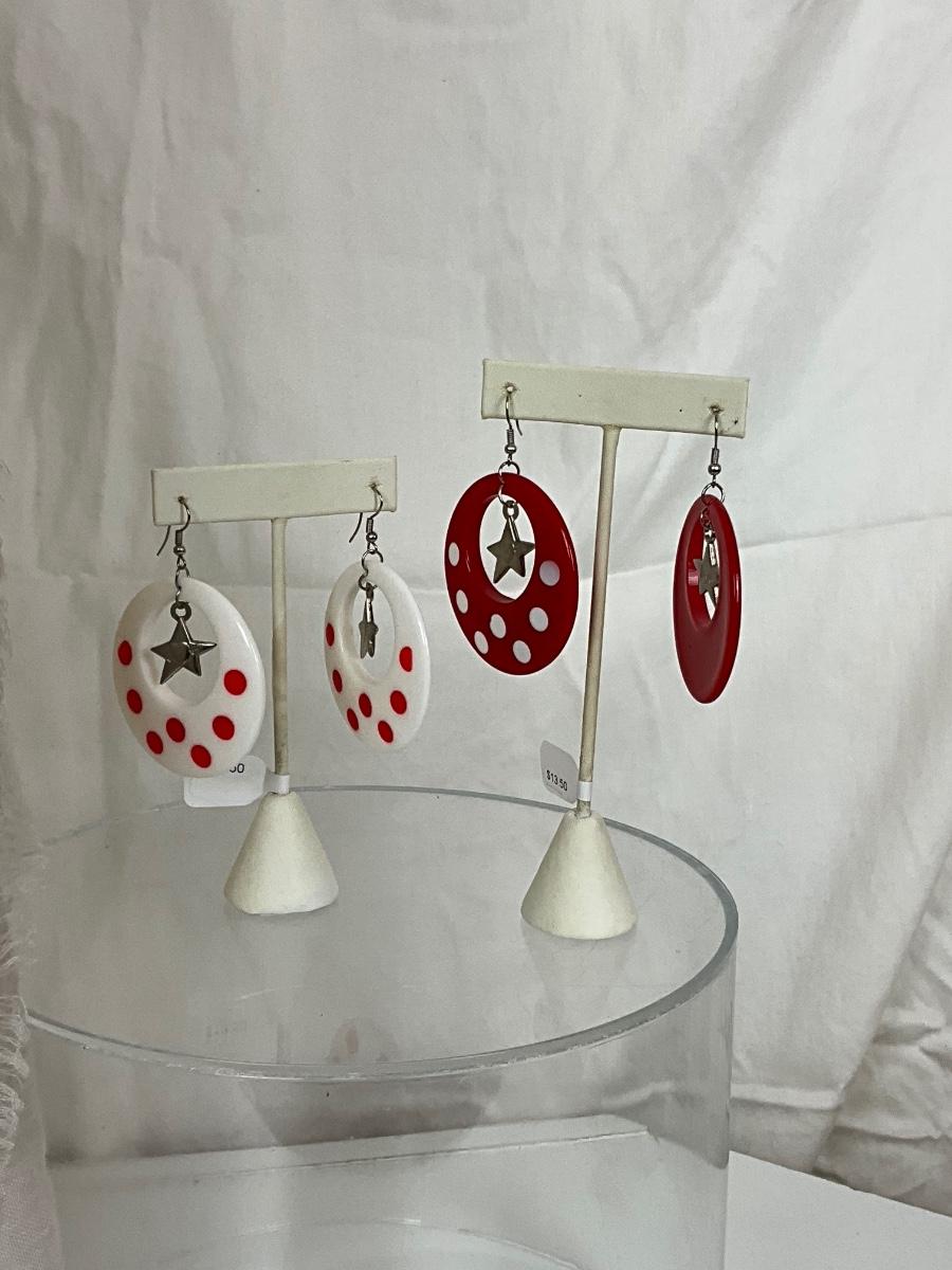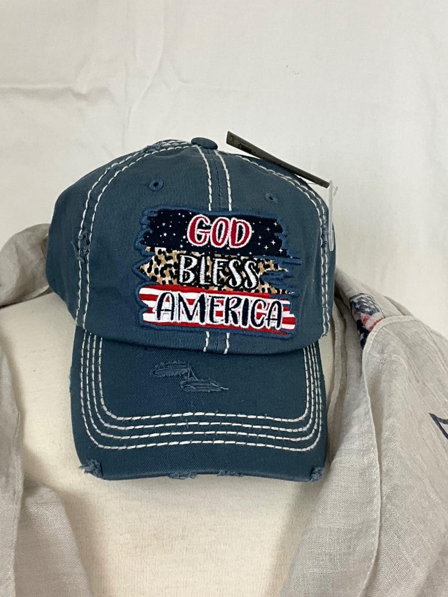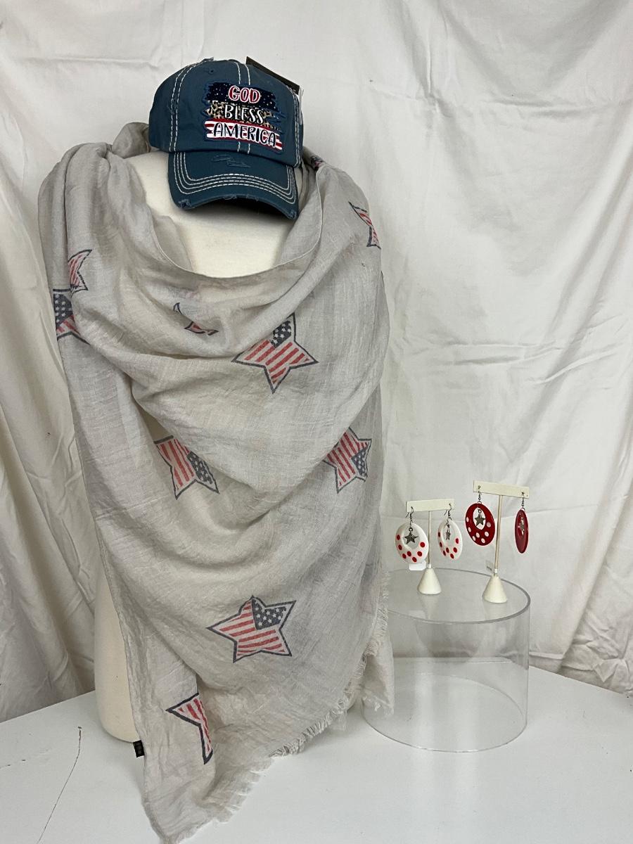 226 God Bless America Baseball Cap, Star Wrap/Shawl, Red and White Plastic Star Earrings