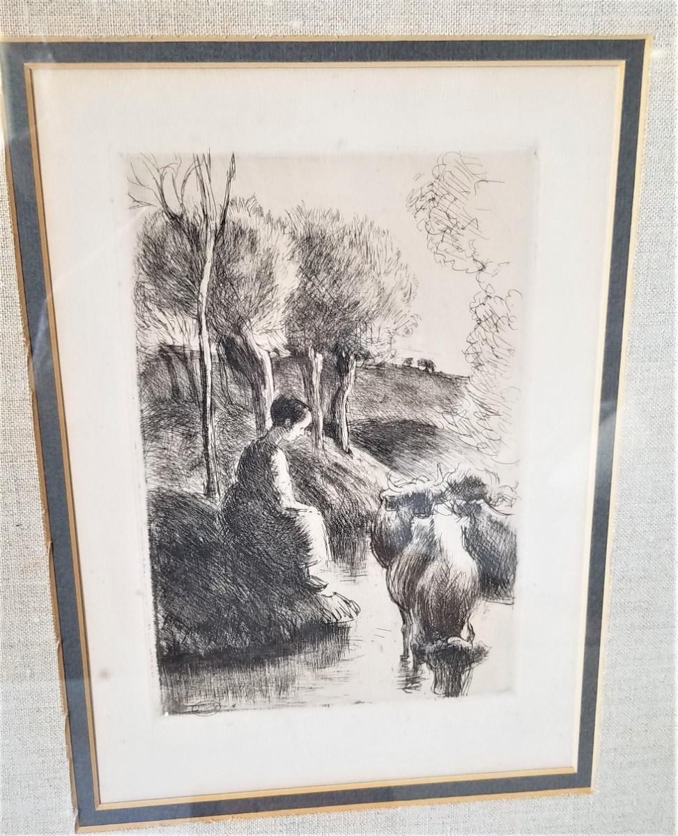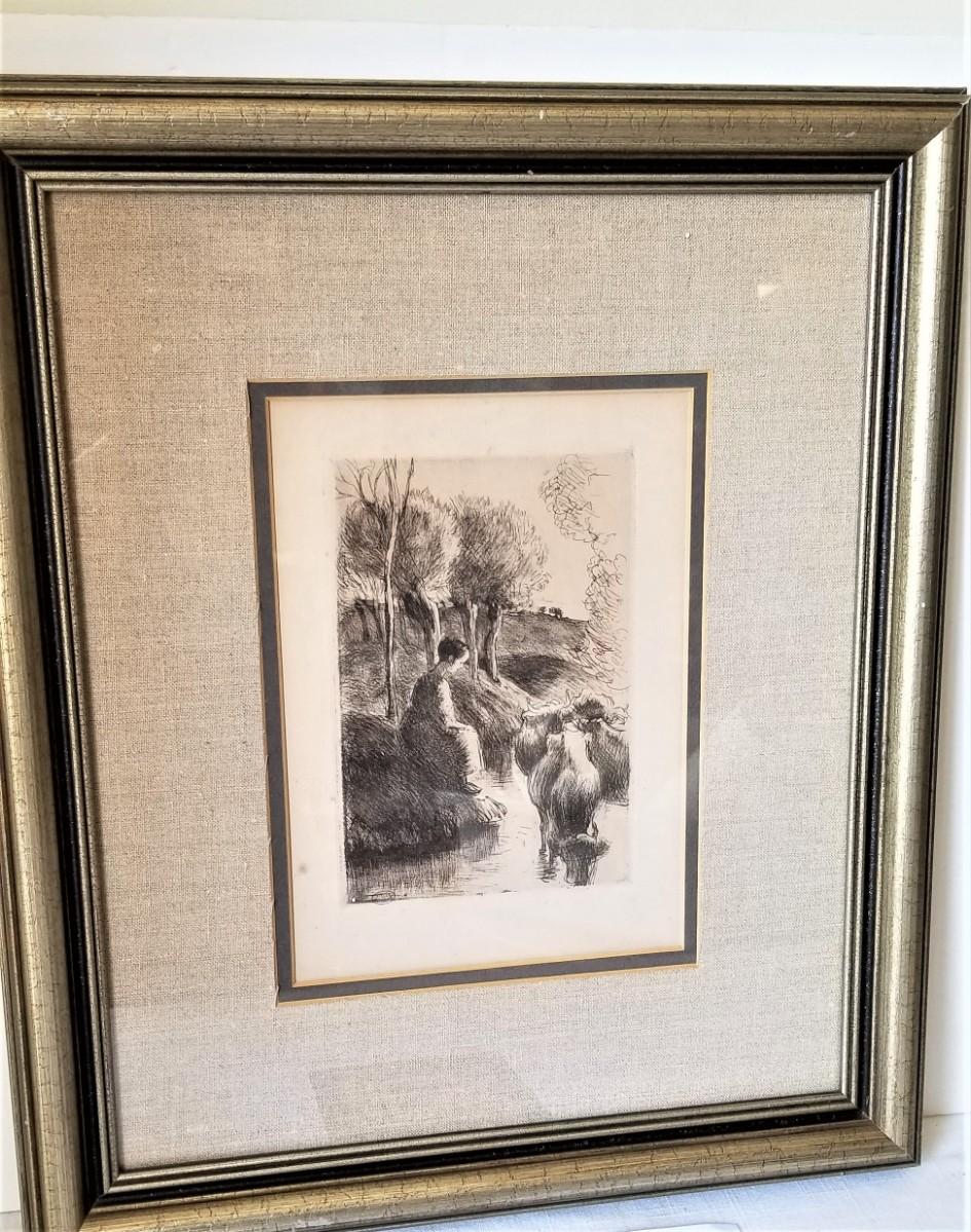 Originally purchased in 1972 from an art gallery - charming little etching by Impressionist artist Camille Pissarro, one of the greats! English title is "Cowherd at Water's Edge" or "Vachere au bard de L'eau". Numbered 31/100 - signed in plate "Attelier Pissarro". This piece was done ins 1890 - artist died in 1903. He was the only artist to be chosen to exhibit in all 8 Paris Impressionism exhibits from 1874-1886. Plate measures 7 5/8" x 5.25" - whole thing is 19.25" x 16.5". This work was appraised a few years ago by a local certified appraiser - you will get a copy of her report. She valued the work for insurance purposes at $2,000.