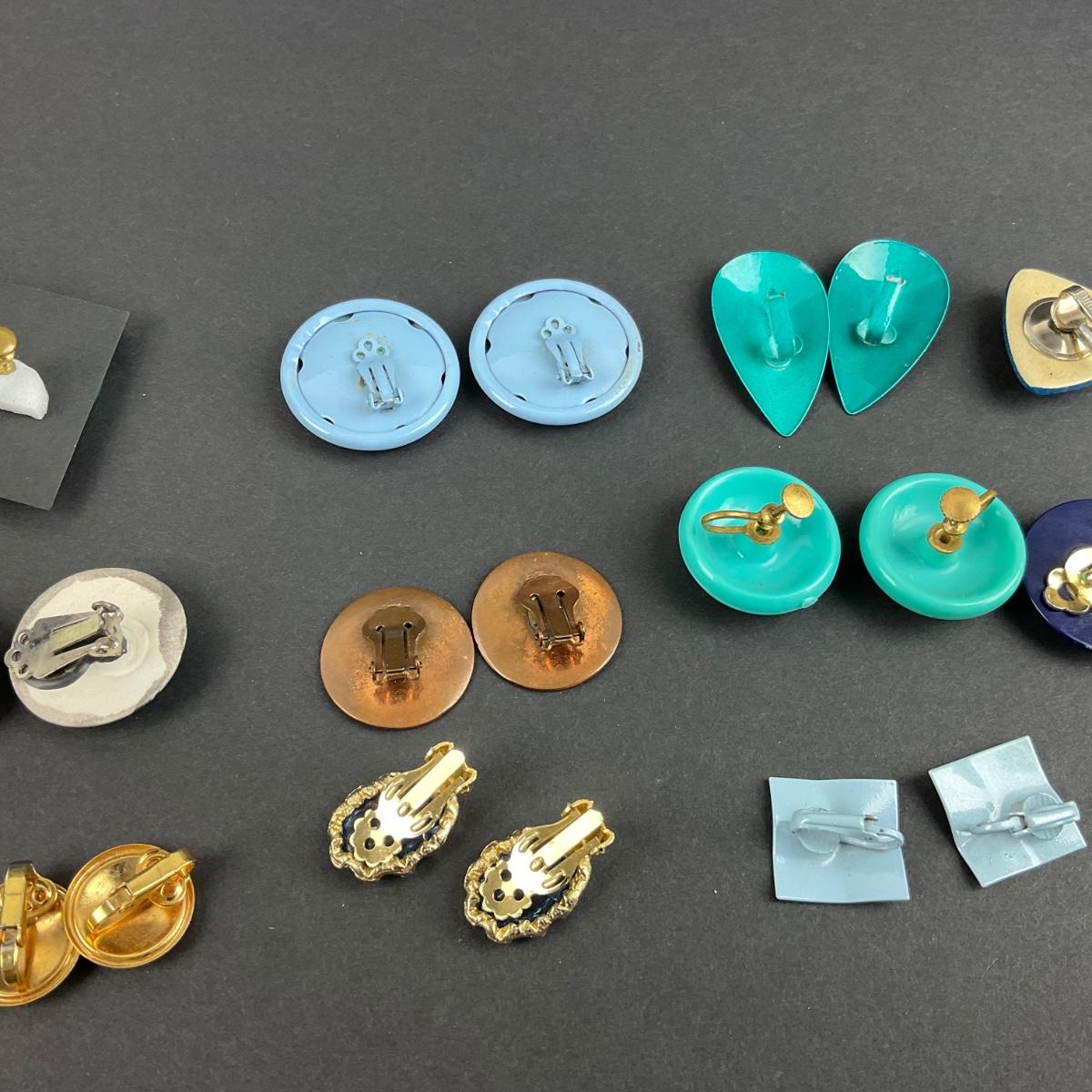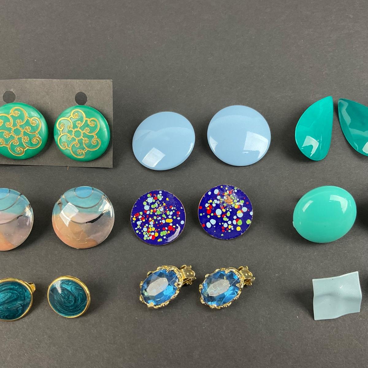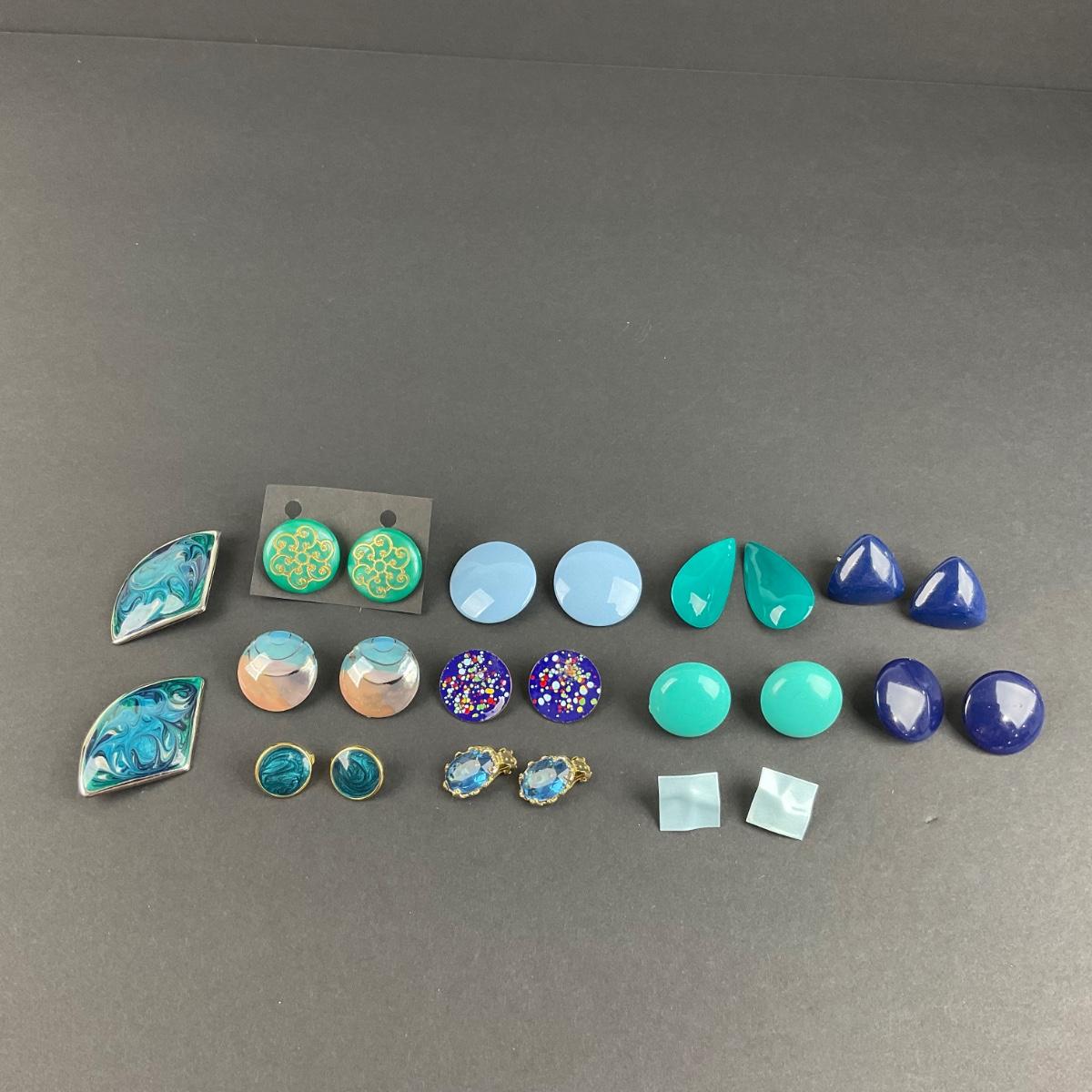Twelve pair of assorted blue clip earrings. Please see photos for details and condition. Any condition statement is given as a courtesy to a client, is an opinion, and should not be treated as a statement of fact. Reference to condition written, oral or within a condition report shall not be regarded as a full account of condition and may not include all defects, alterations, or restorations. Absence of a condition report does not imply a lot is flawless or lacking imperfections or damage. Katherine’s Auction & Appraisal Service shall have no responsibility for any error or omission. Returns shall not be accepted on the basis of condition. ::: Shipping is available on this lot. If you require shipping you must let us know at the close of the auction. We will coordinate with you after the item has been won. Shipping fees will include insurance up to or exceeding the value of all items being mailed. If you have any questions regarding this lot please contact the auctioneer either via this website, by direct email or by phone. PICK UP TIMES and other important information can be found in the TERMS and DESCRIPTION of the auction. Please take a look for pertinent information. Thanks!