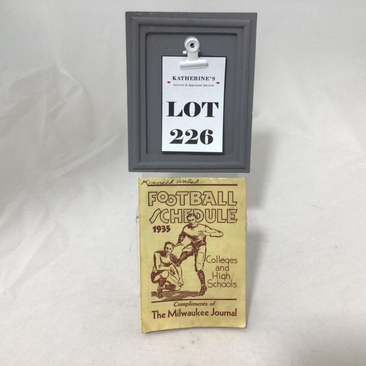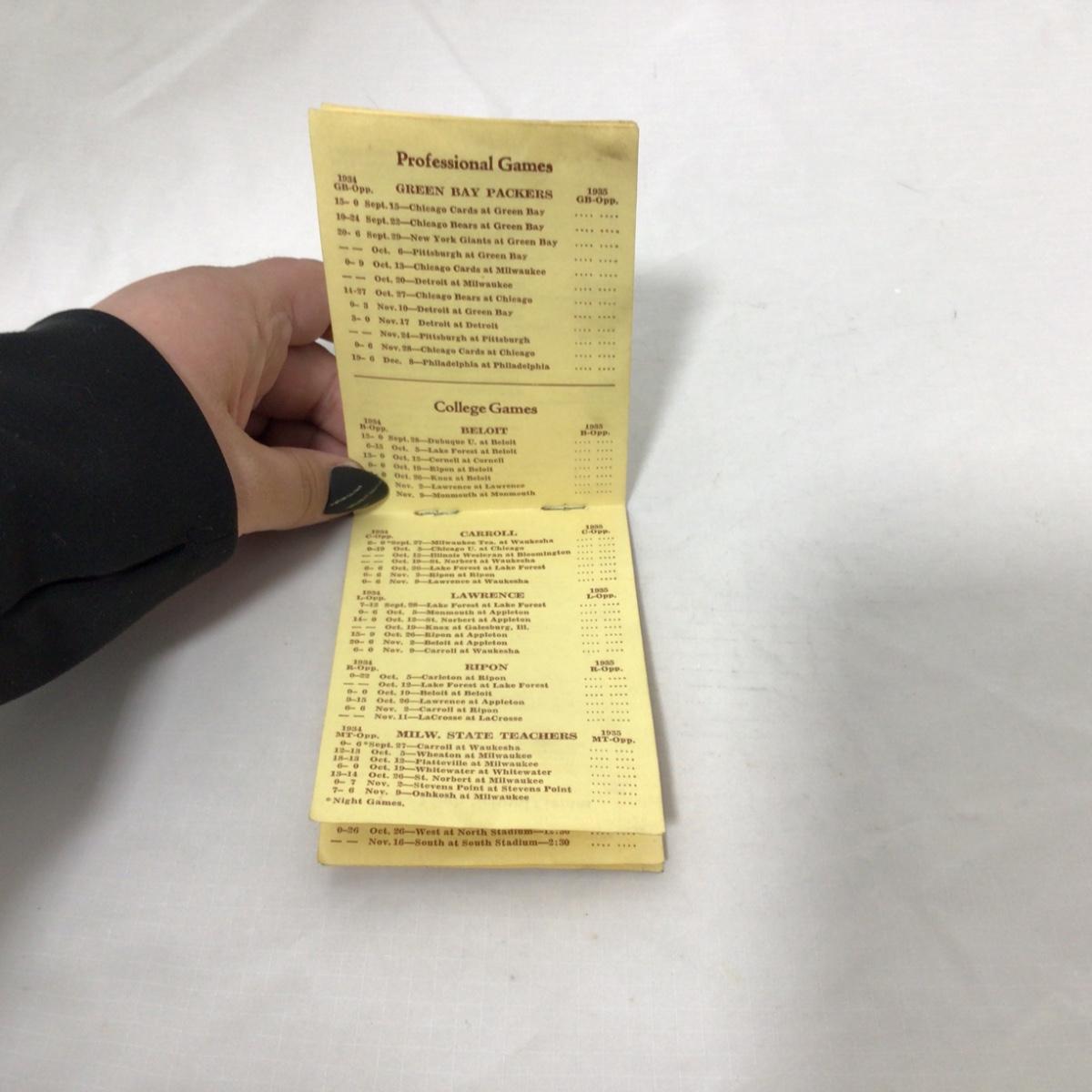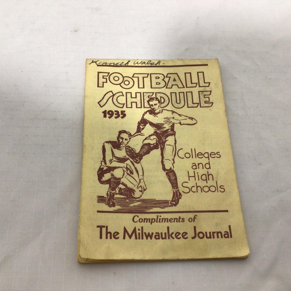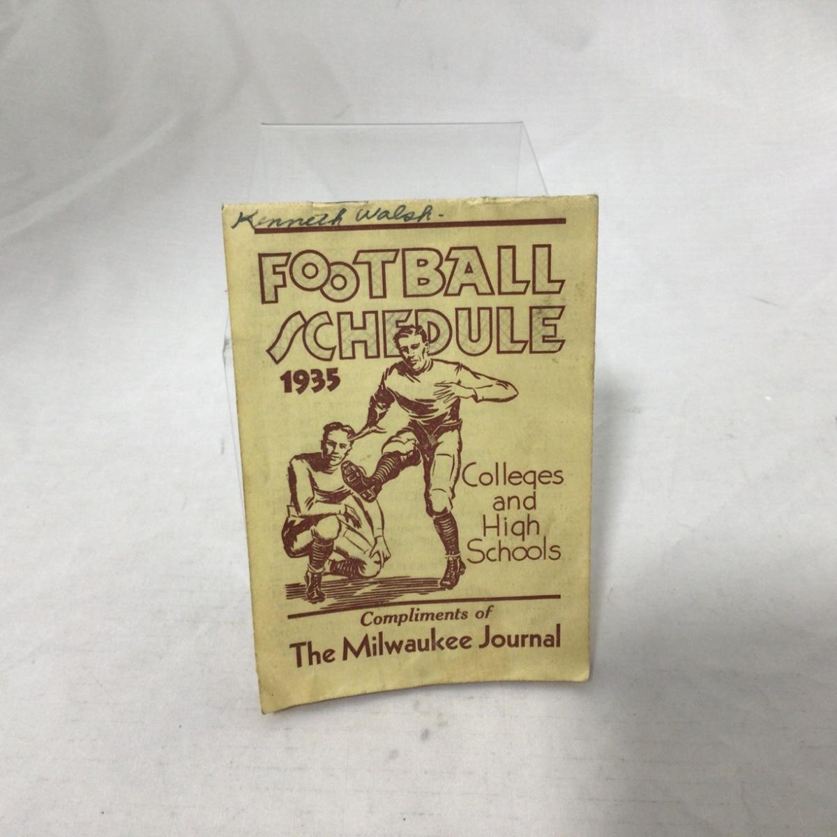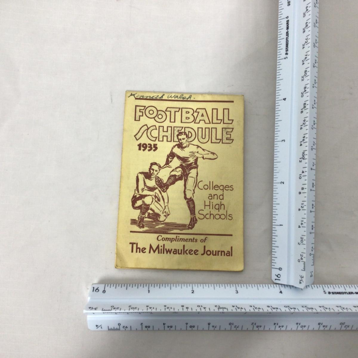 One 1935 Football schedule compliments of the Milwaukee Journal. For colleges, high schools, and catholic conference. Please see photos for details and condition. ::: Shipping is available on this lot. If you require shipping you must let us know at the close of the auction. We will coordinate with you after the item has been won. Shipping fees will include insurance up to or exceeding the value of all items being mailed. If you have any questions regarding this lot please contact the auctioneer either via this website, by direct email or by phone. PICK UP TIMES and other important information can be found in the TERMS and DESCRIPTION of the auction. Please take a look for pertinent information. Thanks!