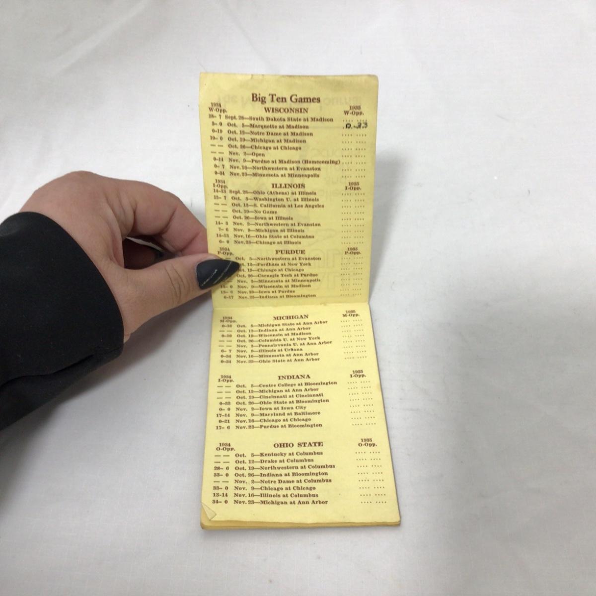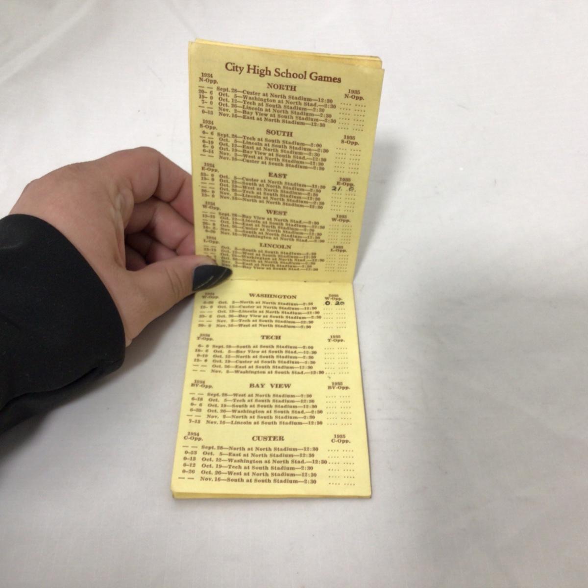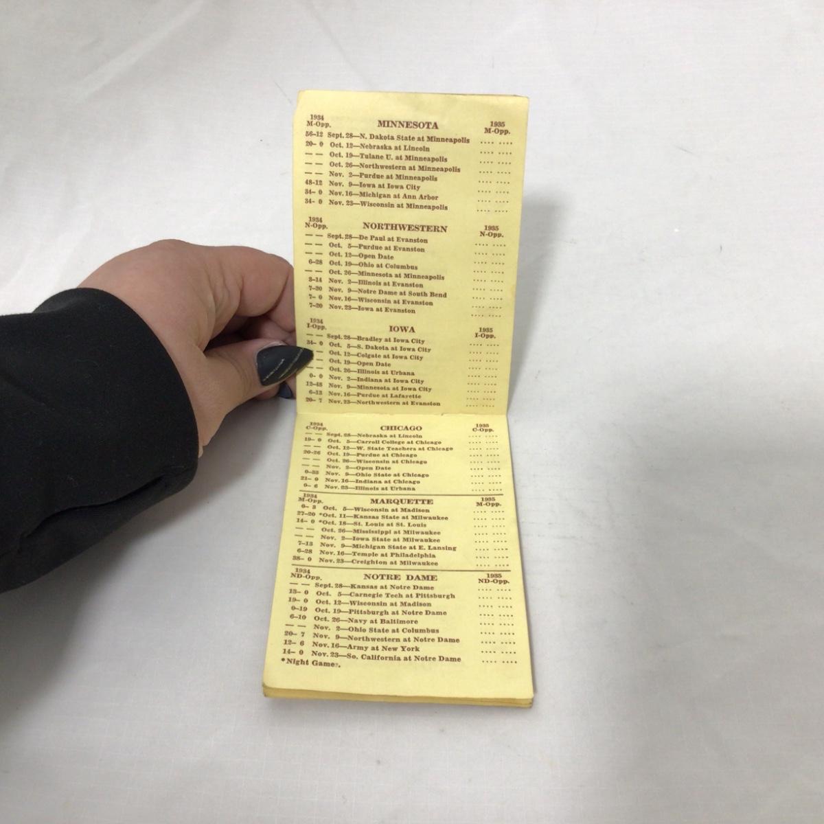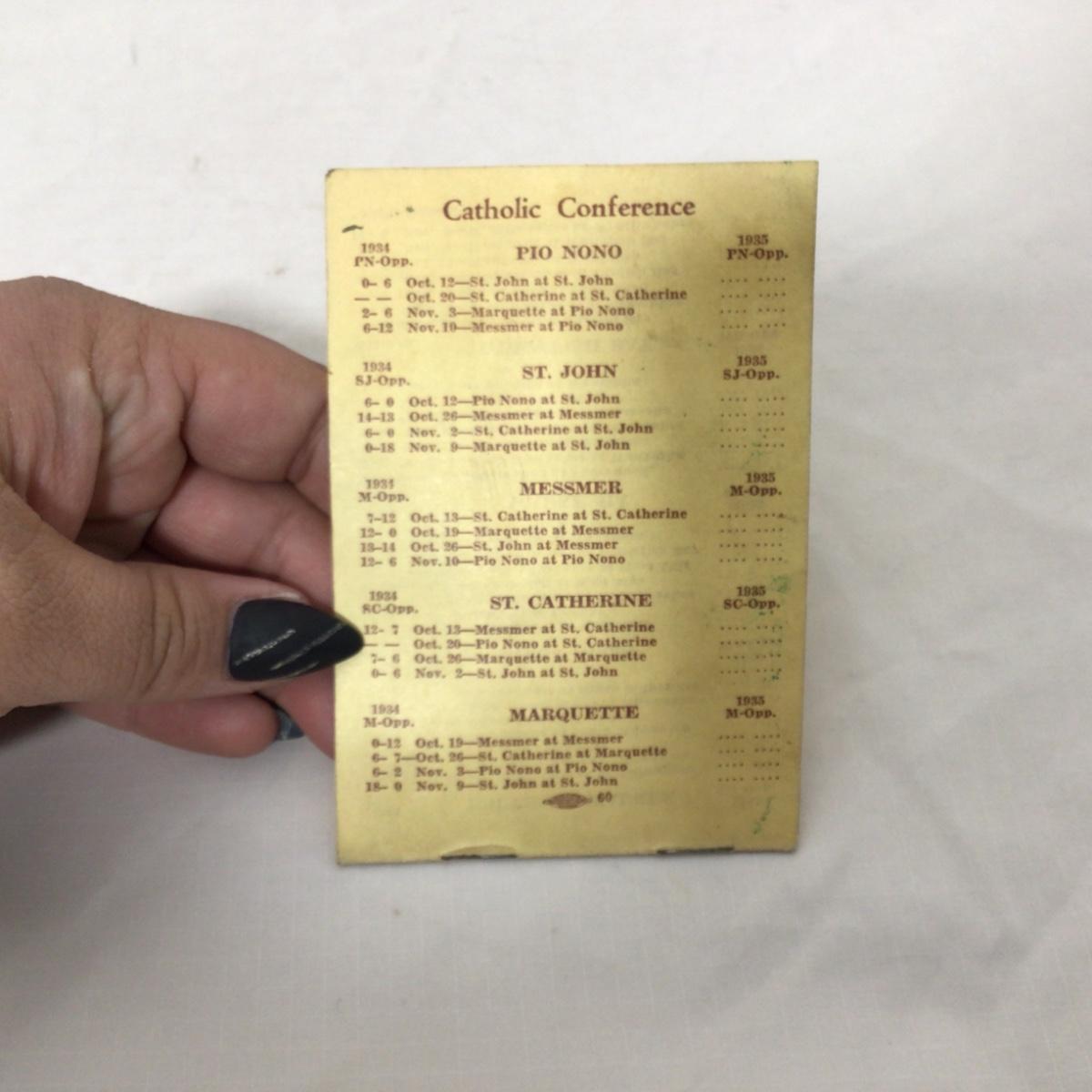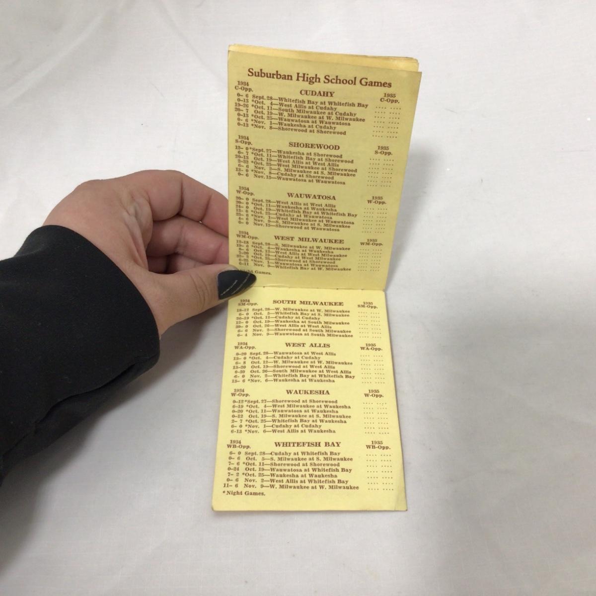 One 1935 Football schedule compliments of the Milwaukee Journal. For colleges, high schools, and catholic conference. Please see photos for details and condition. ::: Shipping is available on this lot. If you require shipping you must let us know at the close of the auction. We will coordinate with you after the item has been won. Shipping fees will include insurance up to or exceeding the value of all items being mailed. If you have any questions regarding this lot please contact the auctioneer either via this website, by direct email or by phone. PICK UP TIMES and other important information can be found in the TERMS and DESCRIPTION of the auction. Please take a look for pertinent information. Thanks!