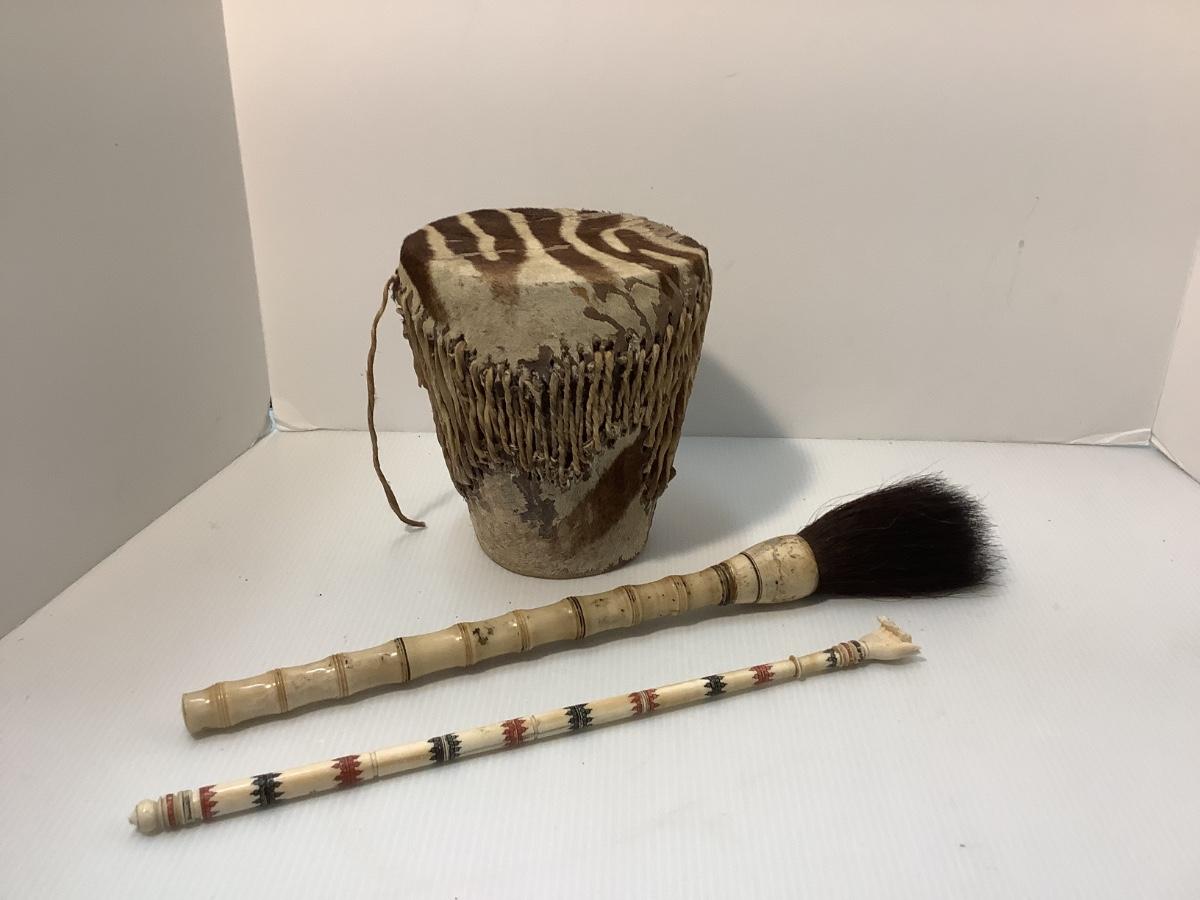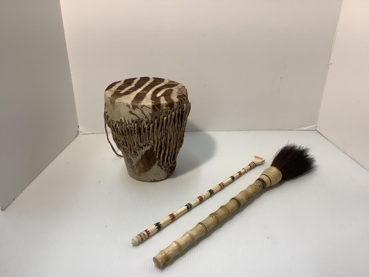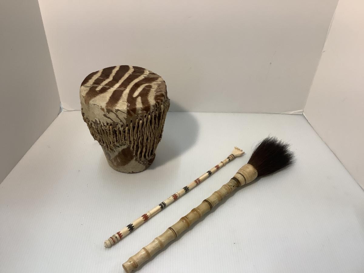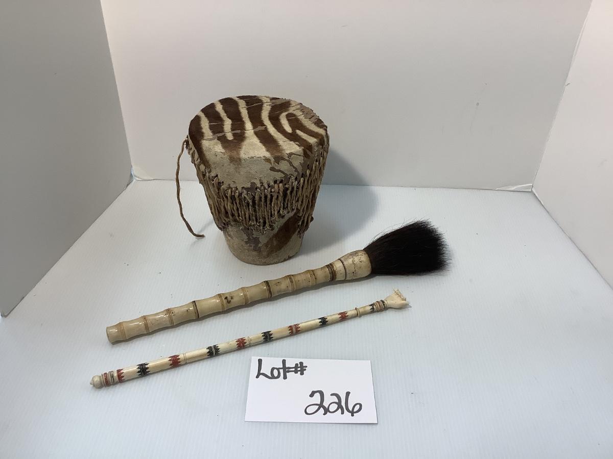 226. Vintage African Animal Skin Drum/Old Chinese Calligraphy Brush Hair Pen