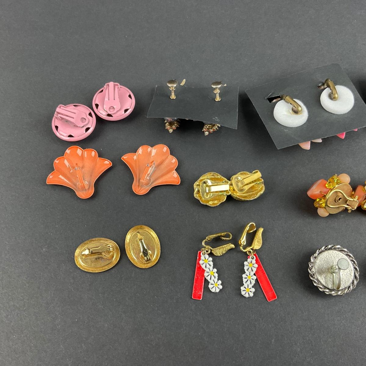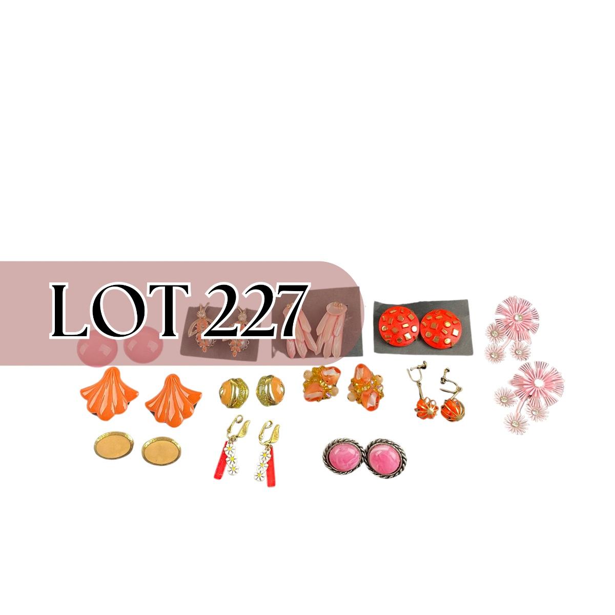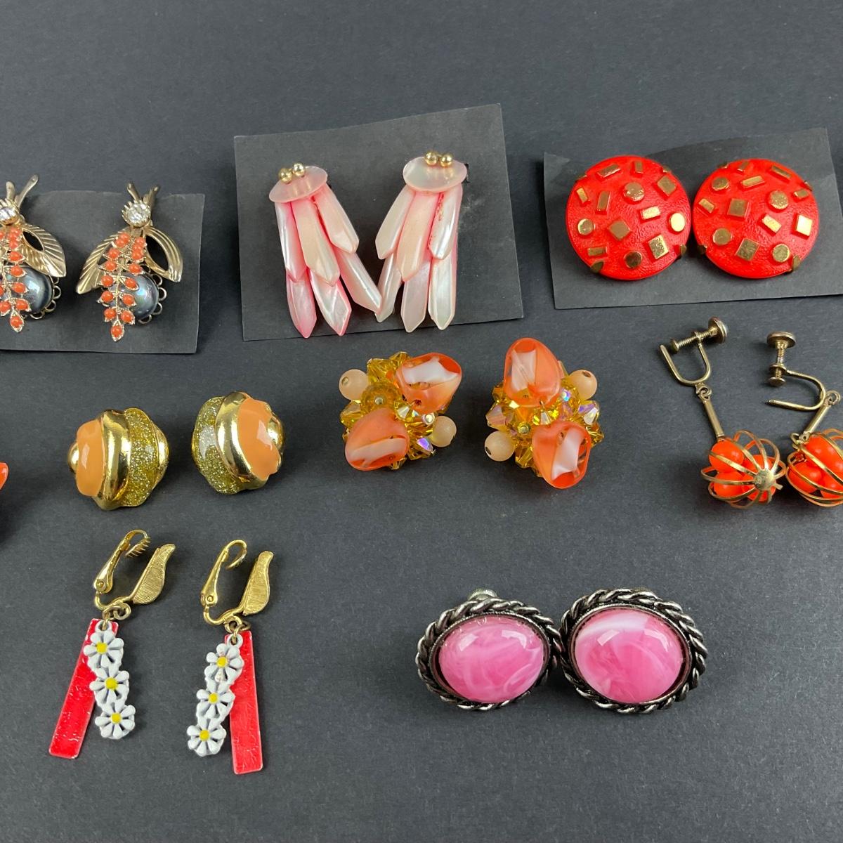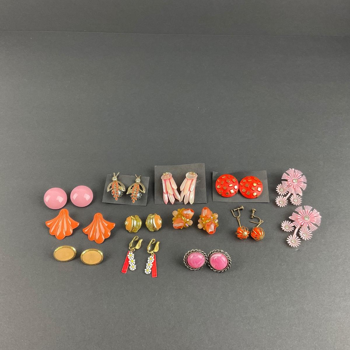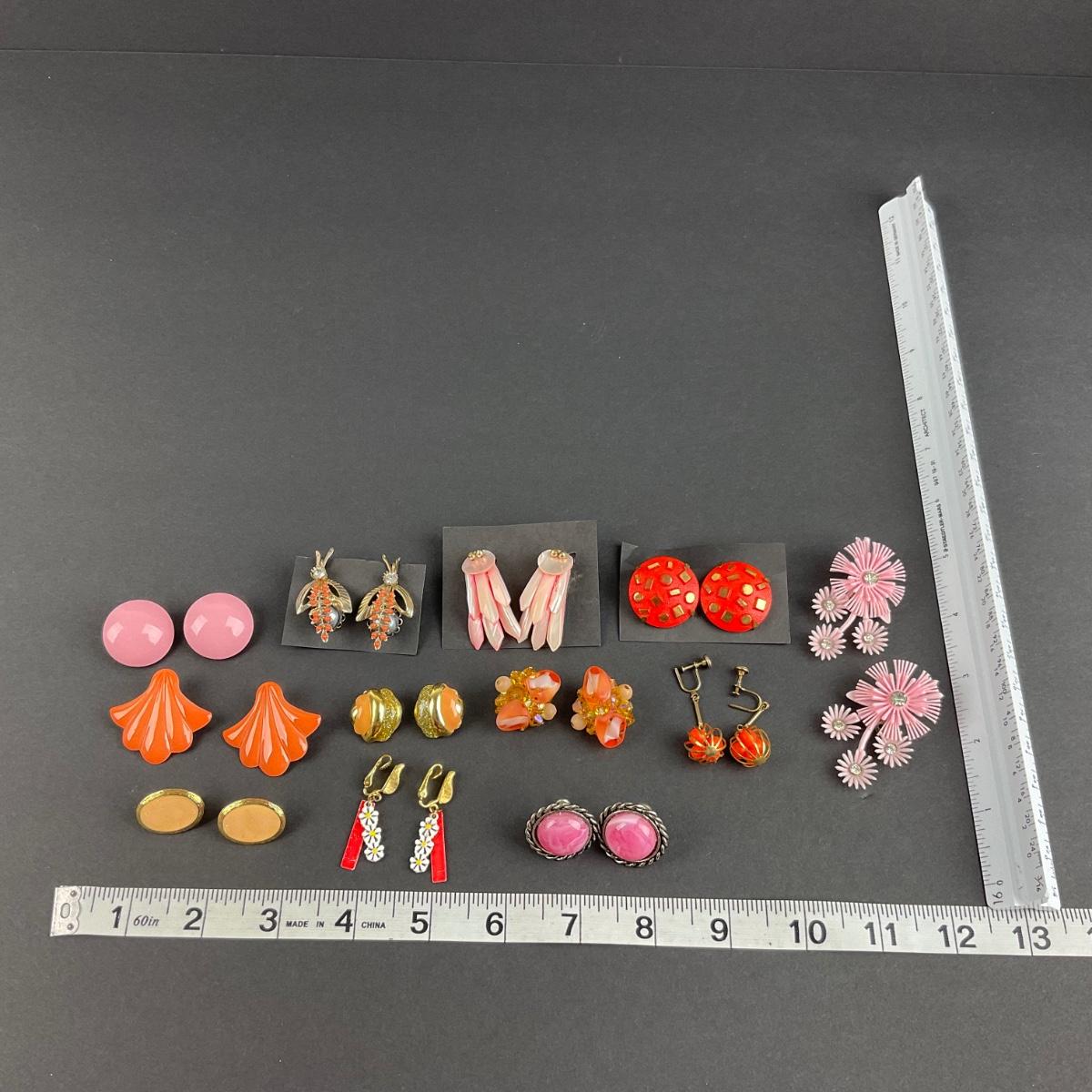 Twelve assorted orange and pink in color clip earrings. Please see photos for details and condition. Any condition statement is given as a courtesy to a client, is an opinion, and should not be treated as a statement of fact. Reference to condition written, oral or within a condition report shall not be regarded as a full account of condition and may not include all defects, alterations, or restorations. Absence of a condition report does not imply a lot is flawless or lacking imperfections or damage. Katherine’s Auction & Appraisal Service shall have no responsibility for any error or omission. Returns shall not be accepted on the basis of condition. ::: Shipping is available on this lot. If you require shipping you must let us know at the close of the auction. We will coordinate with you after the item has been won. Shipping fees will include insurance up to or exceeding the value of all items being mailed. If you have any questions regarding this lot please contact the auctioneer either via this website, by direct email or by phone. PICK UP TIMES and other important information can be found in the TERMS and DESCRIPTION of the auction. Please take a look for pertinent information. Thanks!