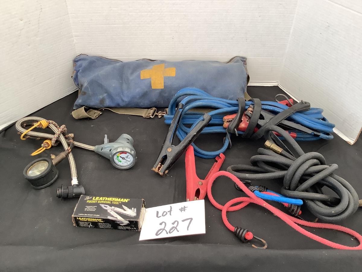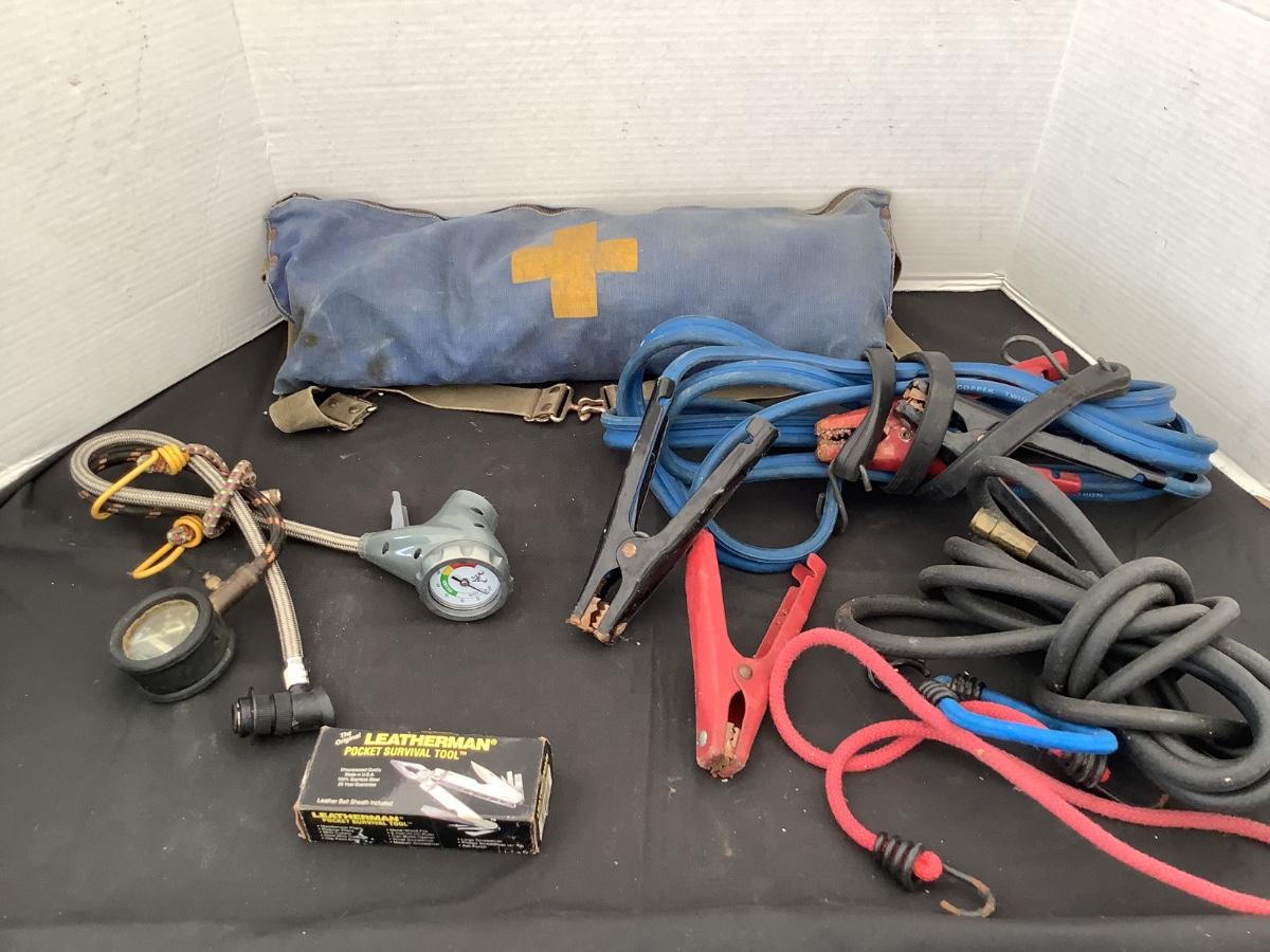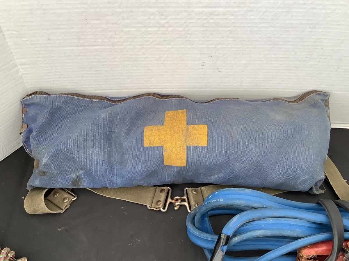 227 Vintage First Aid Pack, Jumper Cables, Hose, Gauge, Bungee Cord