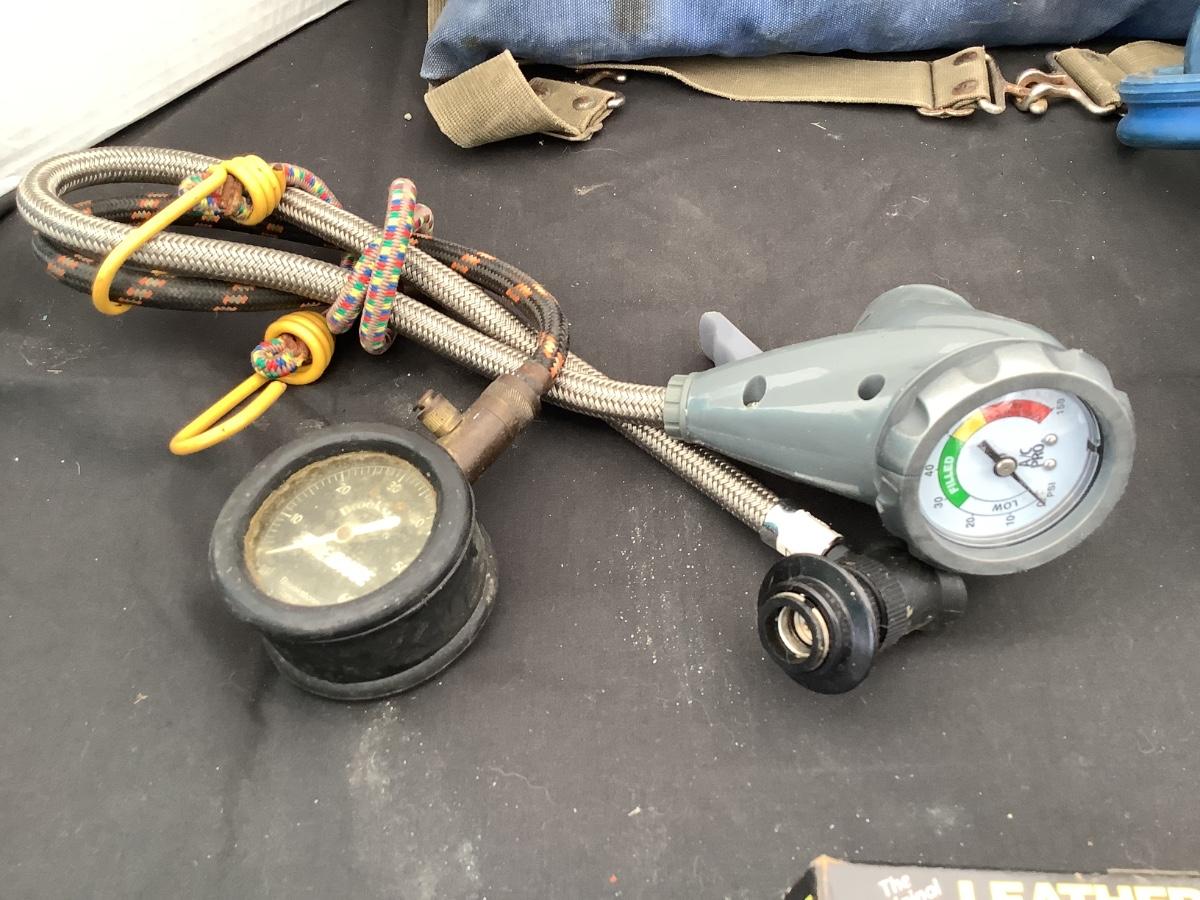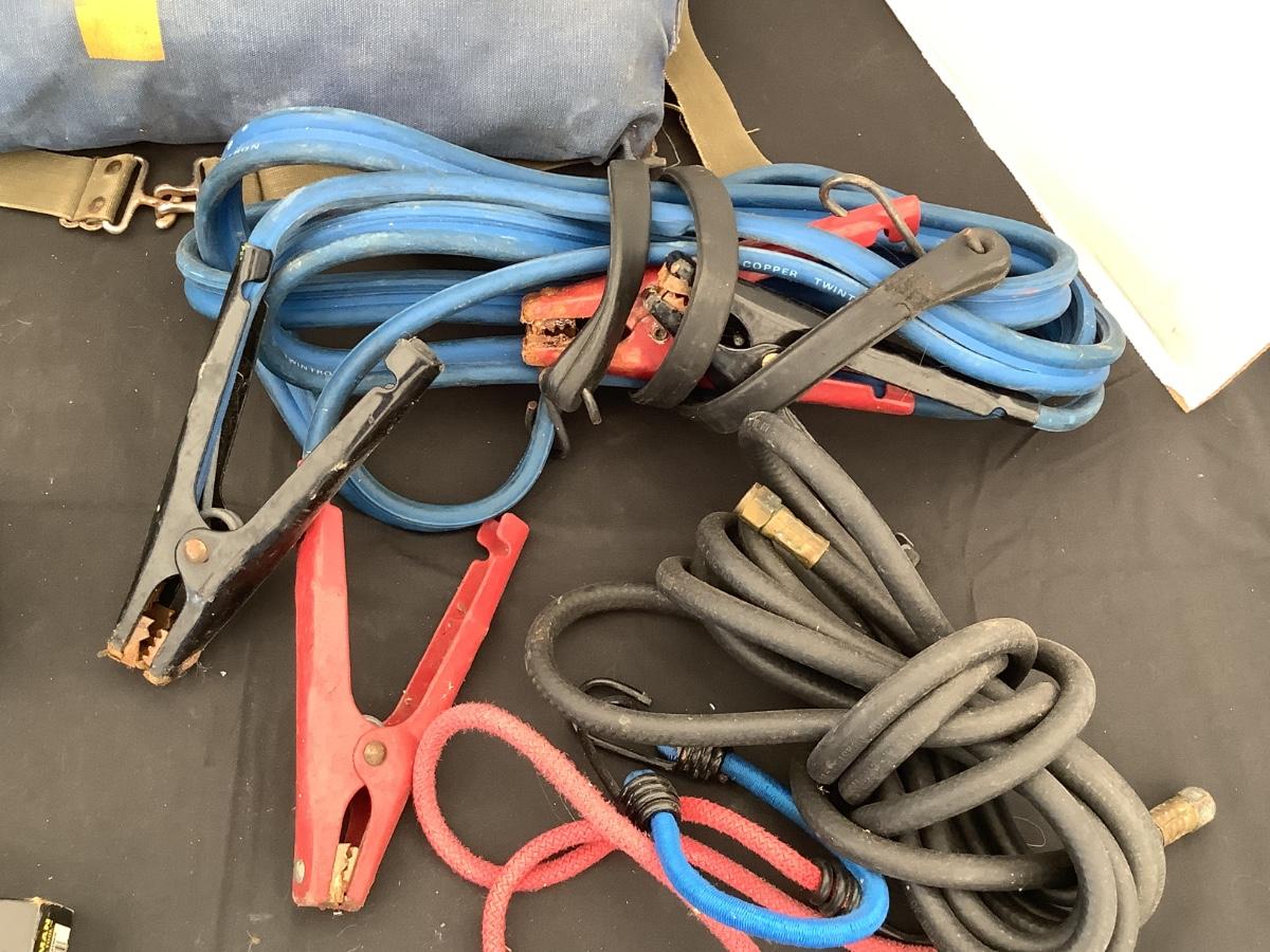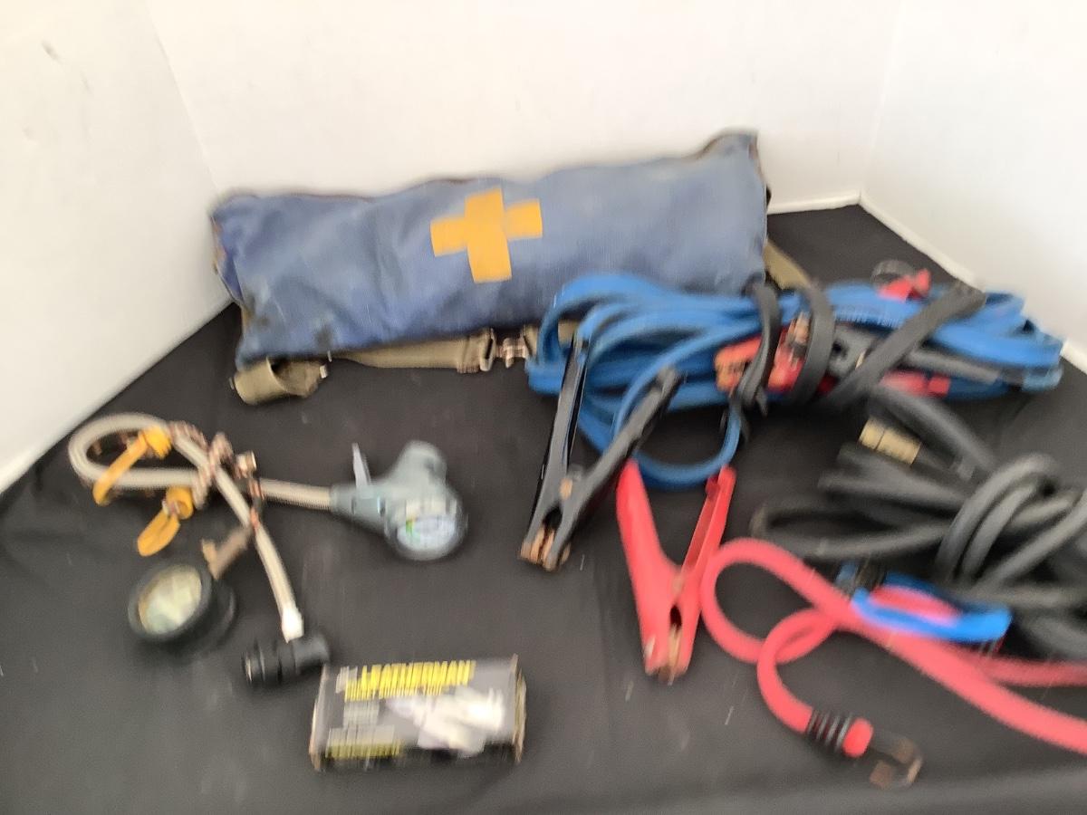 227 Vintage First Aid Pack, Jumper Cables, Hose, Gauge, Bungee Cord