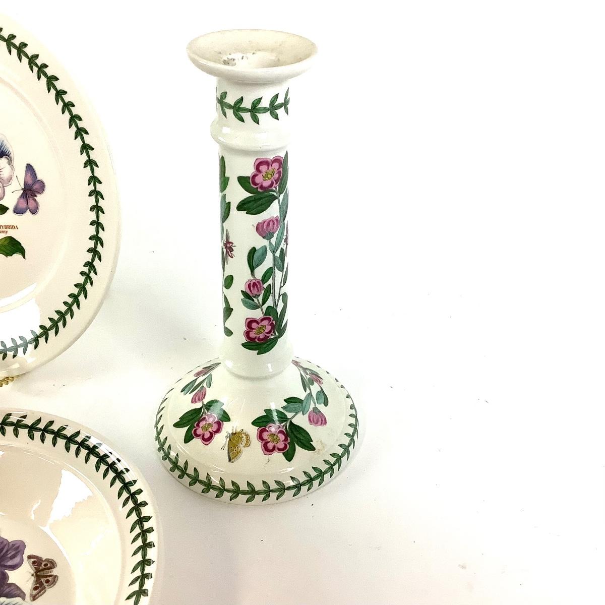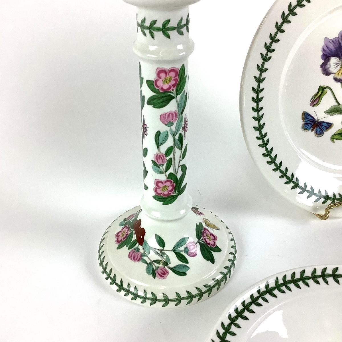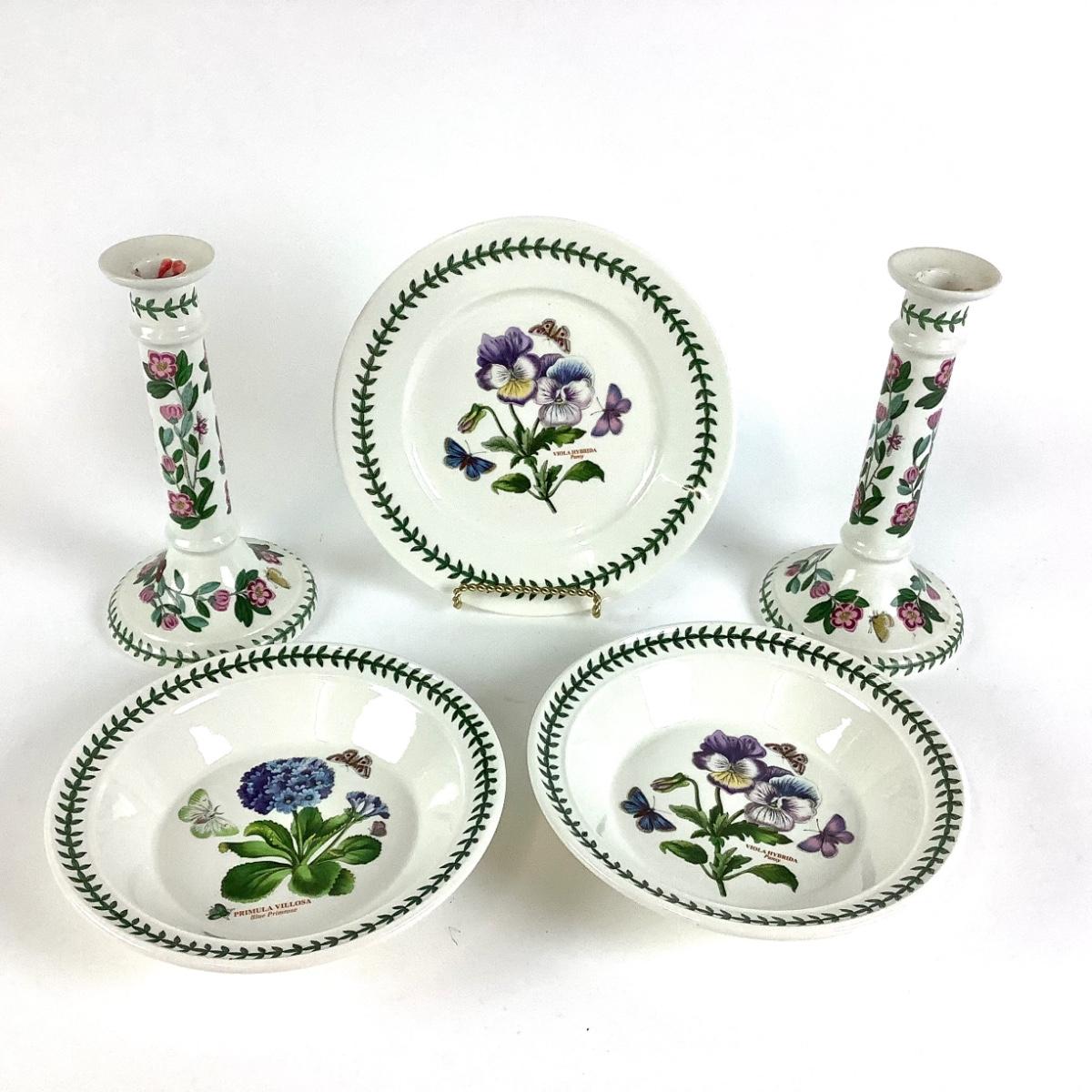 Lot with two rare "Botanic Garden" Portmeirion ceramic candle holders with vintage backstamp measuring 9"H, 5"Dia. Two 8.5"Dia. bowls and one 9.5" Dia. lunch plate with newer backstamps.