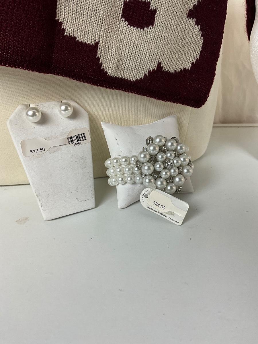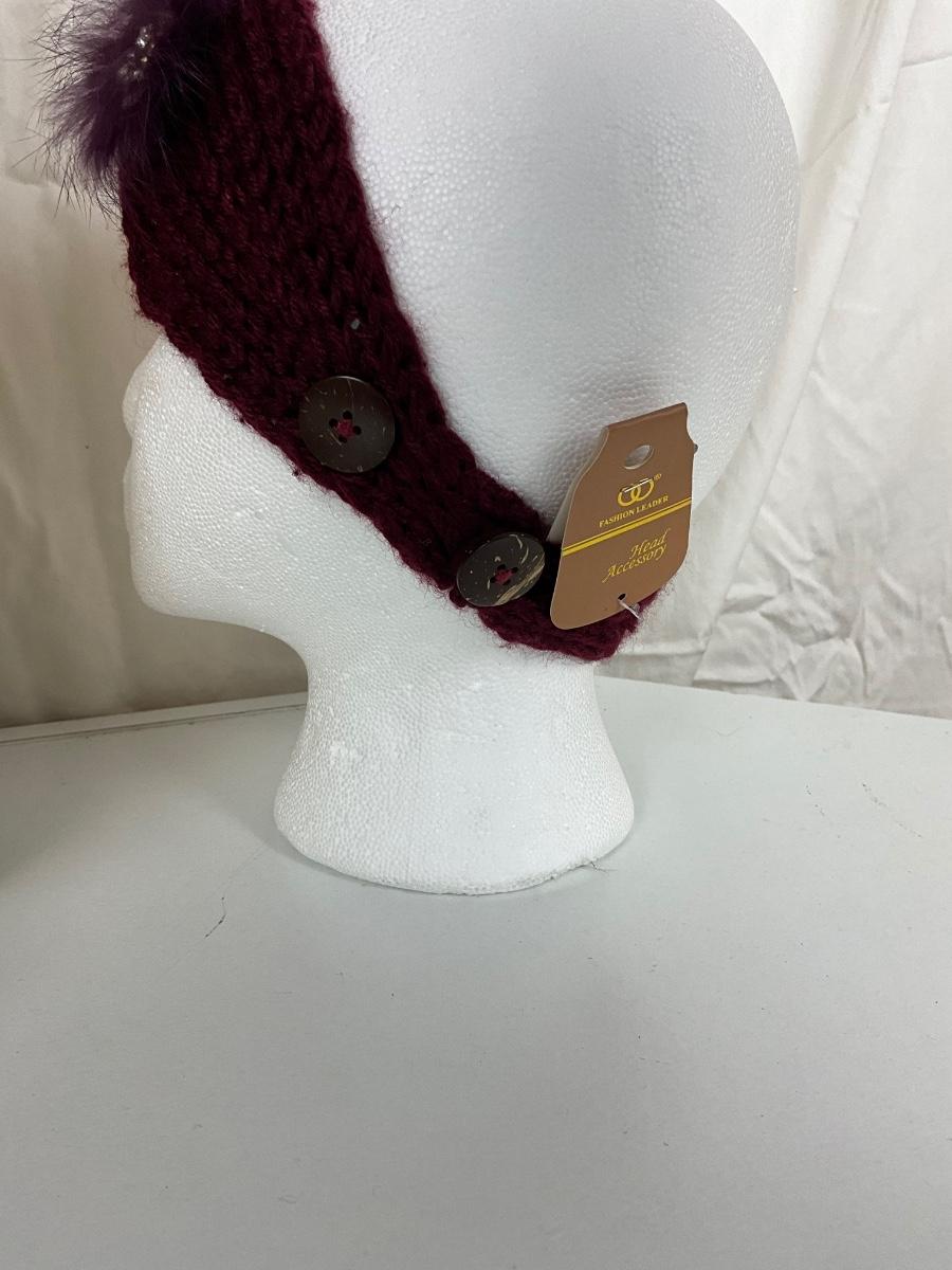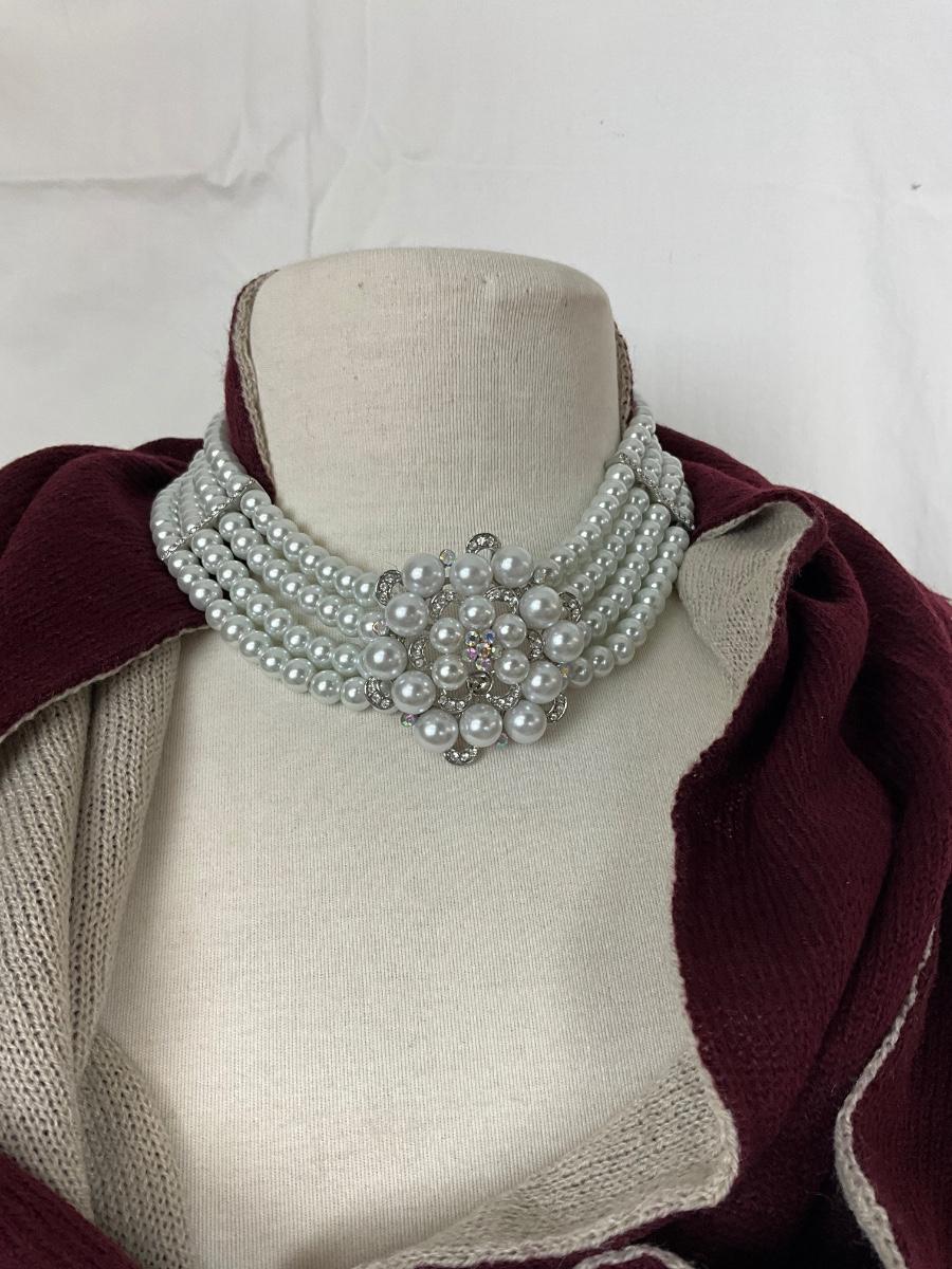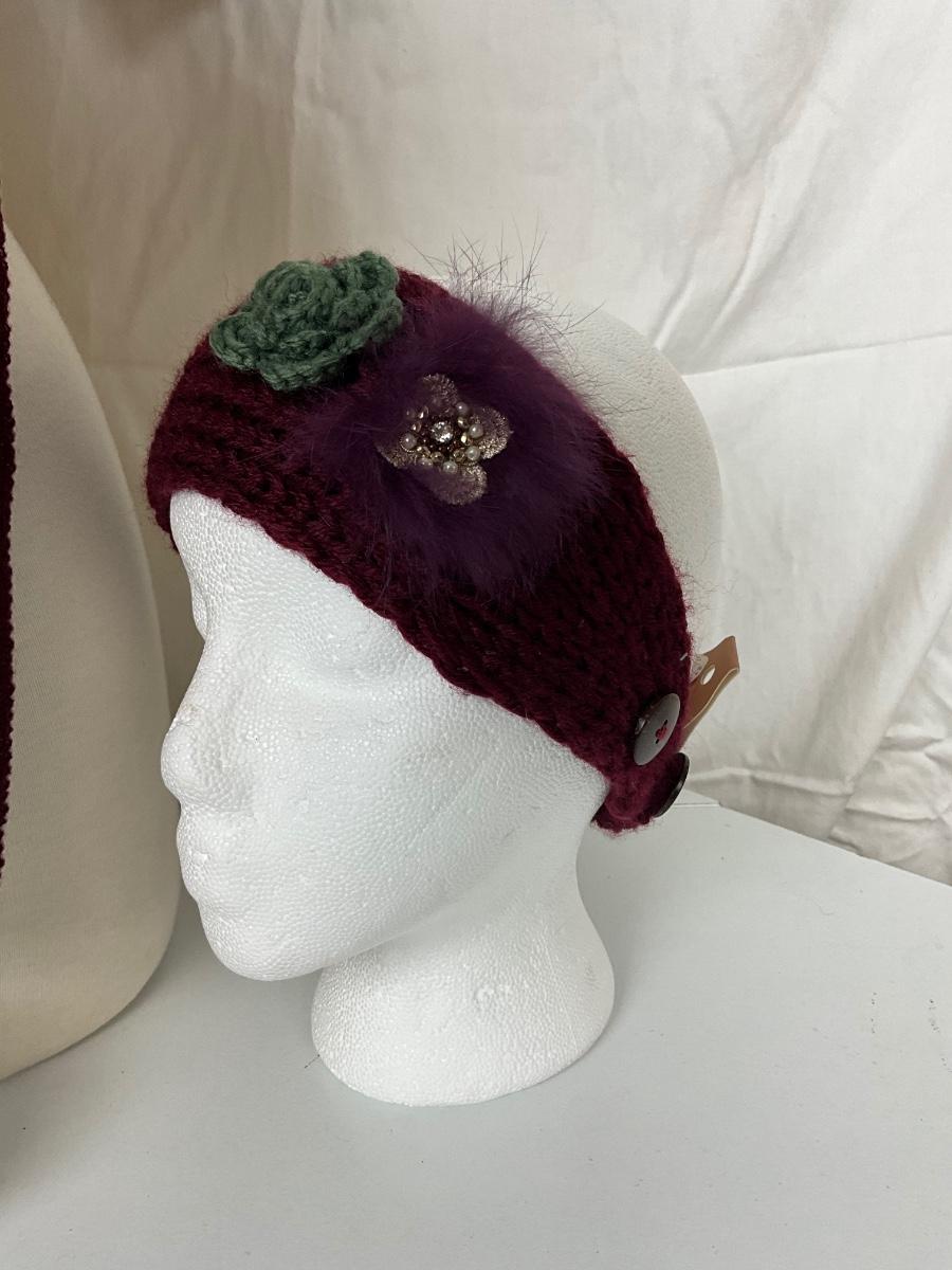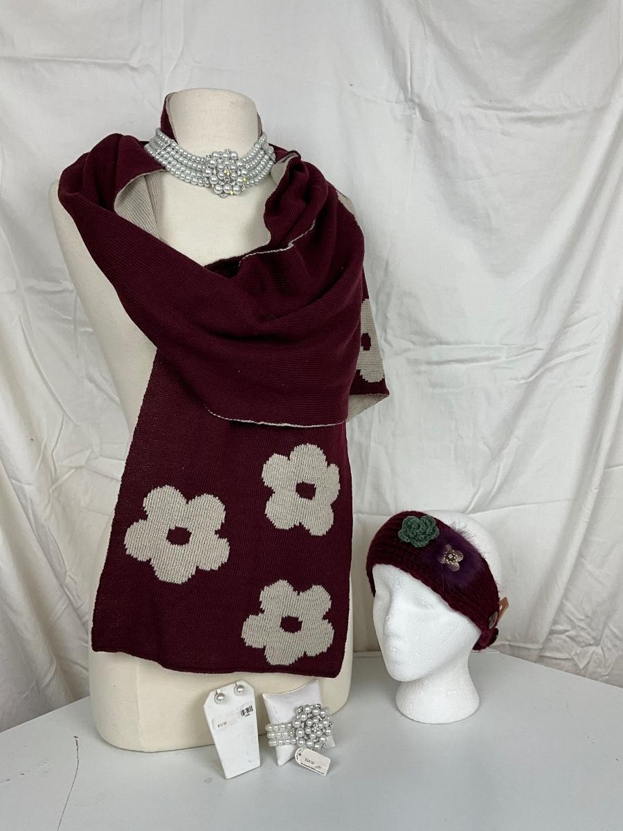 229 Floral Knit Burgundy Scarf/wrap with Head Wrap, Pearl Rhinestone Necklace, Bracelet and Earrings
