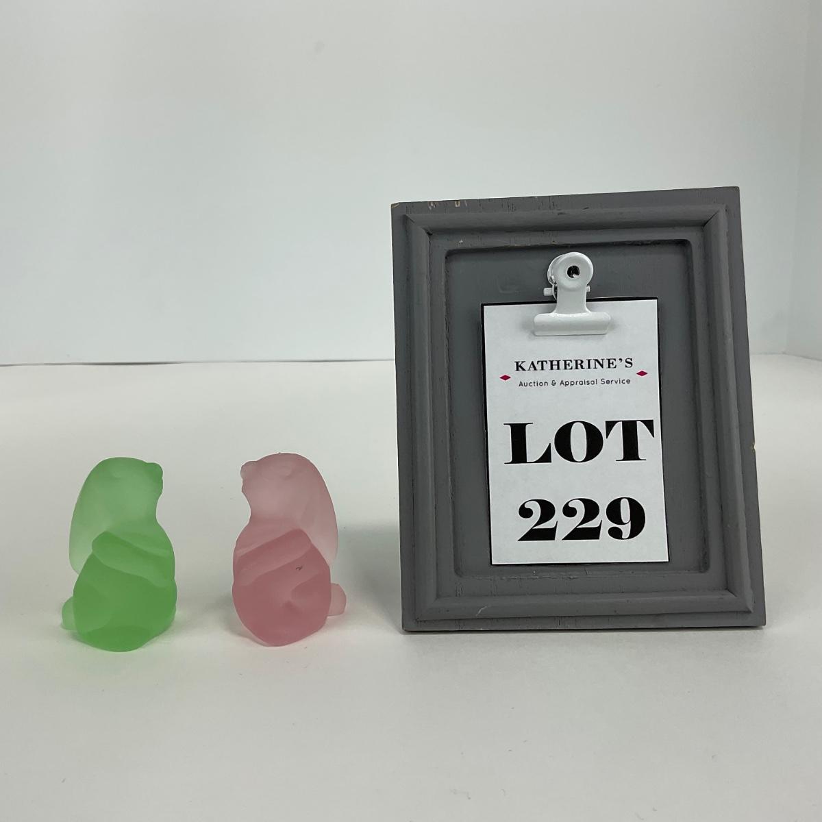 Two small rabbit figures in frosted glass. One is green in color the other is pink. This piece has no damage, and appears to be in great shape with no visable chips, cracks, or broken pieces. Please see photos for details and condition. Any condition statement is given as a courtesy to a client, is an opinion, and should not be treated as a statement of fact. Reference to condition written, oral or within a condition report shall not be regarded as a full account of condition and may not include all defects, alterations, or restorations. Absence of a condition report does not imply a lot is flawless or lacking imperfections or damage. Katherine’s Auction & Appraisal Service shall have no responsibility for any error or omission. Returns shall not be accepted on the basis of condition. ::: Shipping is available on this lot. If you require shipping you must let us know at the close of the auction. We will coordinate with you after the item has been won. Shipping fees will include insurance up to or exceeding the value of all items being mailed. If you have any questions regarding this lot please contact the auctioneer either via this website, by direct email or by phone. PICK UP TIMES and other important information can be found in the TERMS and DESCRIPTION of the auction. Please take a look for pertinent information. Thanks!