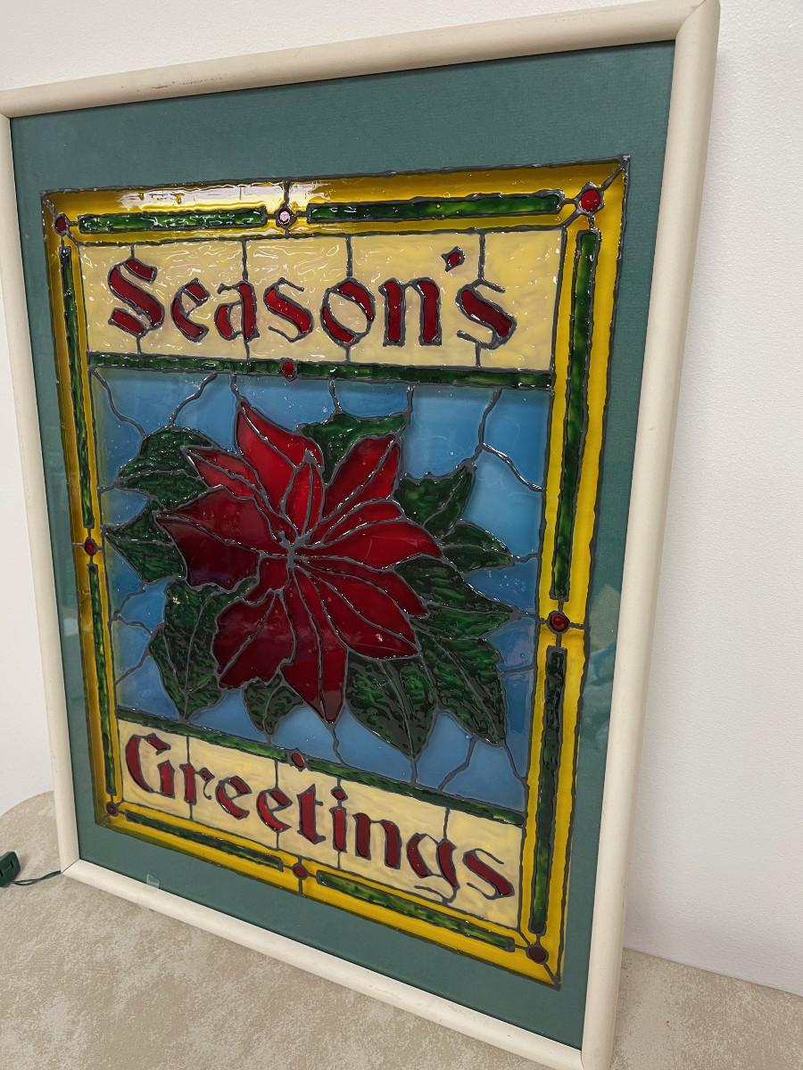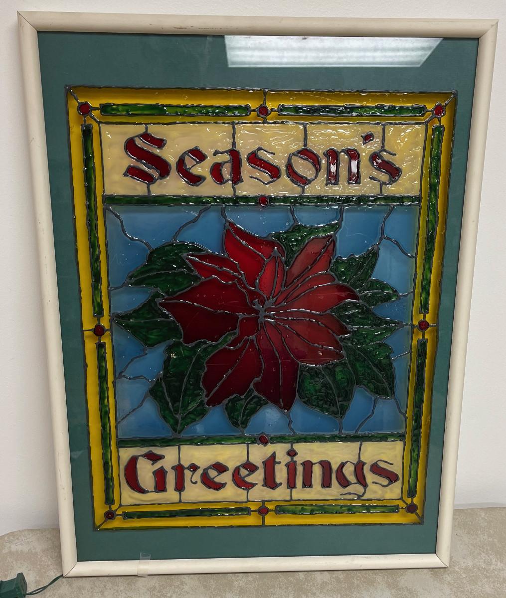 #229B Season Greetings Plastic Faux Stain glass Light Up