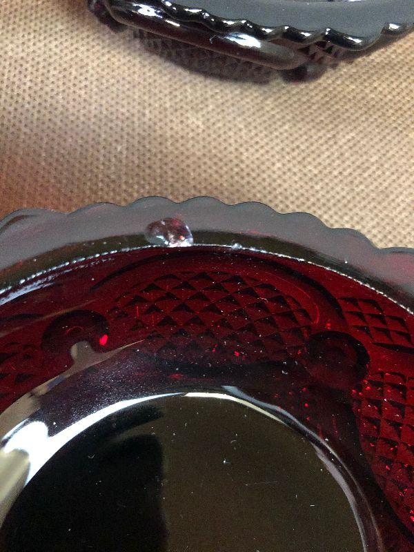By Avon small chip in the rim of all of them. 5" Diameter but great for serving a small bowl of ice cream.