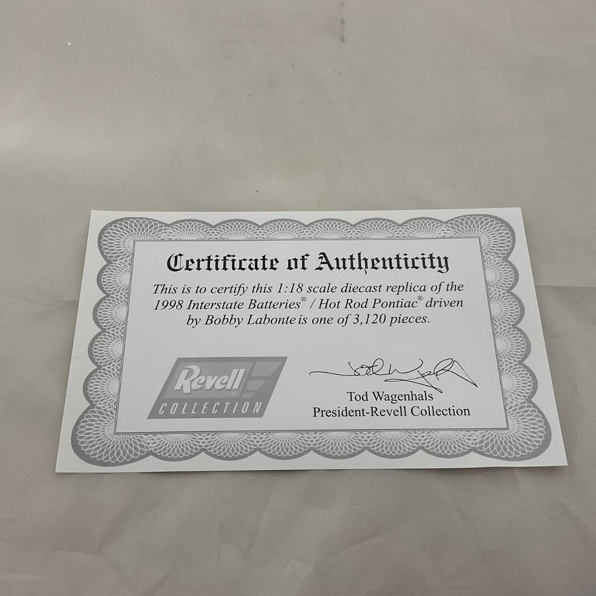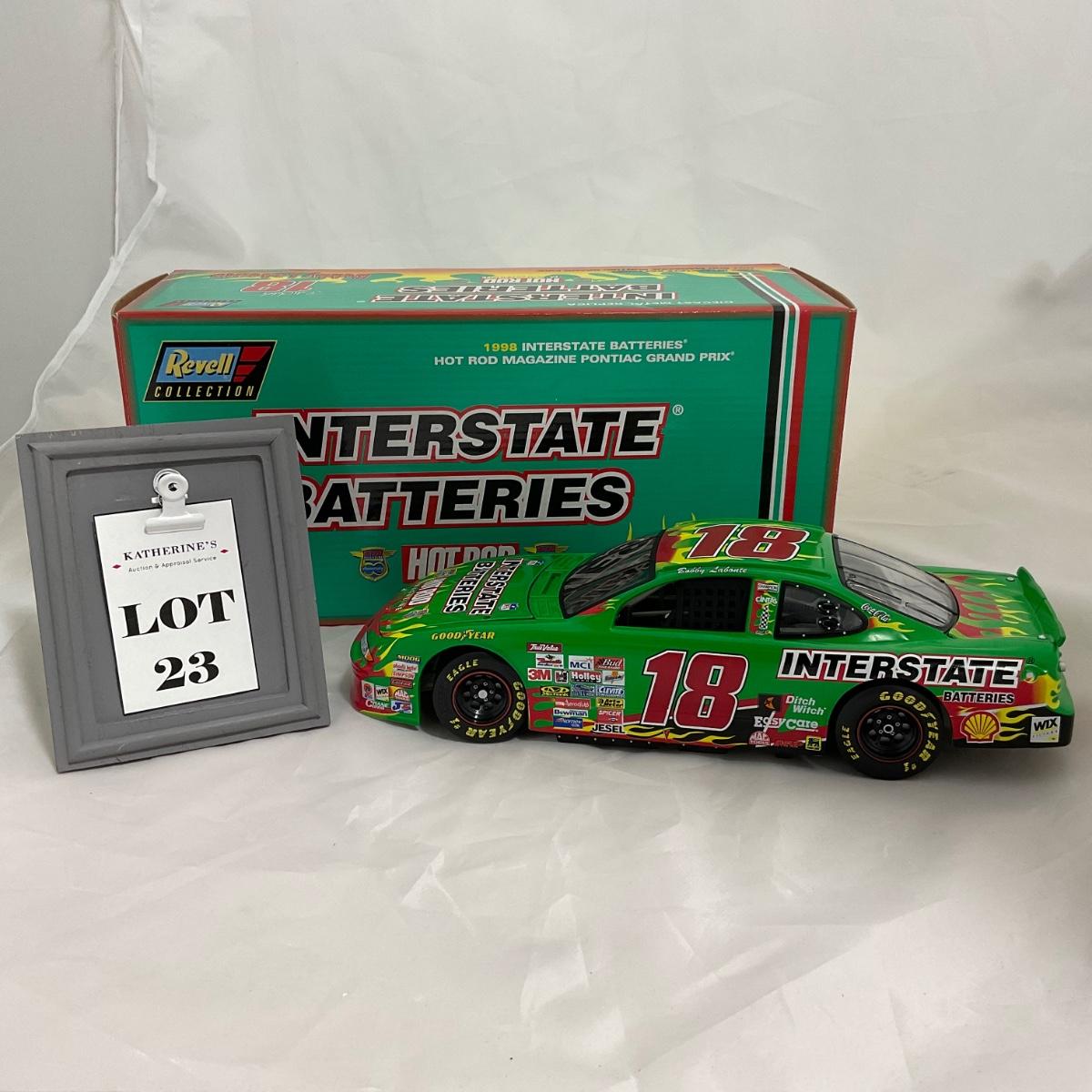 One NASCAR die cast 1:18 scale 1998 Interstate Batteries and Hot Rod Magazine Pontiac Grand Prix figure. Bobby Labonte. Comes with a Certificate of Authenticity. Please see photos for details and condition. ::: Shipping is available on this lot. If you require shipping you must let us know at the close of the auction. We will coordinate with you after the item has been won. Shipping fees will include insurance up to or exceeding the value of all items being mailed. If you have any questions regarding this lot please contact the auctioneer either via this website, by direct email or by phone. PICK UP TIMES and other important information can be found in the TERMS and DESCRIPTION of the auction. Please take a look for pertinent information. Thanks!