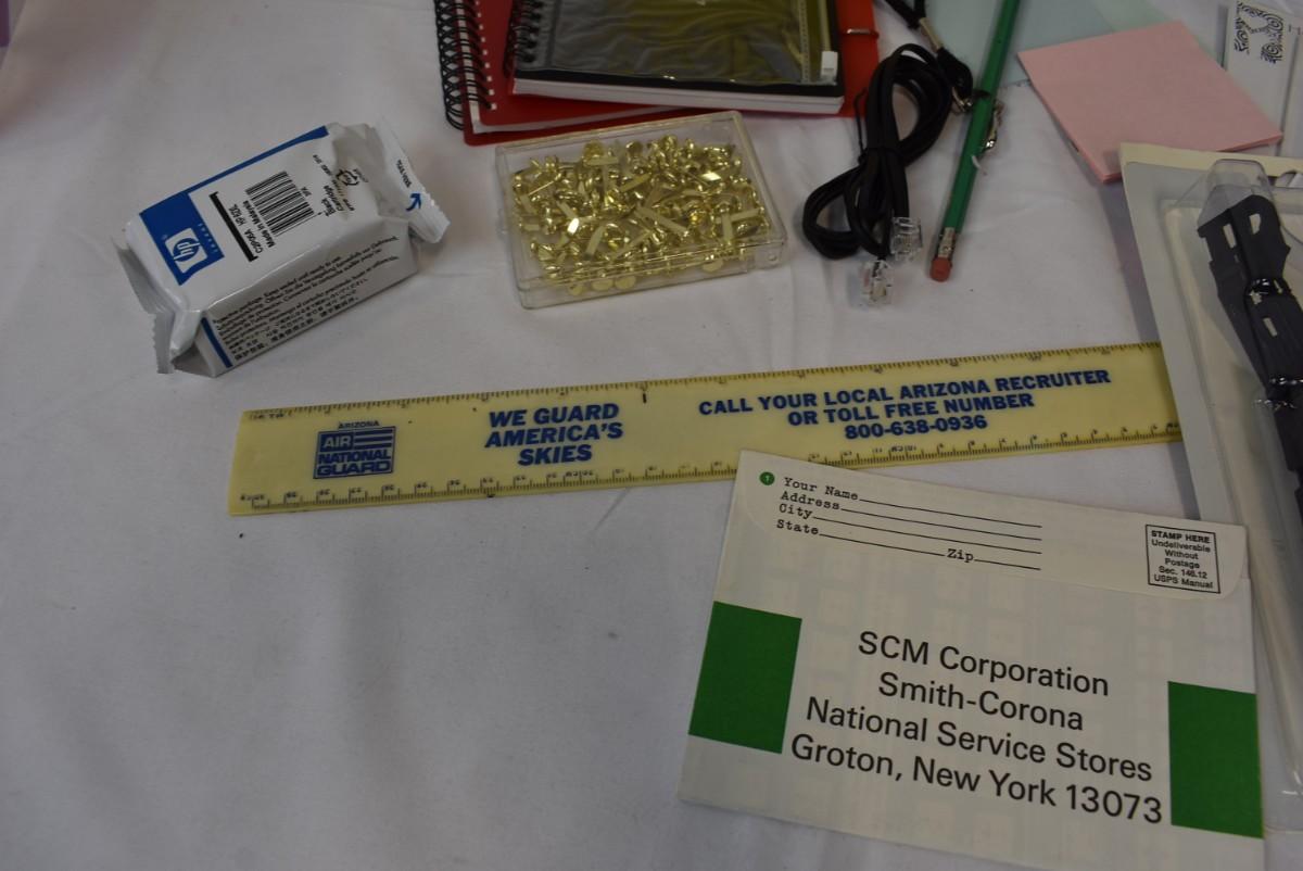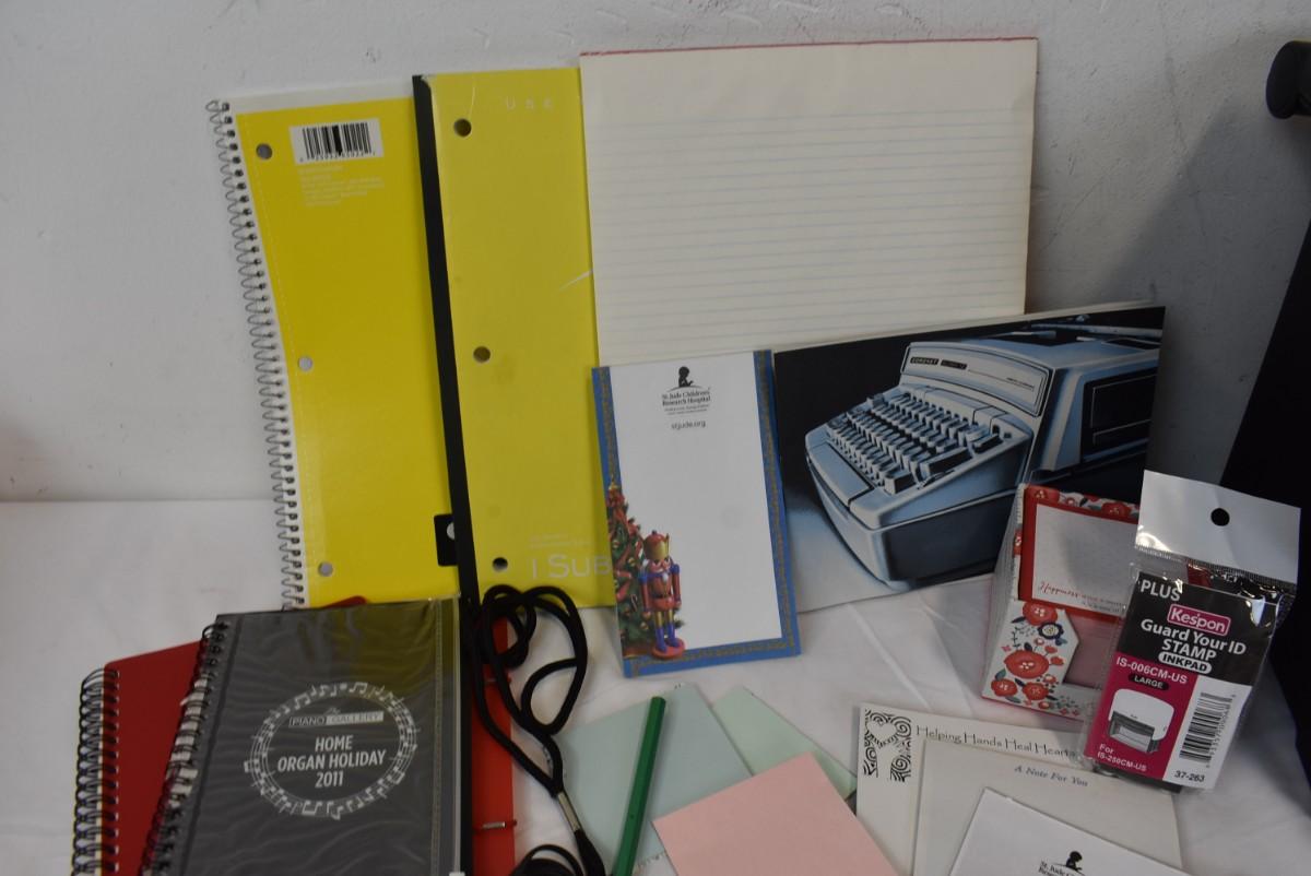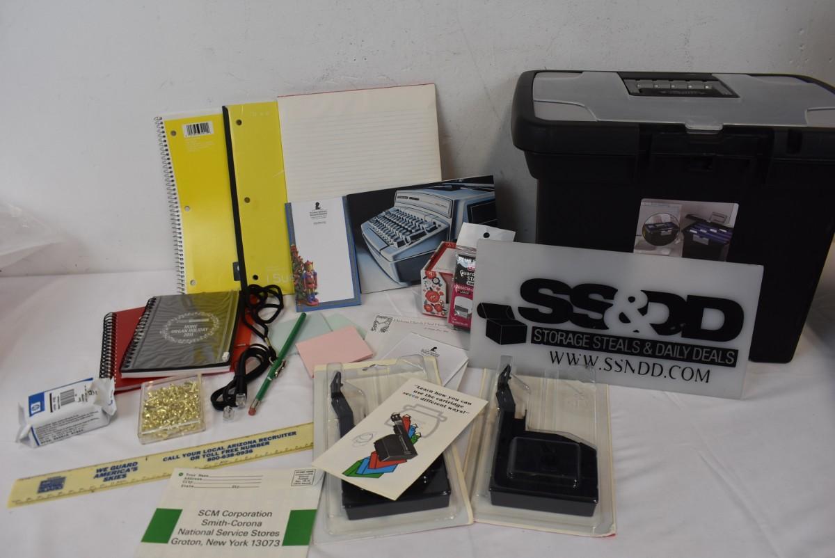 23 pc Office/School Supplies: Notebooks, Ink Cartridges, Ruler, Sterilite Bucket Front Clasp Broken