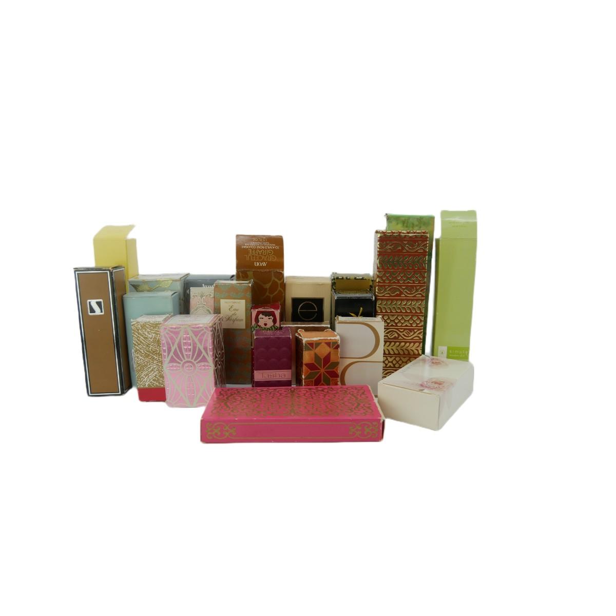 Lot of 22 Vintage Avon perfumes and 1 powder sachet. All in original boxes, varying conditions. All mostly full with product. Lot weighs 8 lbs. (F34)