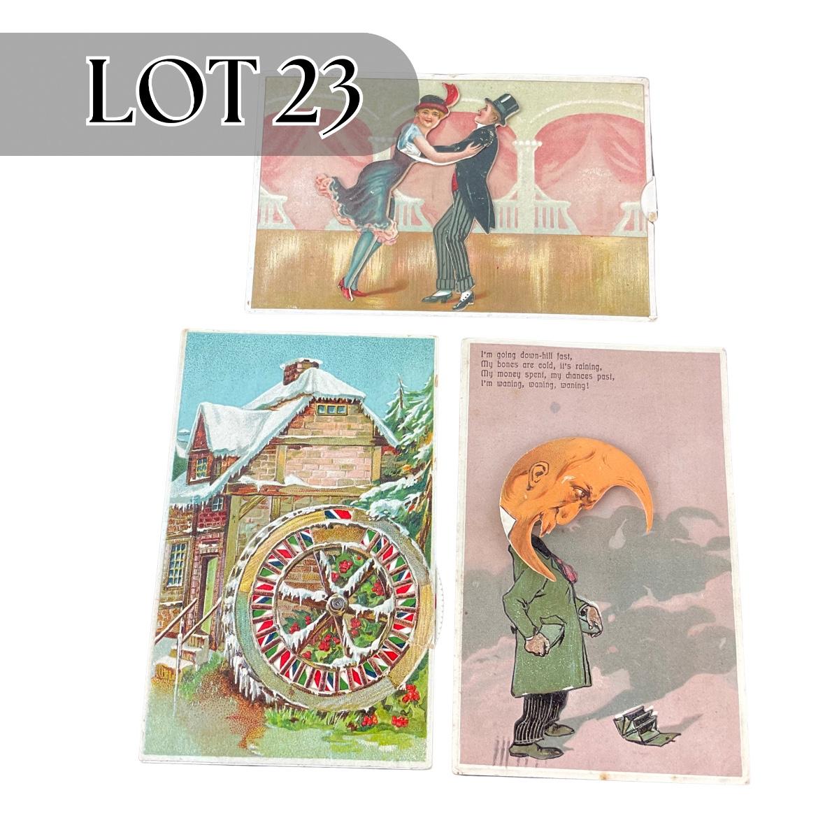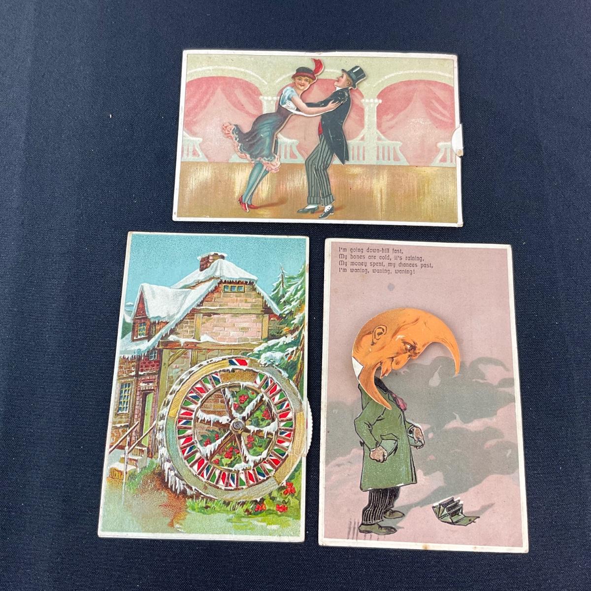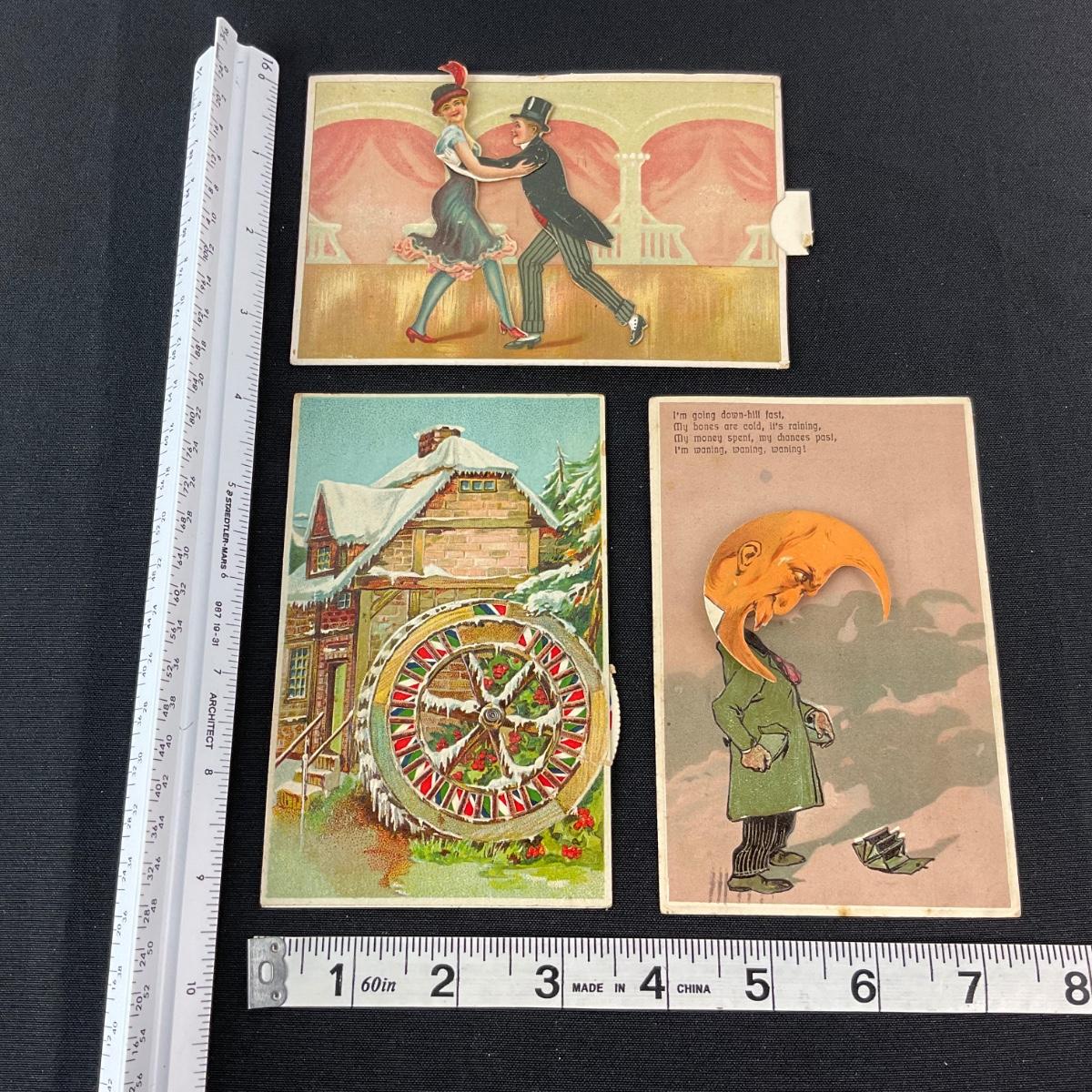 Three vintage interactive postcards that appear to be working and or in good shape. Please see photos for details and condition. Any condition statement is given as a courtesy to a client, is an opinion, and should not be treated as a statement of fact. Reference to condition written, oral or within a condition report shall not be regarded as a full account of condition and may not include all defects, alterations, or restorations. Absence of a condition report does not imply a lot is flawless or lacking imperfections or damage. Katherine’s Auction & Appraisal Service shall have no responsibility for any error or omission. Returns shall not be accepted on the basis of condition. ::: Shipping is available on this lot. If you require shipping you must let us know at the close of the auction. We will coordinate with you after the item has been won. Shipping fees will include insurance up to or exceeding the value of all items being mailed. If you have any questions regarding this lot please contact the auctioneer either via this website, by direct email or by phone. PICK UP TIMES and other important information can be found in the TERMS and DESCRIPTION of the auction. Please take a look for pertinent information. Thanks!