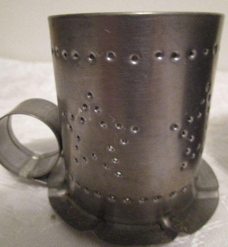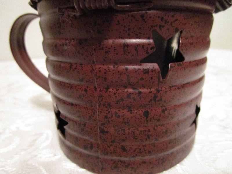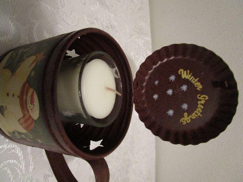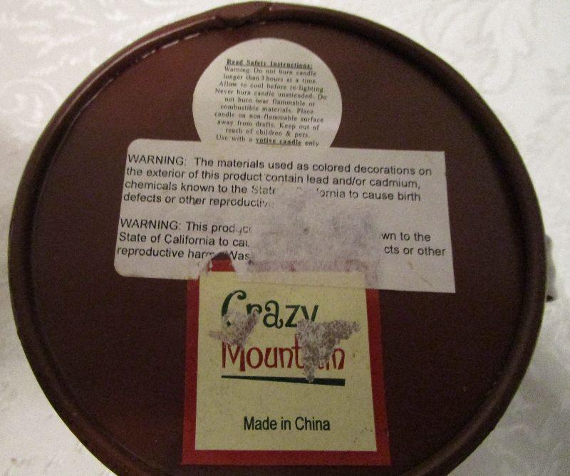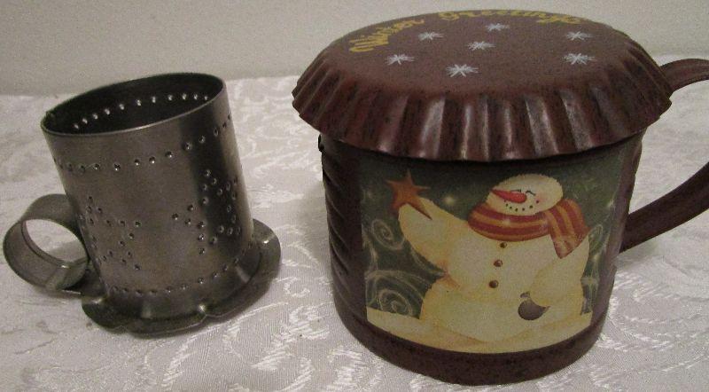Crazy Mountain brand brown with Snowman, Winter Greetings and lid; Miniature tin cup with designs