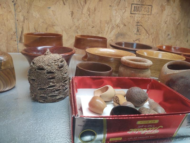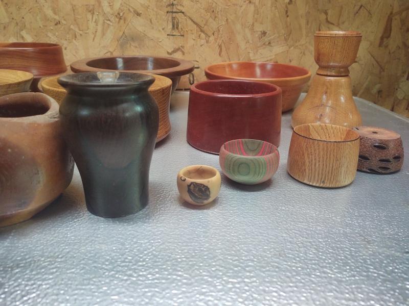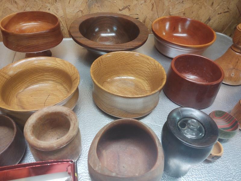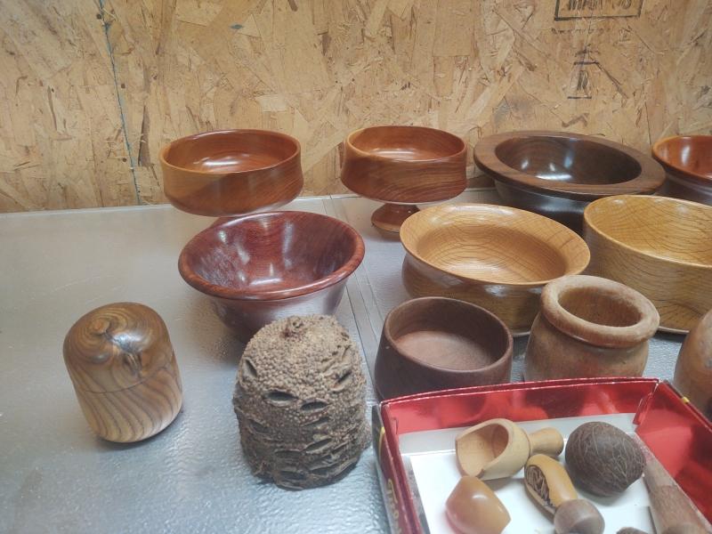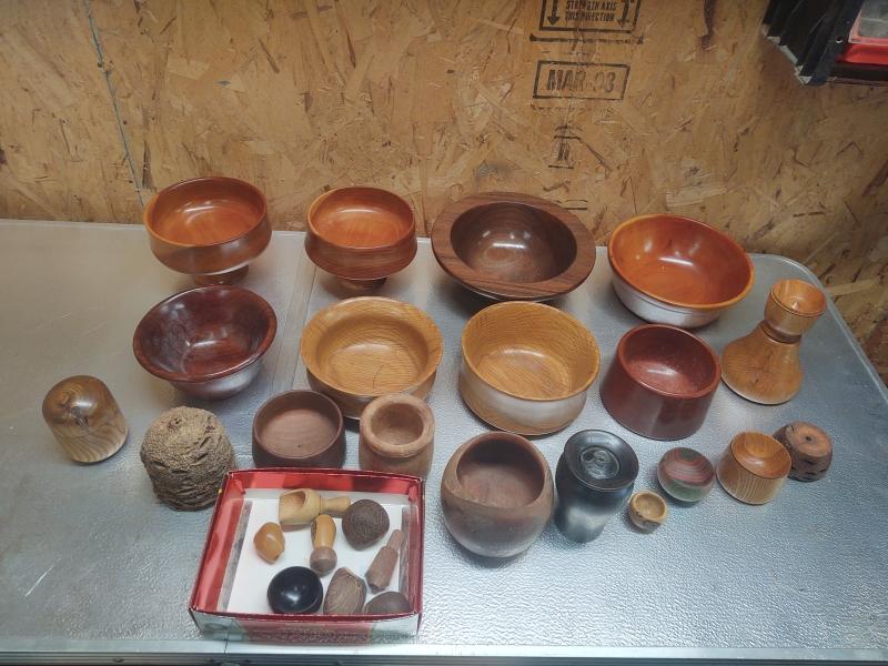This is a very large lot of wood turnings. Most are finished, but some are not. There are a couple of bowls turned out of exotic wood. Some of these could sell for quite a bit individually.