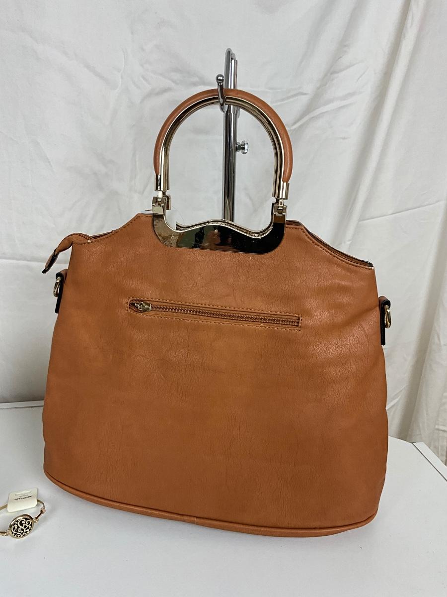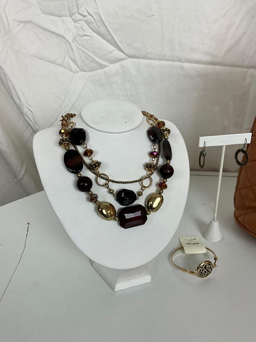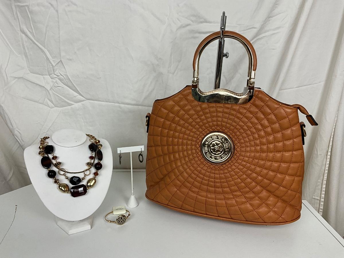 230 Brown Designer Style Handbag with Statement Necklace / Gold Bracelet/ Earrings