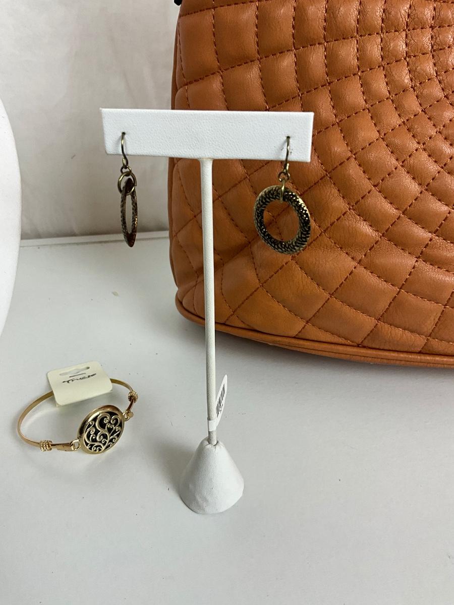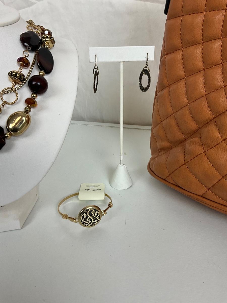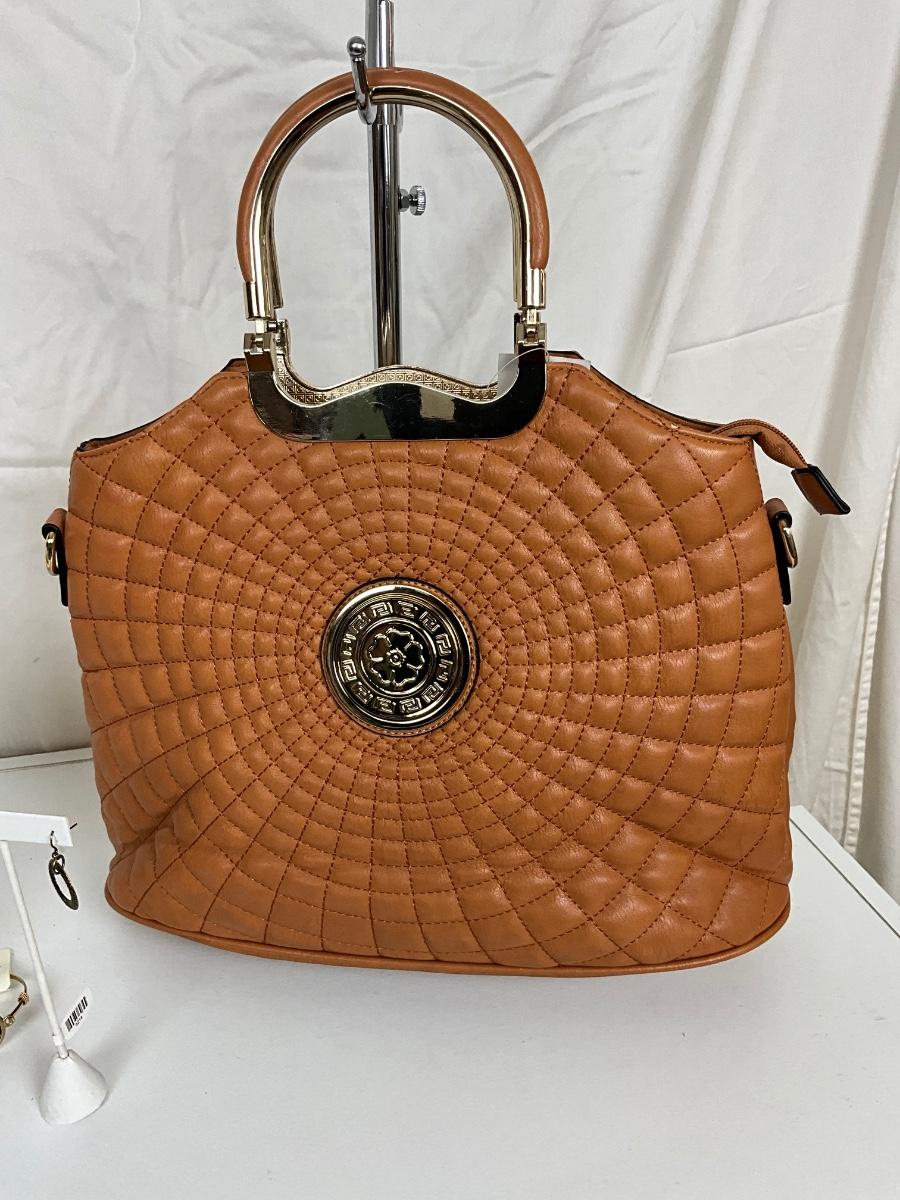 230 Brown Designer Style Handbag with Statement Necklace / Gold Bracelet/ Earrings