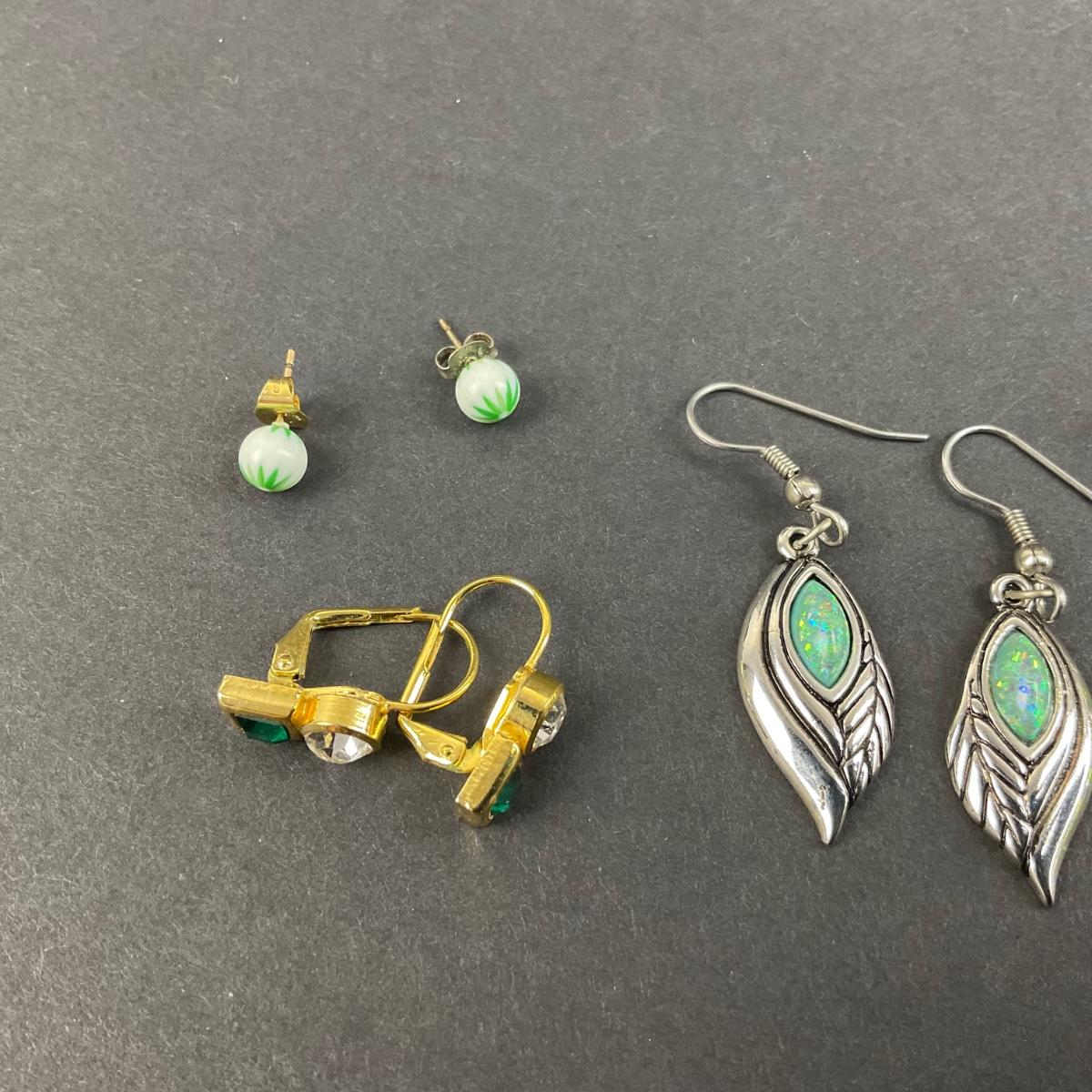 Six pair of assorted green earrings. Please see photos for details and condition. Any condition statement is given as a courtesy to a client, is an opinion, and should not be treated as a statement of fact. Reference to condition written, oral or within a condition report shall not be regarded as a full account of condition and may not include all defects, alterations, or restorations. Absence of a condition report does not imply a lot is flawless or lacking imperfections or damage. Katherine’s Auction & Appraisal Service shall have no responsibility for any error or omission. Returns shall not be accepted on the basis of condition. ::: Shipping is available on this lot. If you require shipping you must let us know at the close of the auction. We will coordinate with you after the item has been won. Shipping fees will include insurance up to or exceeding the value of all items being mailed. If you have any questions regarding this lot please contact the auctioneer either via this website, by direct email or by phone. PICK UP TIMES and other important information can be found in the TERMS and DESCRIPTION of the auction. Please take a look for pertinent information. Thanks!