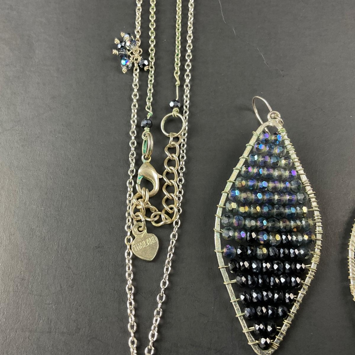One three piece set of necklace with blue beaded pendant and one pair of blue beaded earrings. Marked Thailand. This piece has no damage, and appears to be in great shape with no visable chips, cracks, or broken pieces. Please see photos for details and condition. Any condition statement is given as a courtesy to a client, is an opinion, and should not be treated as a statement of fact. Reference to condition written, oral or within a condition report shall not be regarded as a full account of condition and may not include all defects, alterations, or restorations. Absence of a condition report does not imply a lot is flawless or lacking imperfections or damage. Katherine’s Auction & Appraisal Service shall have no responsibility for any error or omission. Returns shall not be accepted on the basis of condition. ::: Shipping is available on this lot. If you require shipping you must let us know at the close of the auction. We will coordinate with you after the item has been won. Shipping fees will include insurance up to or exceeding the value of all items being mailed. If you have any questions regarding this lot please contact the auctioneer either via this website, by direct email or by phone. PICK UP TIMES and other important information can be found in the TERMS and DESCRIPTION of the auction. Please take a look for pertinent information. Thanks!
