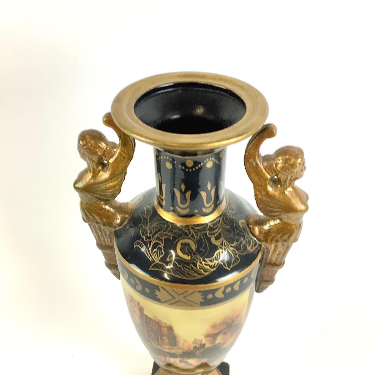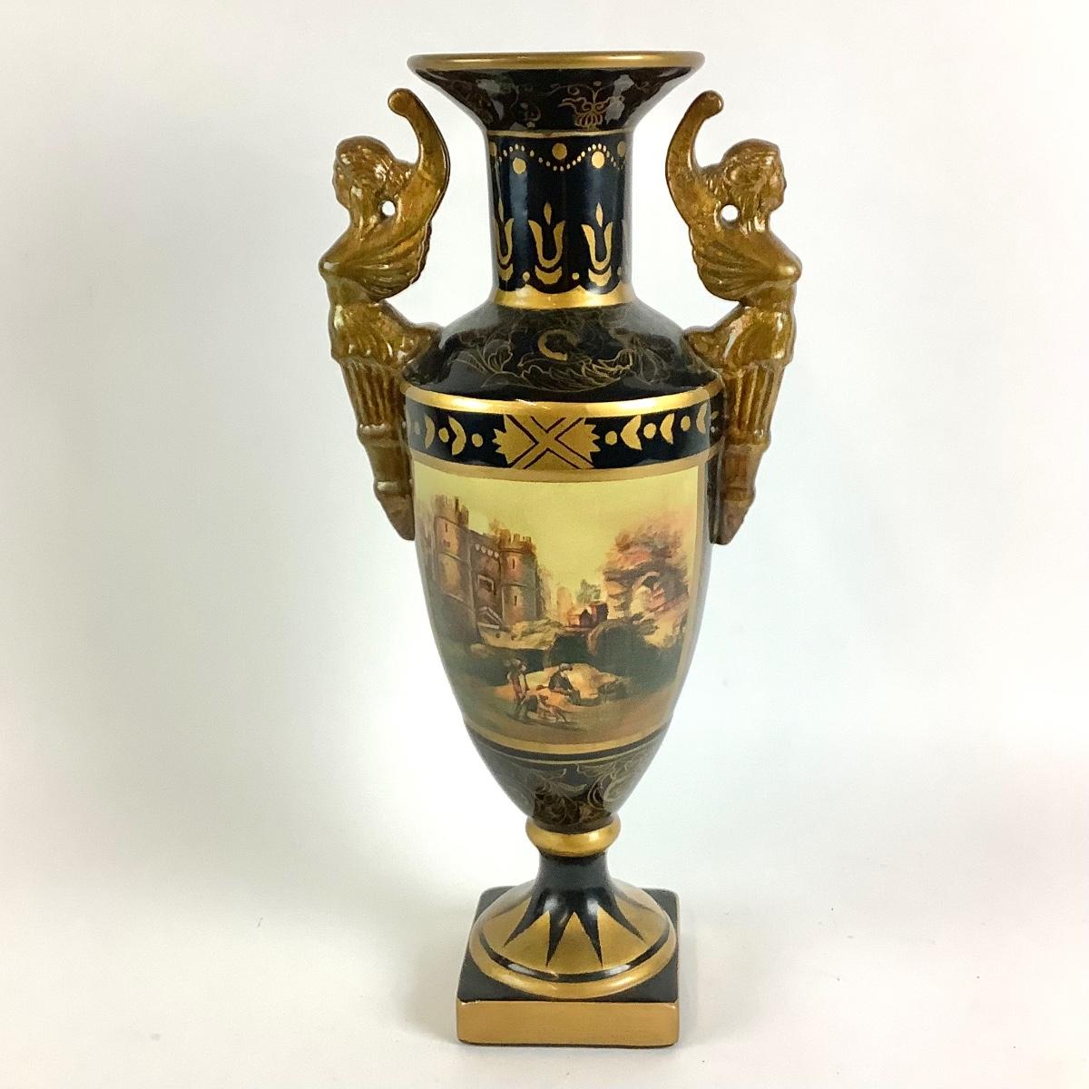 Black and gold Grecian urn / vase with hand painted street scene and gilded female figural cariatid handles. Excellent condition. Measures 18.5"H, 8.5"W, 6.5"D, base is 4.5" x 4.5".