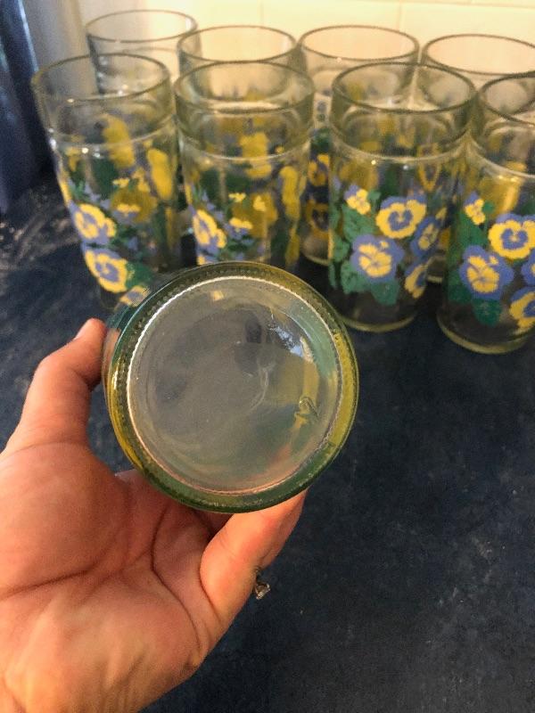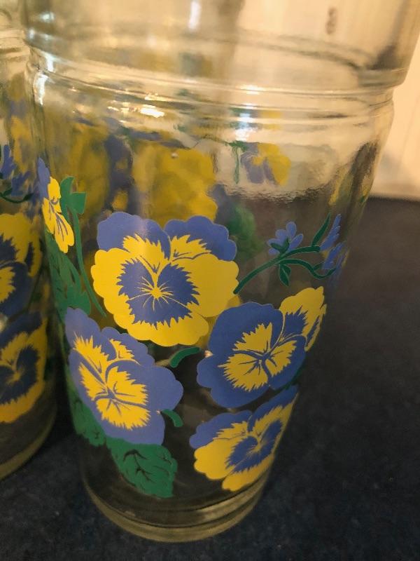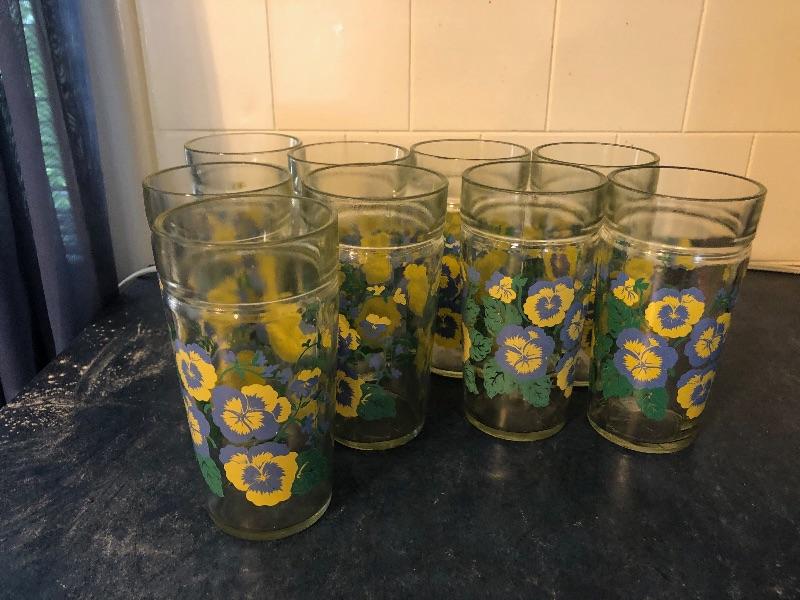 Set of nine drinking glasses with pansies. Good used condition no cracks or chips. Great condition. This is an ONSITE Auction all items will need to be picked up on location. Please see auction description for pick up procedures.