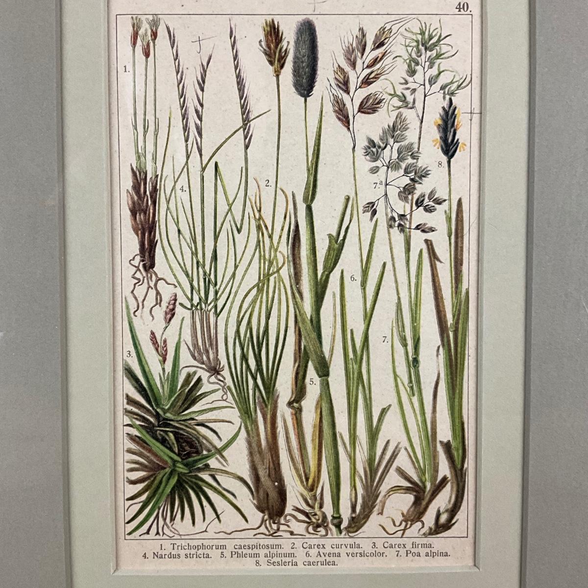 Pair of antique botanical engravings, hand-colored, depicting various ferns, grasses, and herbaceous plants. Originally produced as scientific book plates for botanical study, showing detailed root systems, fronds, and seed heads with Latin nomenclature. Likely late 18th to early 19th century examples or later restrikes.