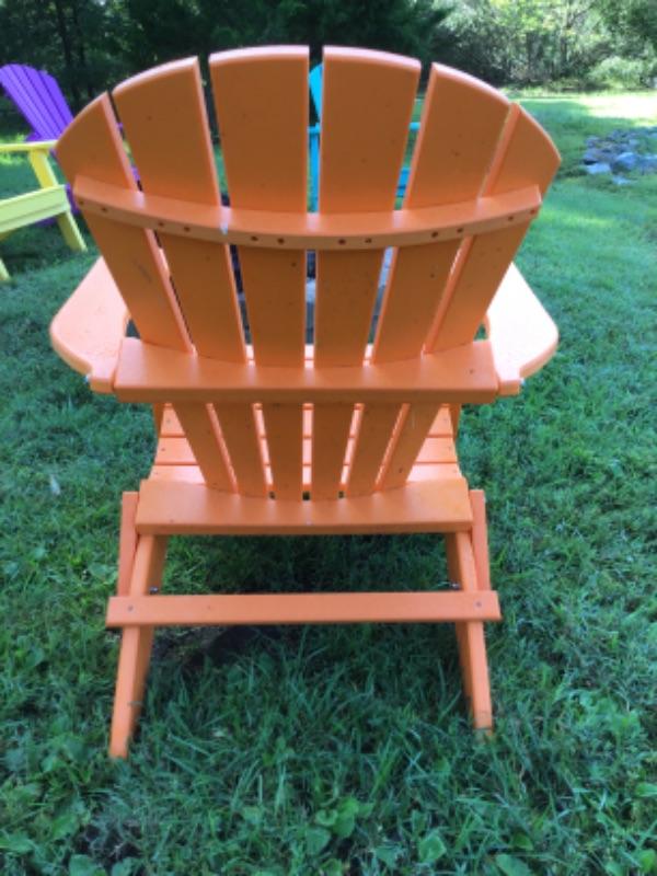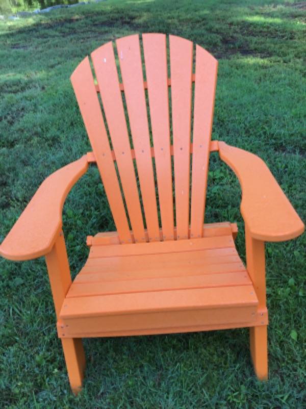 Orange Poly Resin Folding Adirondack Chair measuring 37.5” tall x 31.5” wide x 32.5” deep with seat height 15”