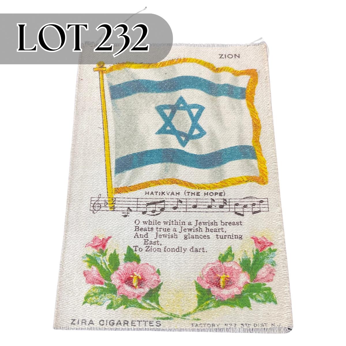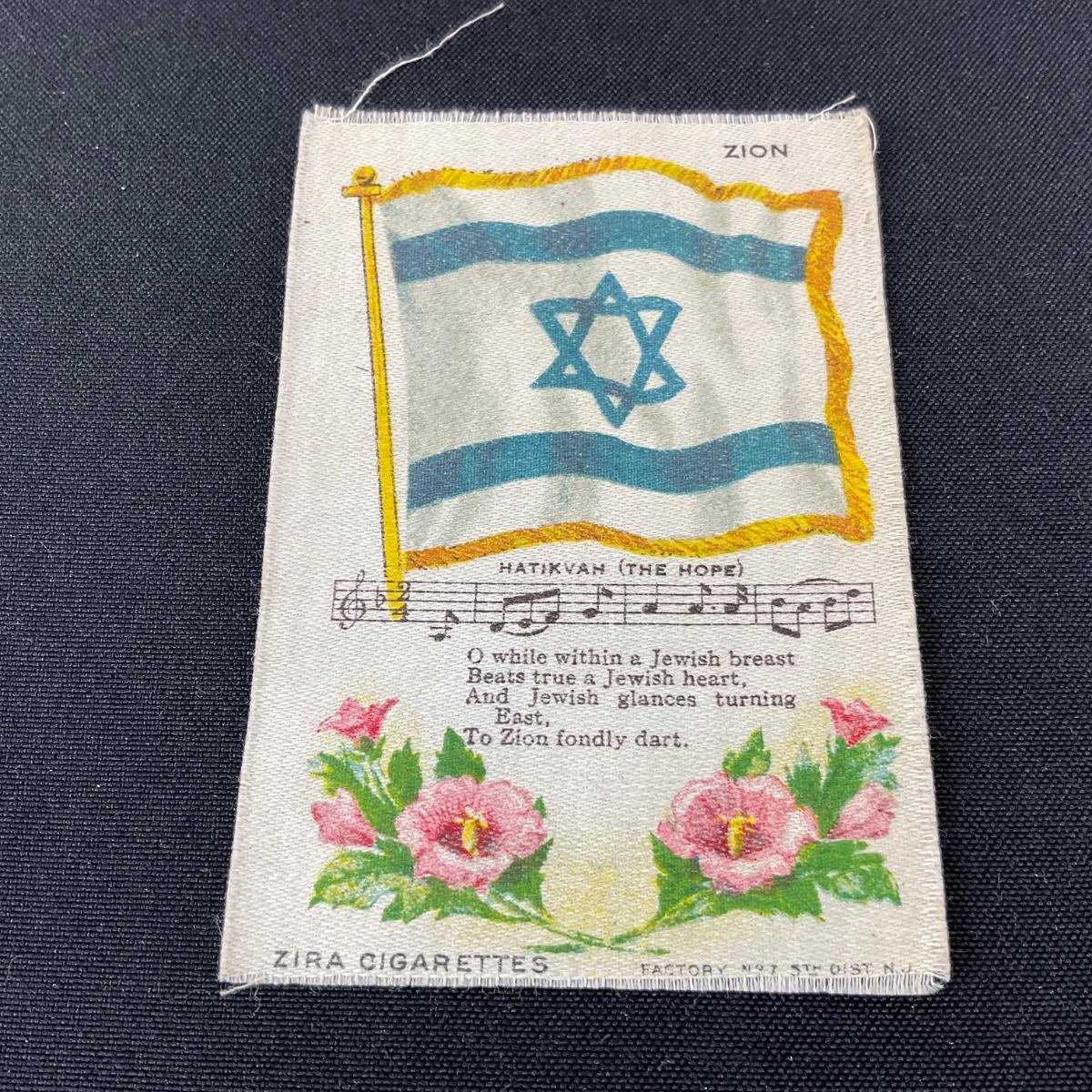 One tobacco Zion hatikvah (the hope) zira cigarette silk. Please see photos for details and condition. Any condition statement is given as a courtesy to a client, is an opinion, and should not be treated as a statement of fact. Reference to condition written, oral or within a condition report shall not be regarded as a full account of condition and may not include all defects, alterations, or restorations. Absence of a condition report does not imply a lot is flawless or lacking imperfections or damage. Katherine’s Auction & Appraisal Service shall have no responsibility for any error or omission. Returns shall not be accepted on the basis of condition. ::: Shipping is available on this lot. If you require shipping you must let us know at the close of the auction. We will coordinate with you after the item has been won. Shipping fees will include insurance up to or exceeding the value of all items being mailed. If you have any questions regarding this lot please contact the auctioneer either via this website, by direct email or by phone. PICK UP TIMES and other important information can be found in the TERMS and DESCRIPTION of the auction. Please take a look for pertinent information. Thanks!