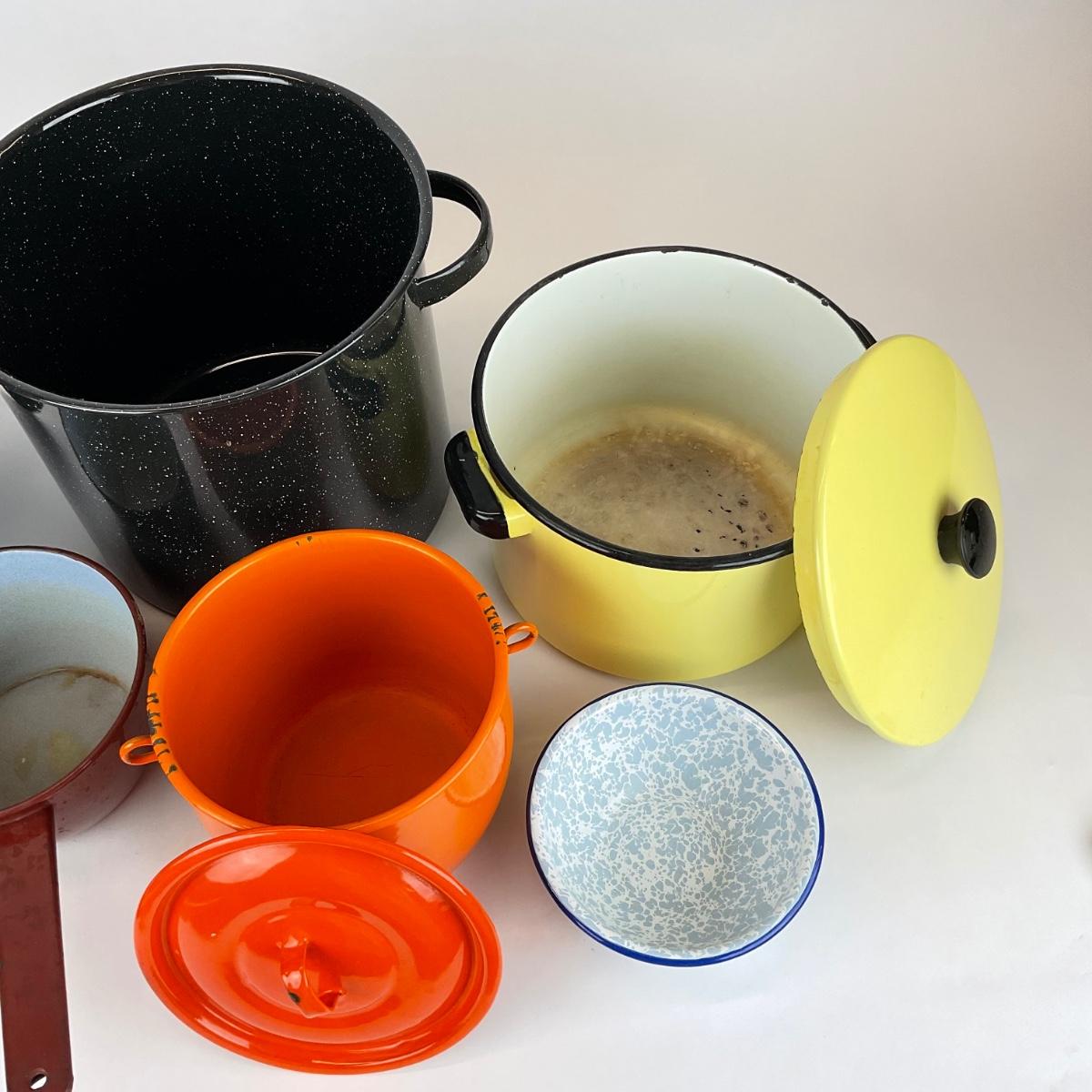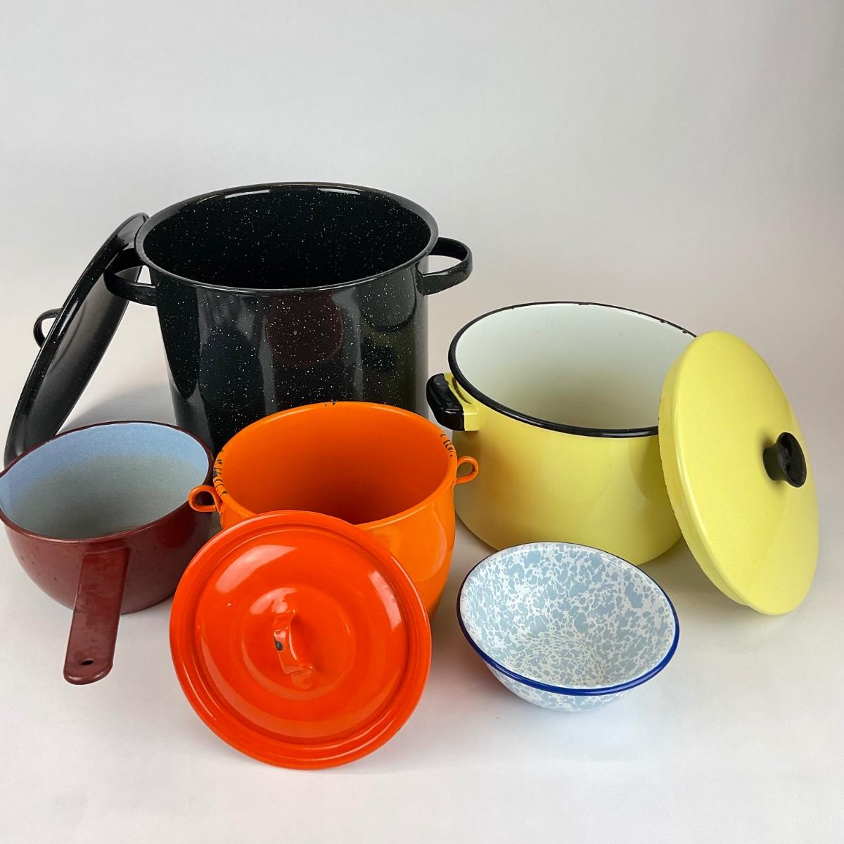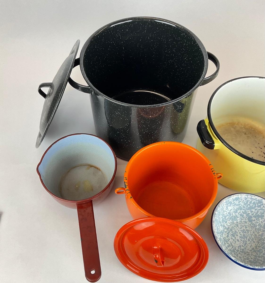 Comes included are a steamer pot, 2 handled pots, a small pot, and a spatterware bowl.
