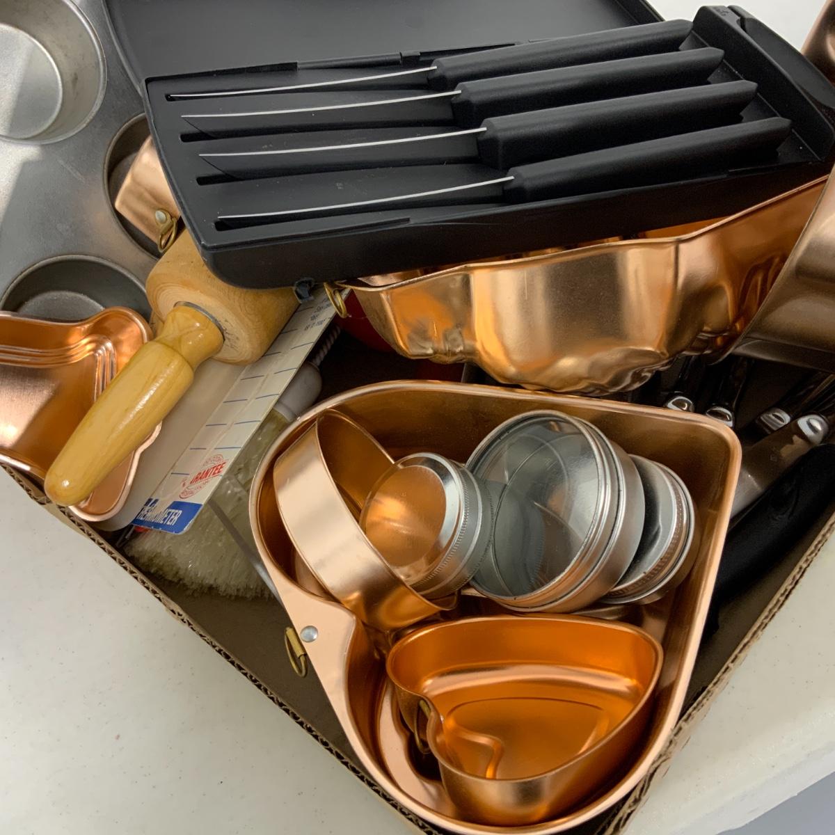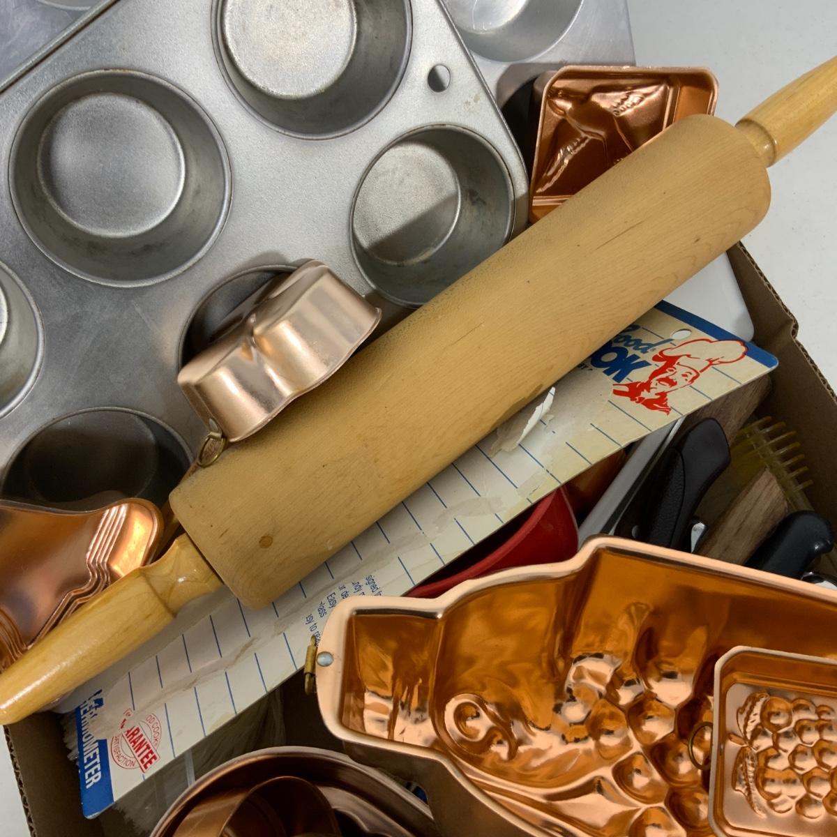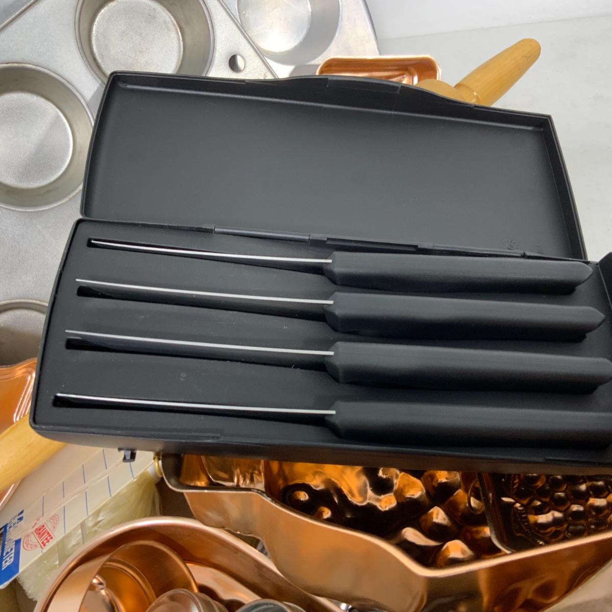 From the Estate of Peter and Alice Radovanovich: A nice mixed lot of Bakeware and Kitchen Items. Lots of copper jello molds for use or decoration and a set of Pampered Chef Steak Knives. Please see photos for details and condition. ::: Shipping is NOT available on this lot. If you have any questions regarding this lot please contact the auctioneer either via this website, by direct email or by phone. PICK UP TIMES and other important information can be found in the TERMS and DESCRIPTION of the auction. Please take a look for pertinent information. Thanks!