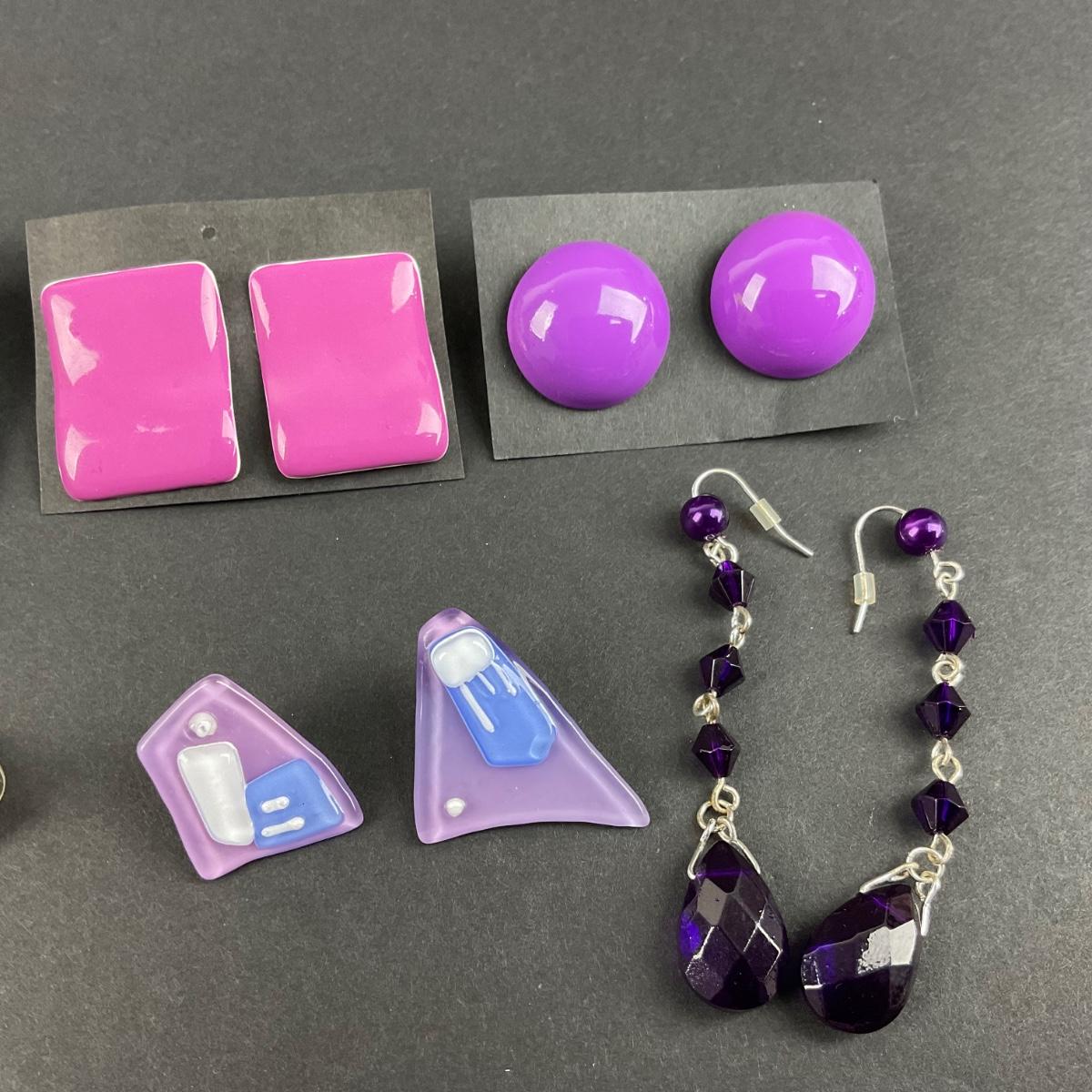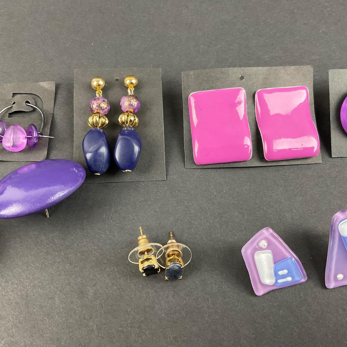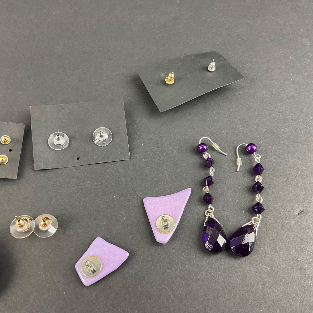 Eight pair of assorted purple earrings. Please see photos for details and condition. Any condition statement is given as a courtesy to a client, is an opinion, and should not be treated as a statement of fact. Reference to condition written, oral or within a condition report shall not be regarded as a full account of condition and may not include all defects, alterations, or restorations. Absence of a condition report does not imply a lot is flawless or lacking imperfections or damage. Katherine’s Auction & Appraisal Service shall have no responsibility for any error or omission. Returns shall not be accepted on the basis of condition. ::: Shipping is available on this lot. If you require shipping you must let us know at the close of the auction. We will coordinate with you after the item has been won. Shipping fees will include insurance up to or exceeding the value of all items being mailed. If you have any questions regarding this lot please contact the auctioneer either via this website, by direct email or by phone. PICK UP TIMES and other important information can be found in the TERMS and DESCRIPTION of the auction. Please take a look for pertinent information. Thanks!