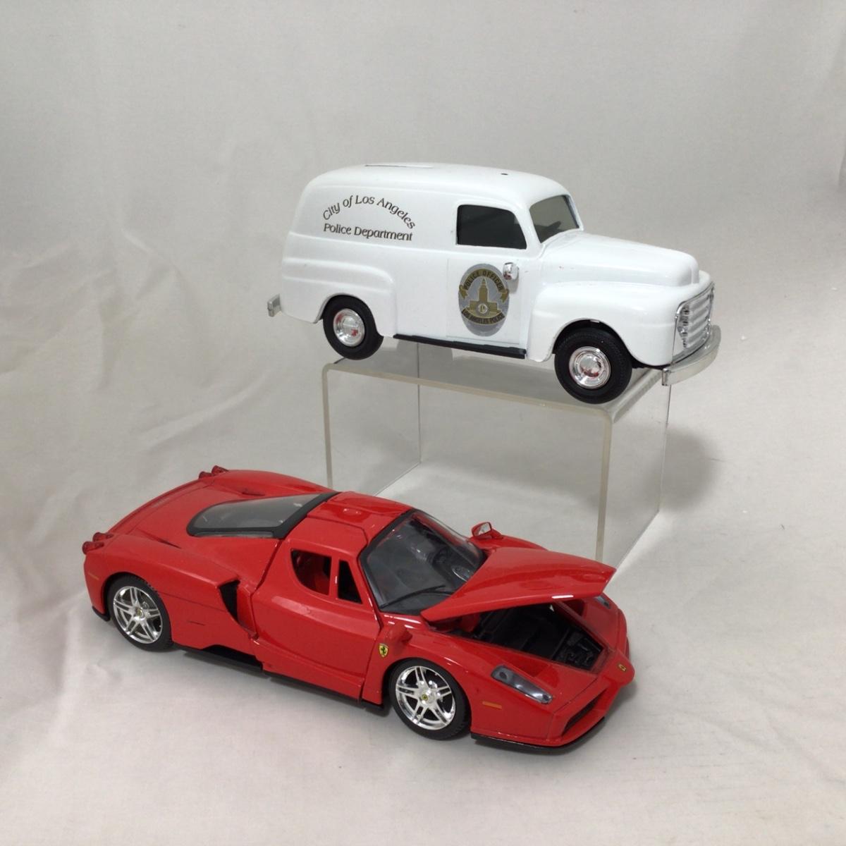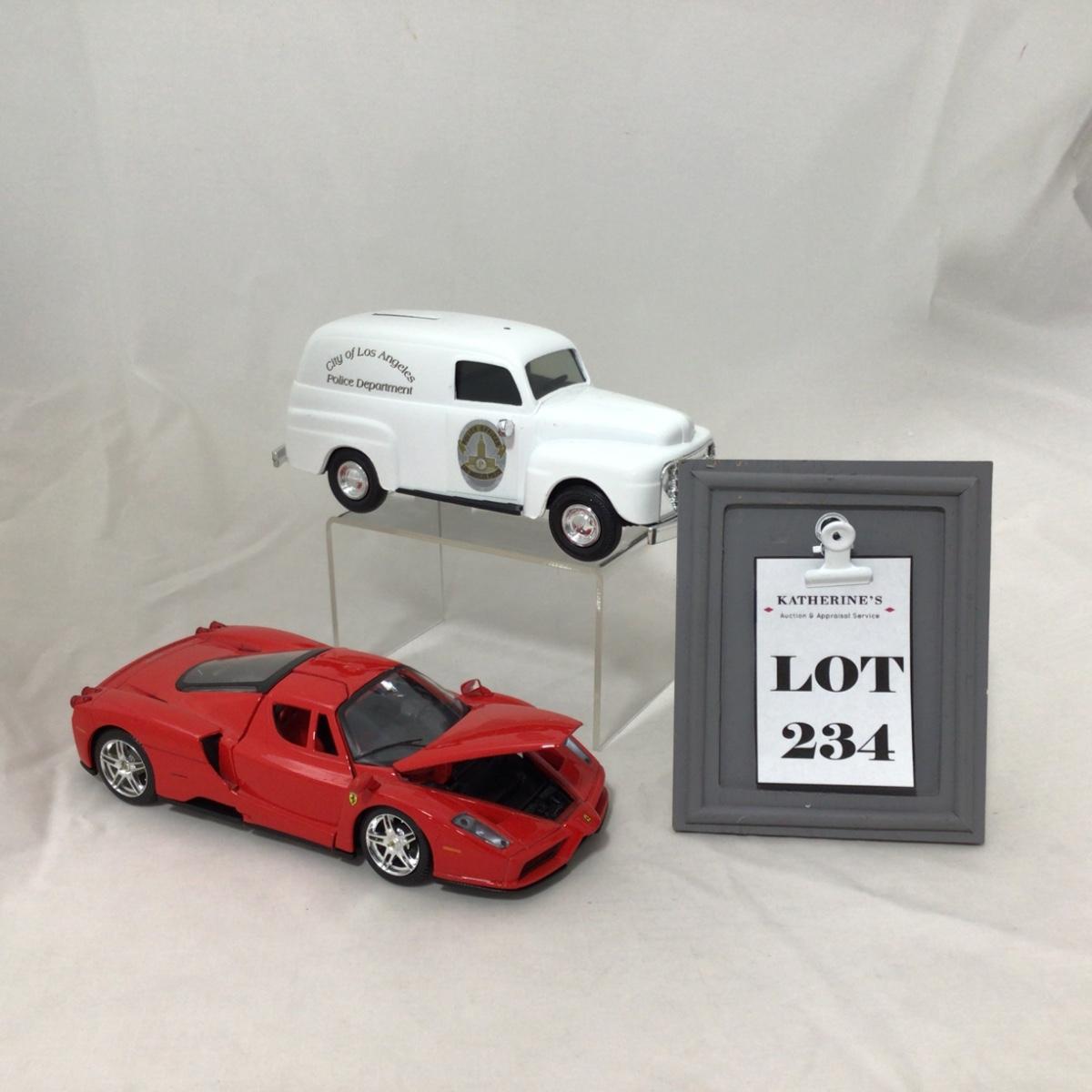 Two Die cast 1/24 scale cars. One is a maisto enzo Ferrari the other is a Ertl 1950 ford panel van bank with a key. Please see photos for details and condition. ::: Shipping is available on this lot. If you require shipping you must let us know at the close of the auction. We will coordinate with you after the item has been won. Shipping fees will include insurance up to or exceeding the value of all items being mailed. If you have any questions regarding this lot please contact the auctioneer either via this website, by direct email or by phone. PICK UP TIMES and other important information can be found in the TERMS and DESCRIPTION of the auction. Please take a look for pertinent information. Thanks!