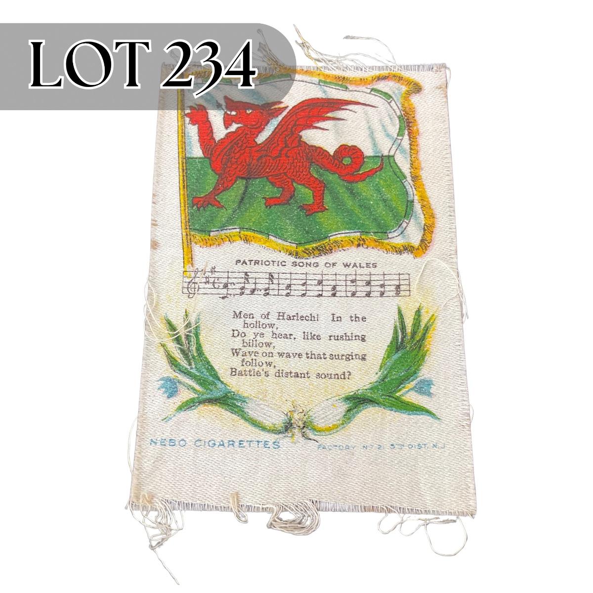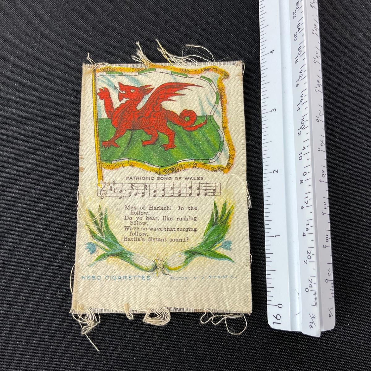 One tobacco patriotic song of wales nebo cigarettes silk. Please see photos for details and condition. Any condition statement is given as a courtesy to a client, is an opinion, and should not be treated as a statement of fact. Reference to condition written, oral or within a condition report shall not be regarded as a full account of condition and may not include all defects, alterations, or restorations. Absence of a condition report does not imply a lot is flawless or lacking imperfections or damage. Katherine’s Auction & Appraisal Service shall have no responsibility for any error or omission. Returns shall not be accepted on the basis of condition. ::: Shipping is available on this lot. If you require shipping you must let us know at the close of the auction. We will coordinate with you after the item has been won. Shipping fees will include insurance up to or exceeding the value of all items being mailed. If you have any questions regarding this lot please contact the auctioneer either via this website, by direct email or by phone. PICK UP TIMES and other important information can be found in the TERMS and DESCRIPTION of the auction. Please take a look for pertinent information. Thanks!