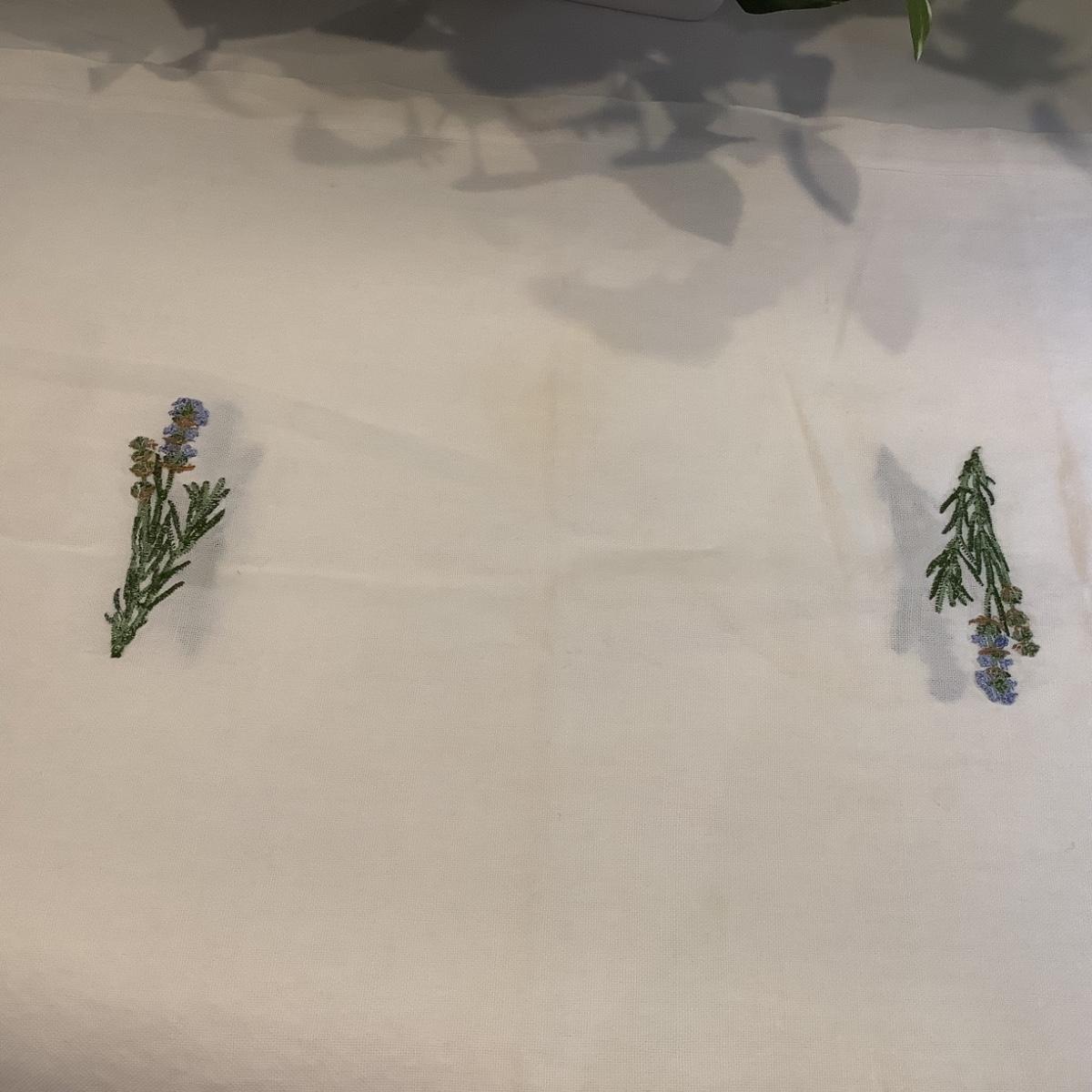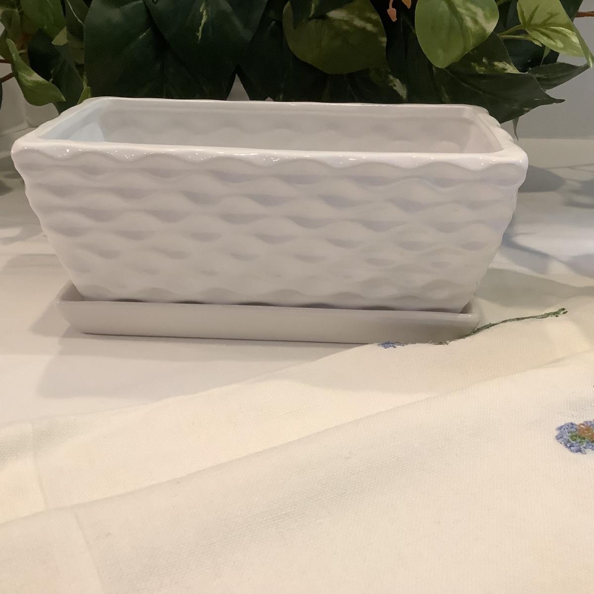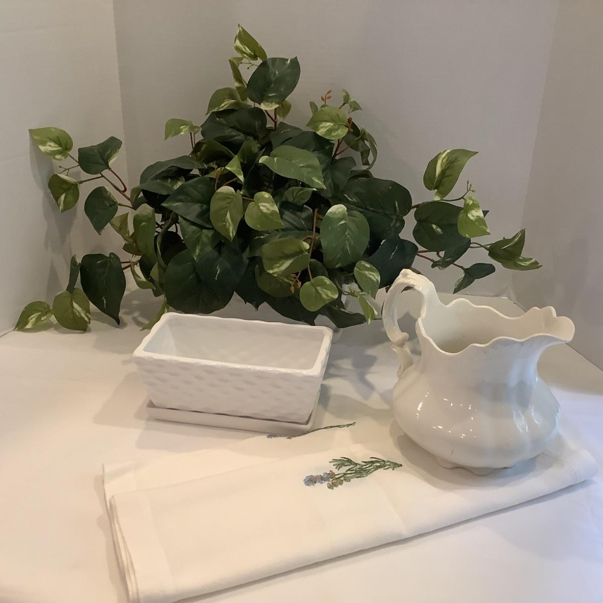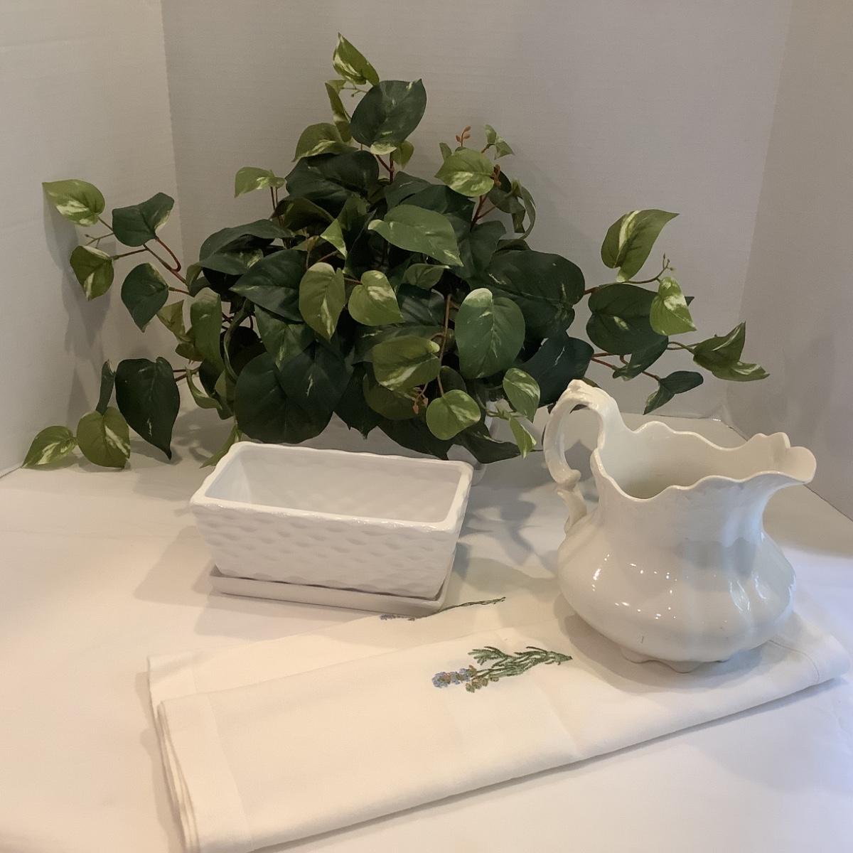 234 Two White Rectangular Planter with Faux Greens and Linen Runner