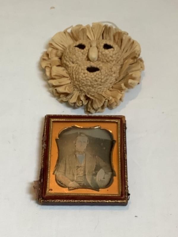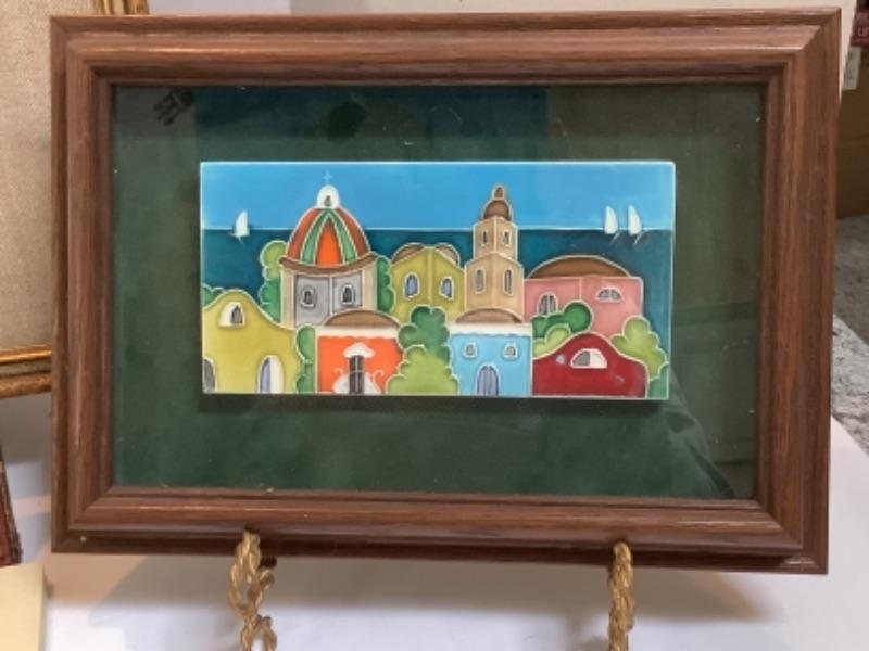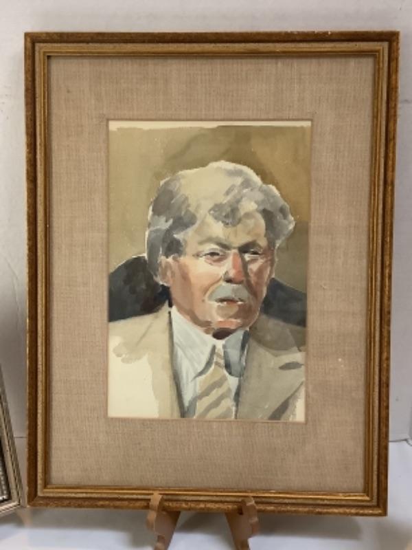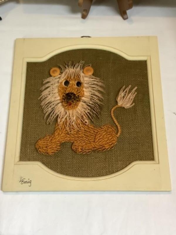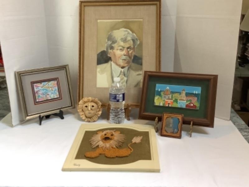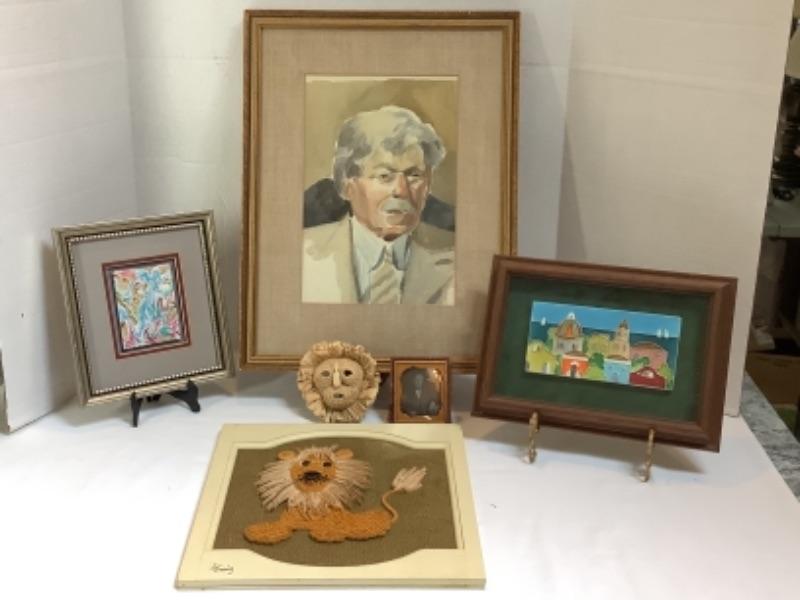 Lot of assorted wall art- Framed L. Emig signed lion art, framed enamel art, framed watercolor portrait of a man, framed painted tile and small wicker lion
