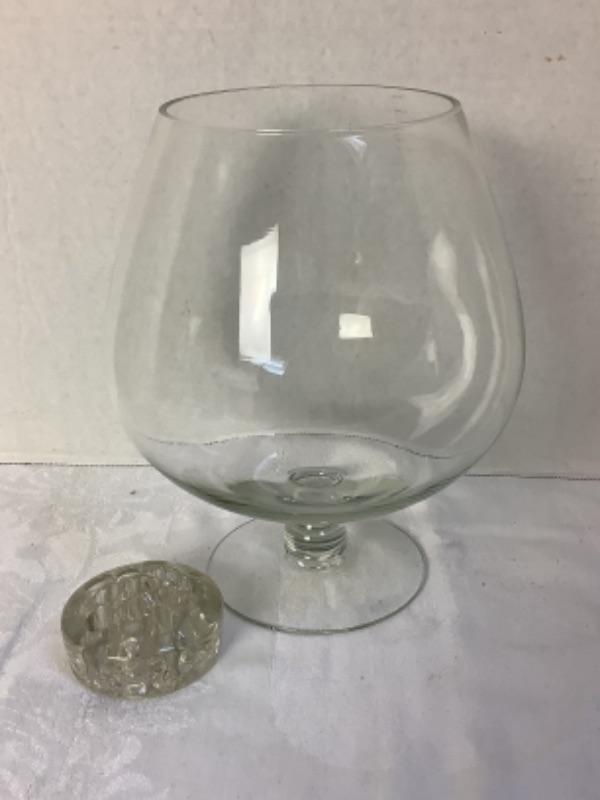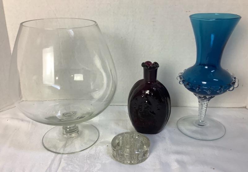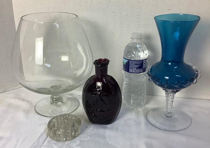 Vintage blue glass pedestal vase with twisted stem, Vintage Albany Glass Wares Amethyst glass bottle, Glass flower frog and an Oversized glass brandy snifter