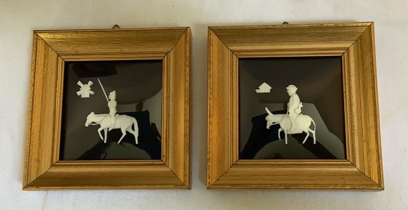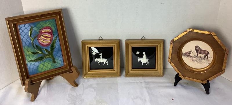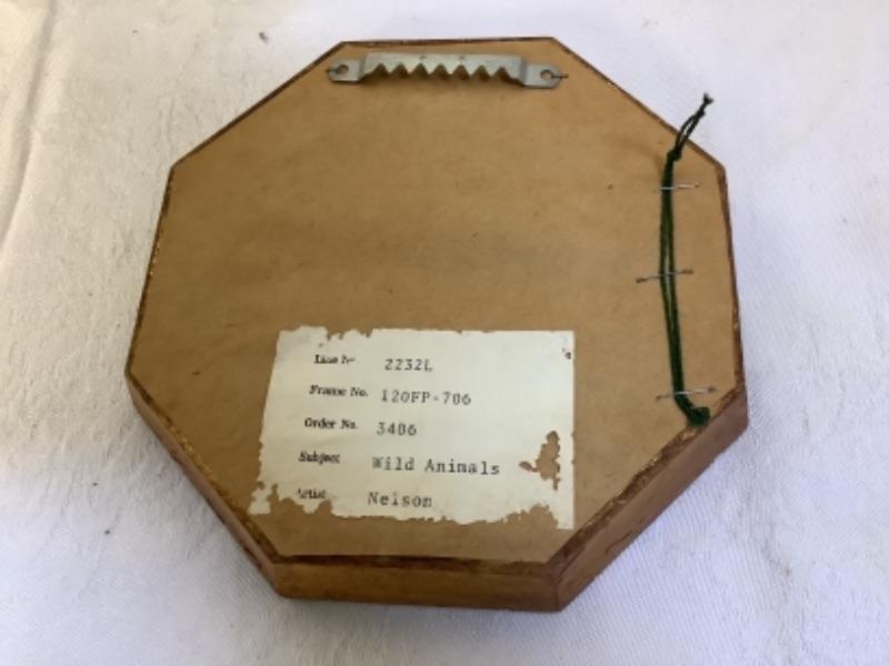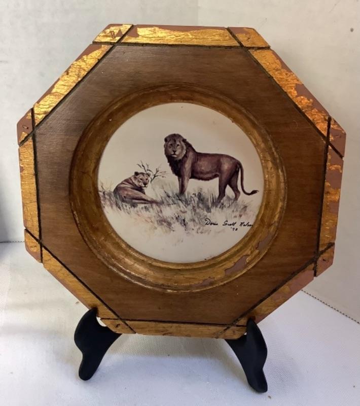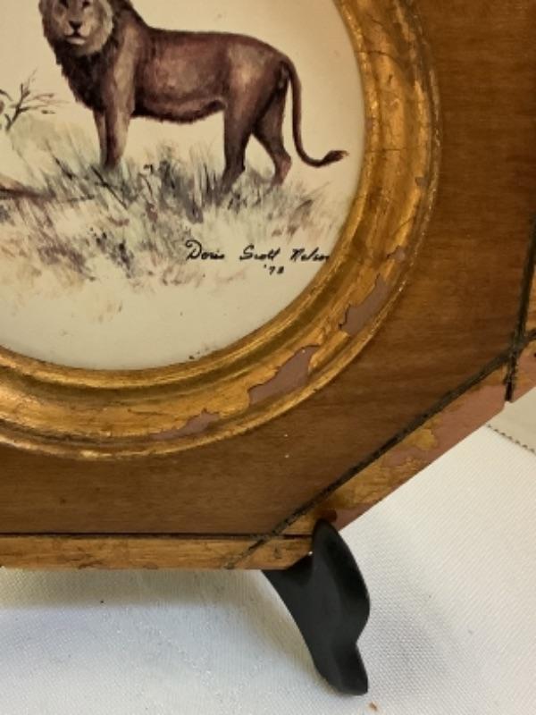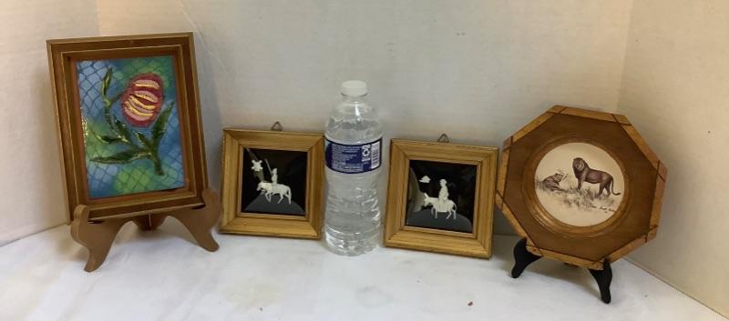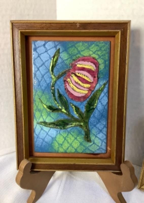 Vintage enamel 3D flower art, Signed Framed Doris Scott Nelson 1973 “Wild Animals” print and Pair of Framed carved bone made in Spain