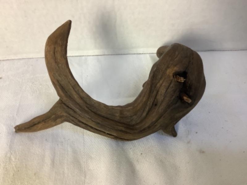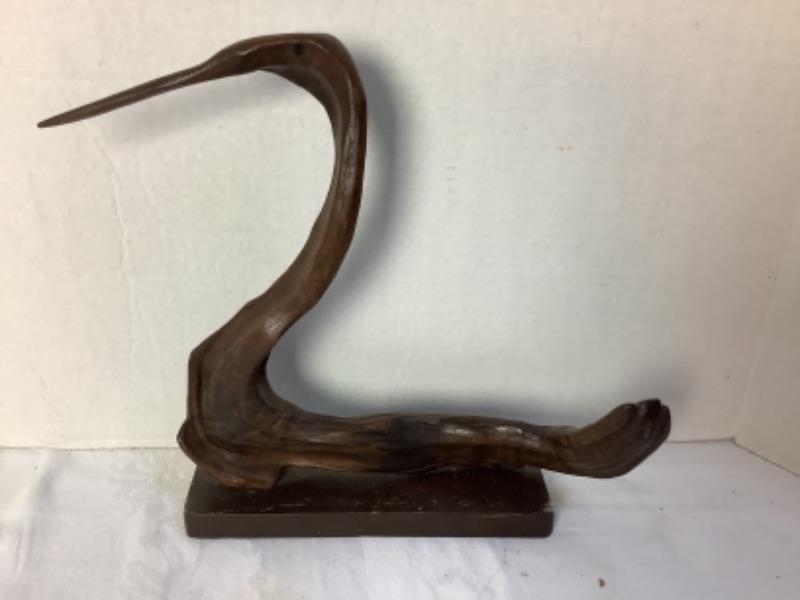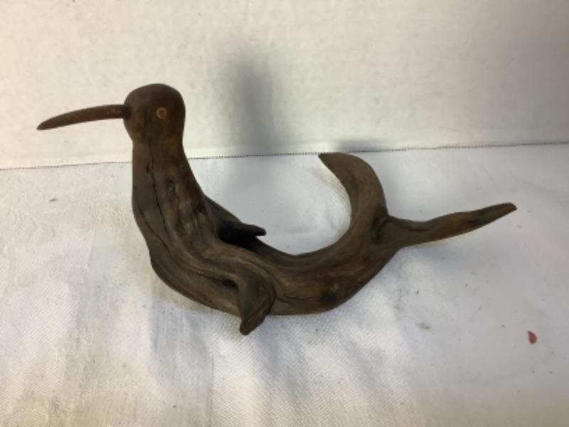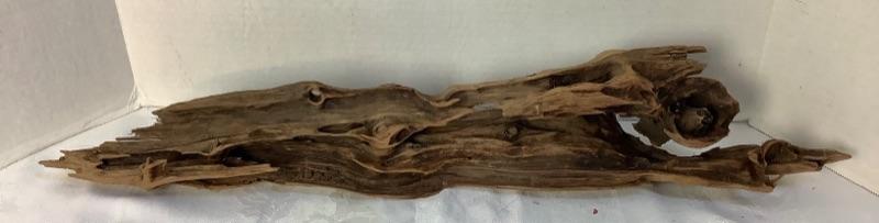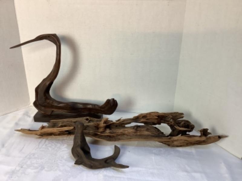 L. Hain driftwood sculpture approximately 13-1/2” tall and 16” wide, small driftwood sculpture 4-1/2” x 7-1/2”, has two broken legs (see photos) and a piece of driftwood approximately 27” long