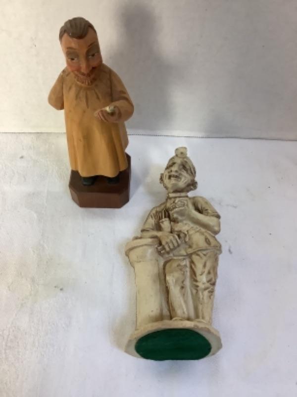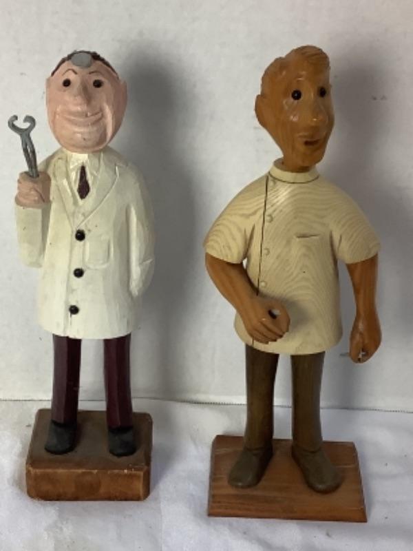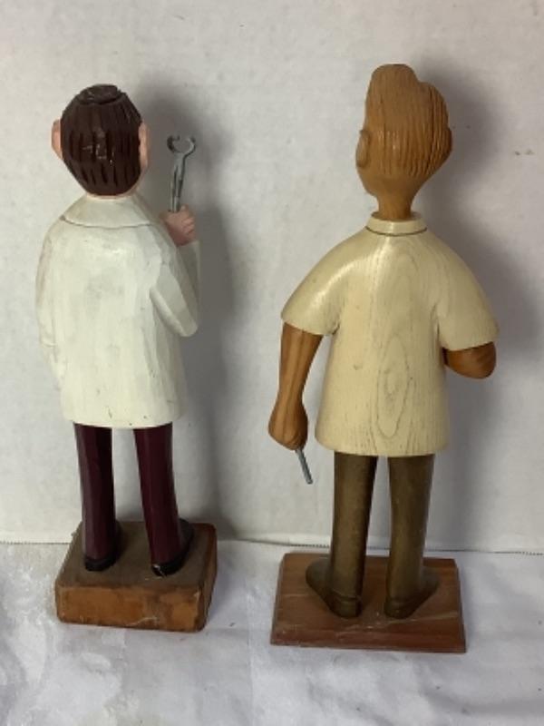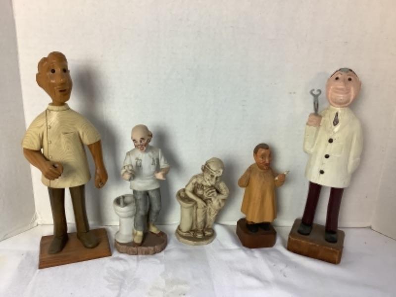 Vintage dentist figurines , Lefton China porcelain dentist, Russ Berrie 1974 composite dentist figurine, three carved wood dentist figurines- 1 is missing a tool from his hand (see photos)