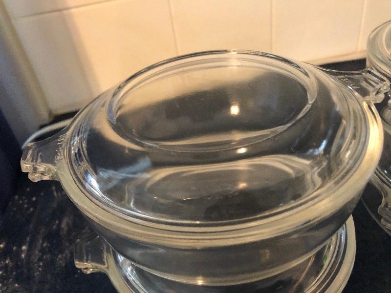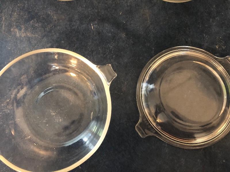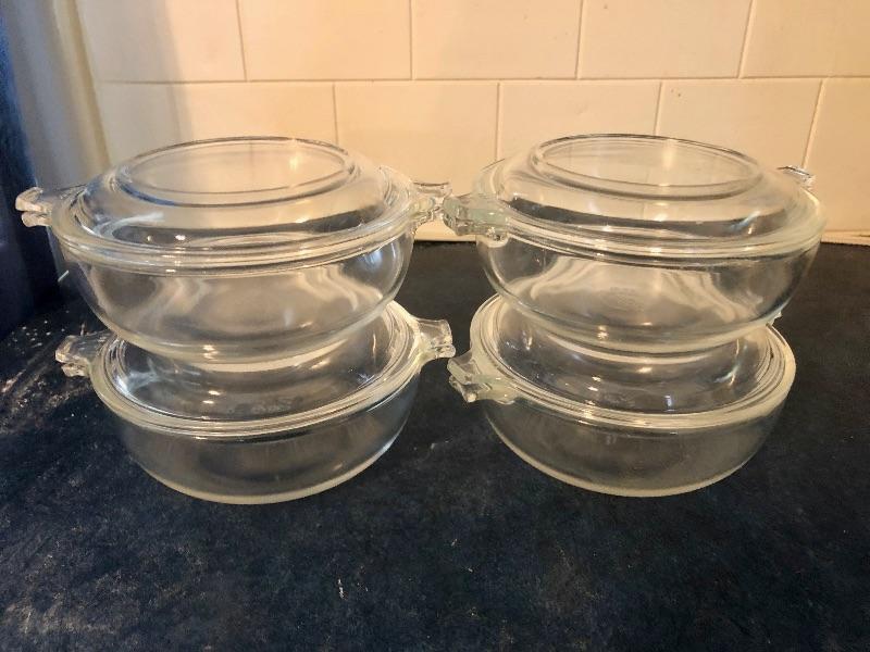 Bundle of four small Pyrex glass speak with lids cracks or chips. Great condition. This is an ONSITE Auction all items will need to be picked up on location. Please see auction description for pick up procedures.