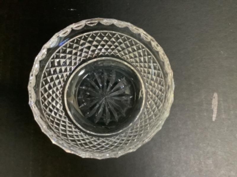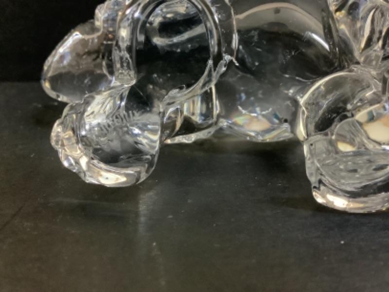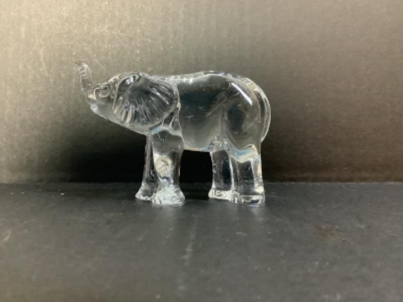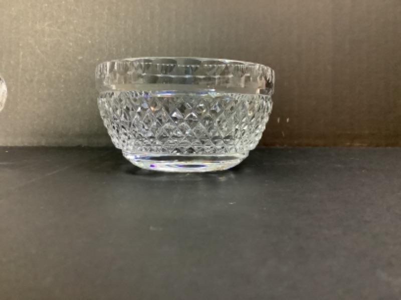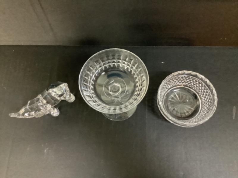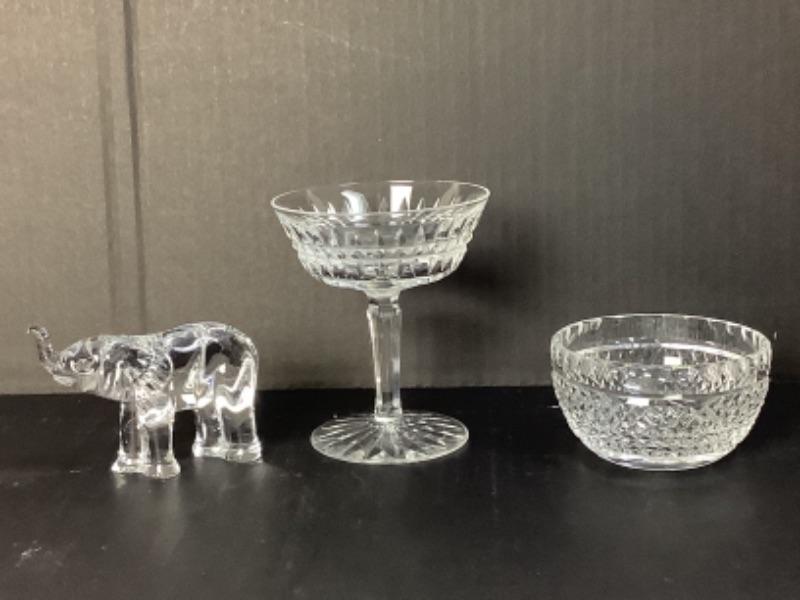 Waterford crystal Elephant approximately 4-1/2” long and 3” tall, Waterford crystal champagne glass 4-3/4” tall and a Waterford crystal bowl 4” round and 2-1/4” deep