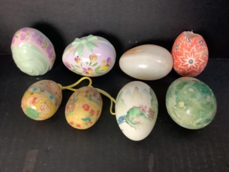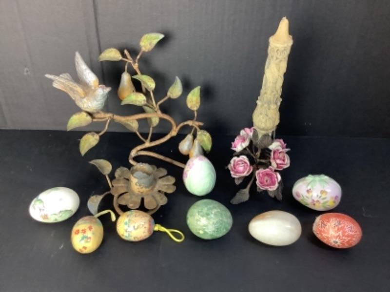 Metal partridge in a pear tree candlestick, metal and porcelain rose candlestick, 8 decorative eggs- 2 marble, 2 porcelain and more