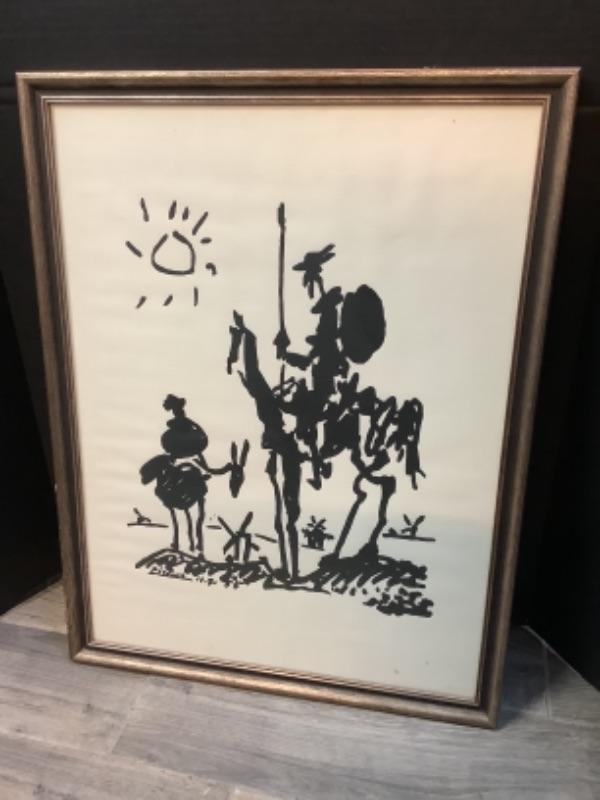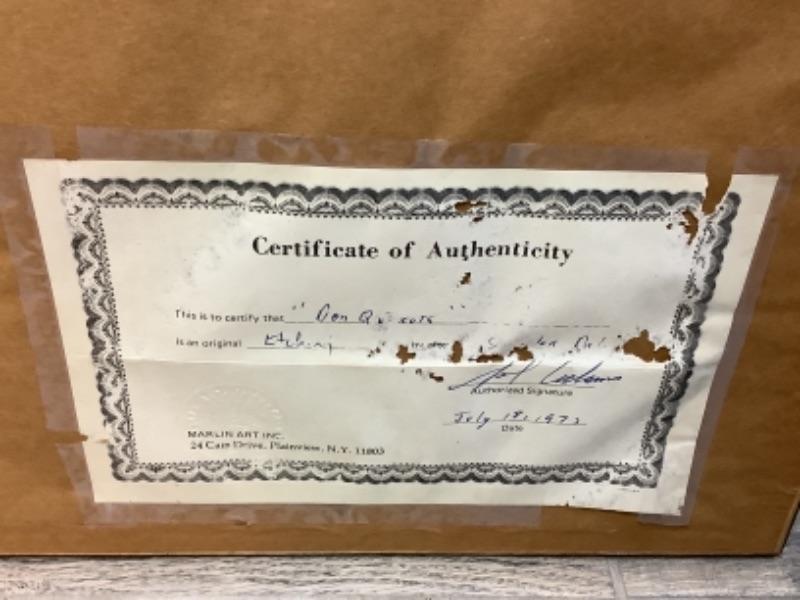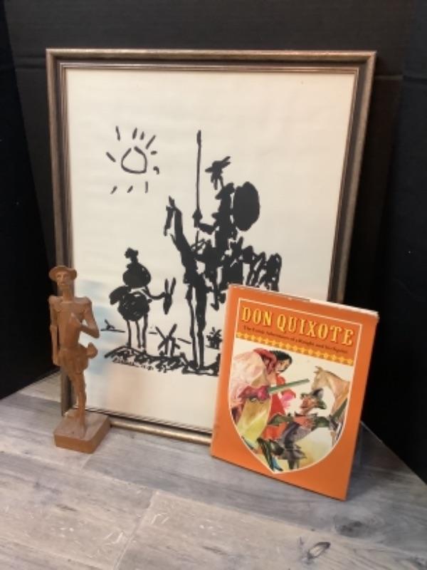 1970’s Don Quixote framed etching by Salvador Dali measures 20” x 19-1/2” and has certificate of authenticity, Don Quixote Book and Don Quixote hand carved wood figurine 14” tall