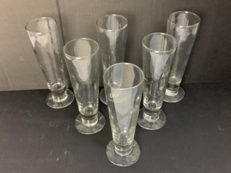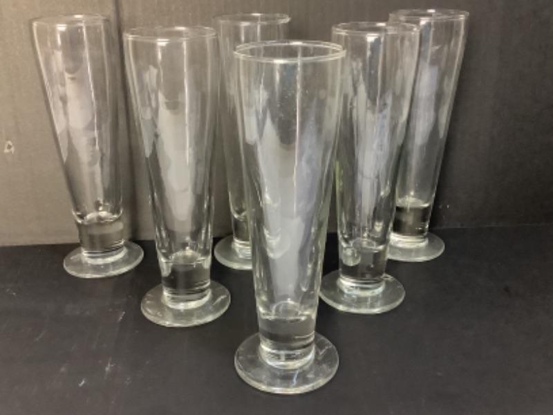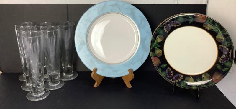 Set of 6 Pilsner beer glasses measuring 9” tall, Arcoroc France 12” charger and Ceramica Italy 11” deep dish plate measuring 11”- has a few small chips (see photos)